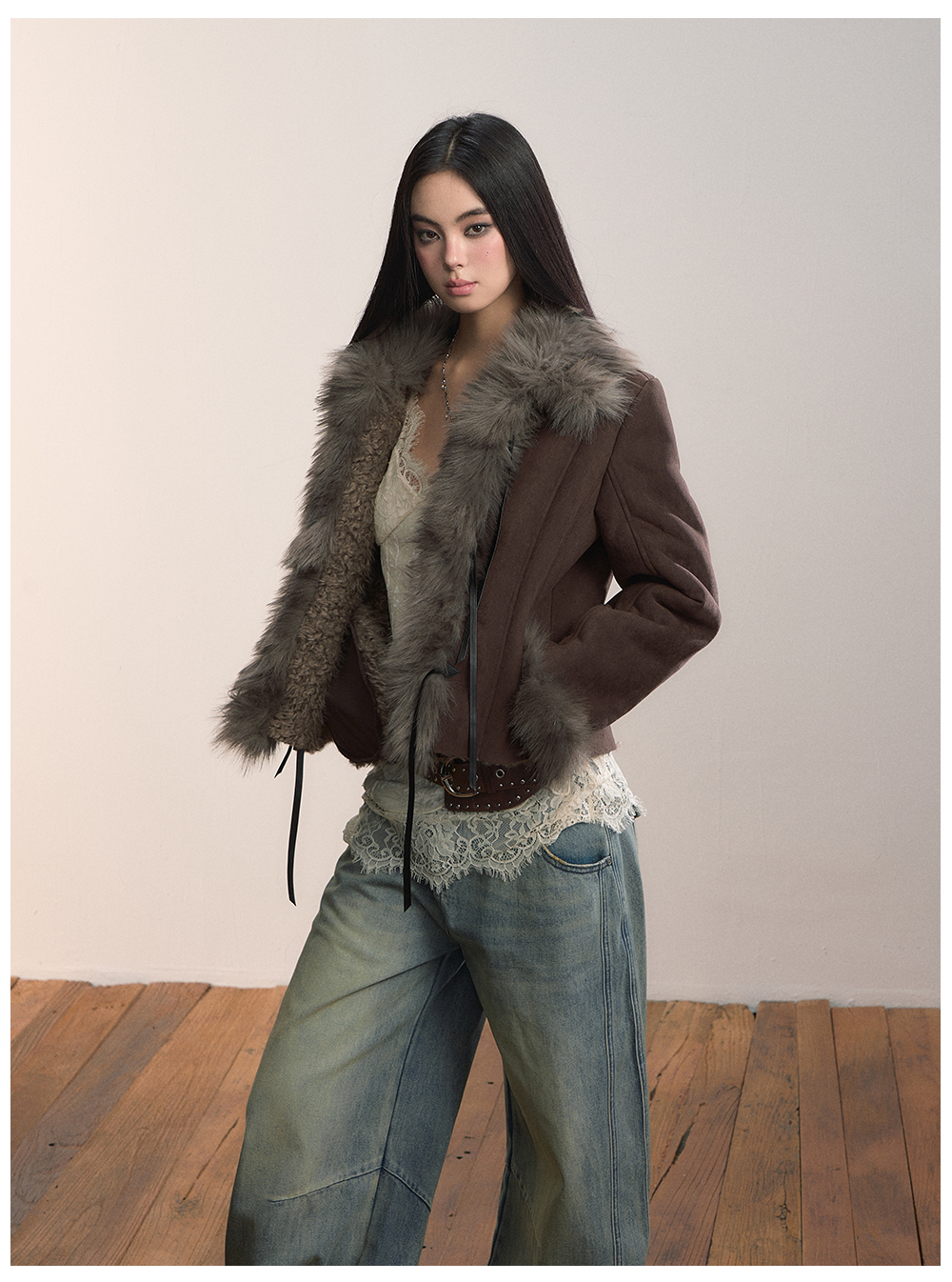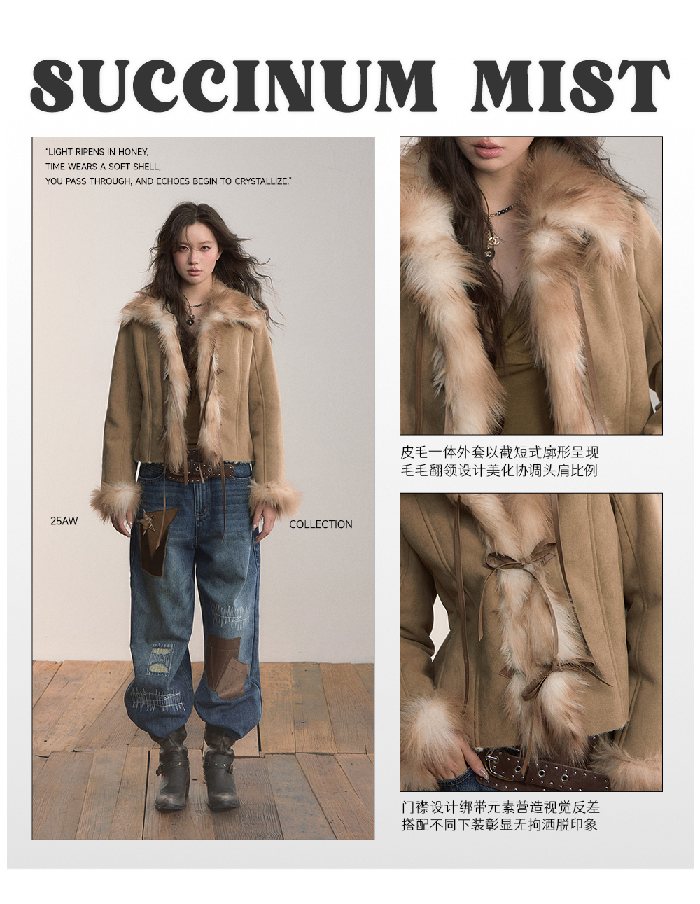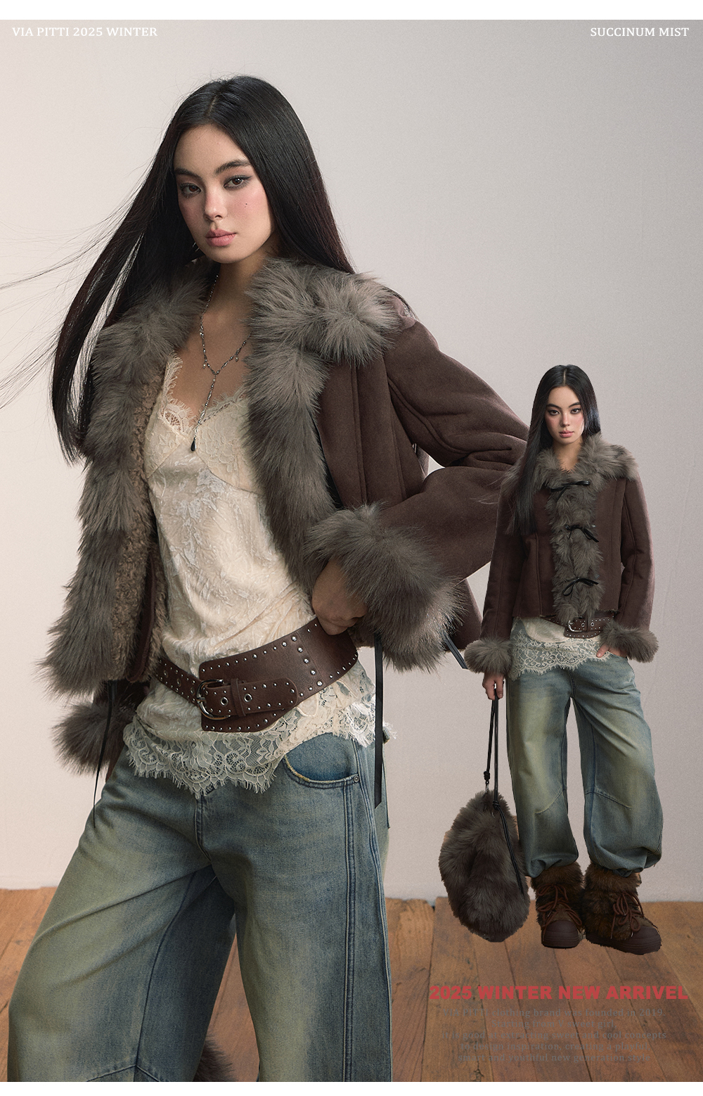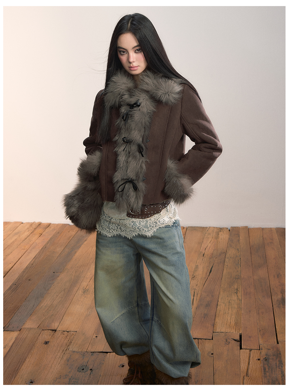 Viapitti Design-Focused Heavy-Duty Bow-Tie Faux Fur Integrated Coat for Women, Autumn and Winter Large Fur Collar Top