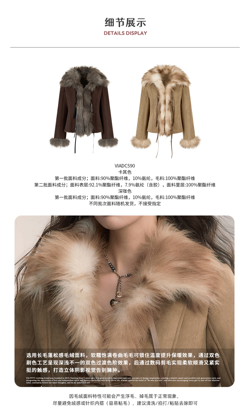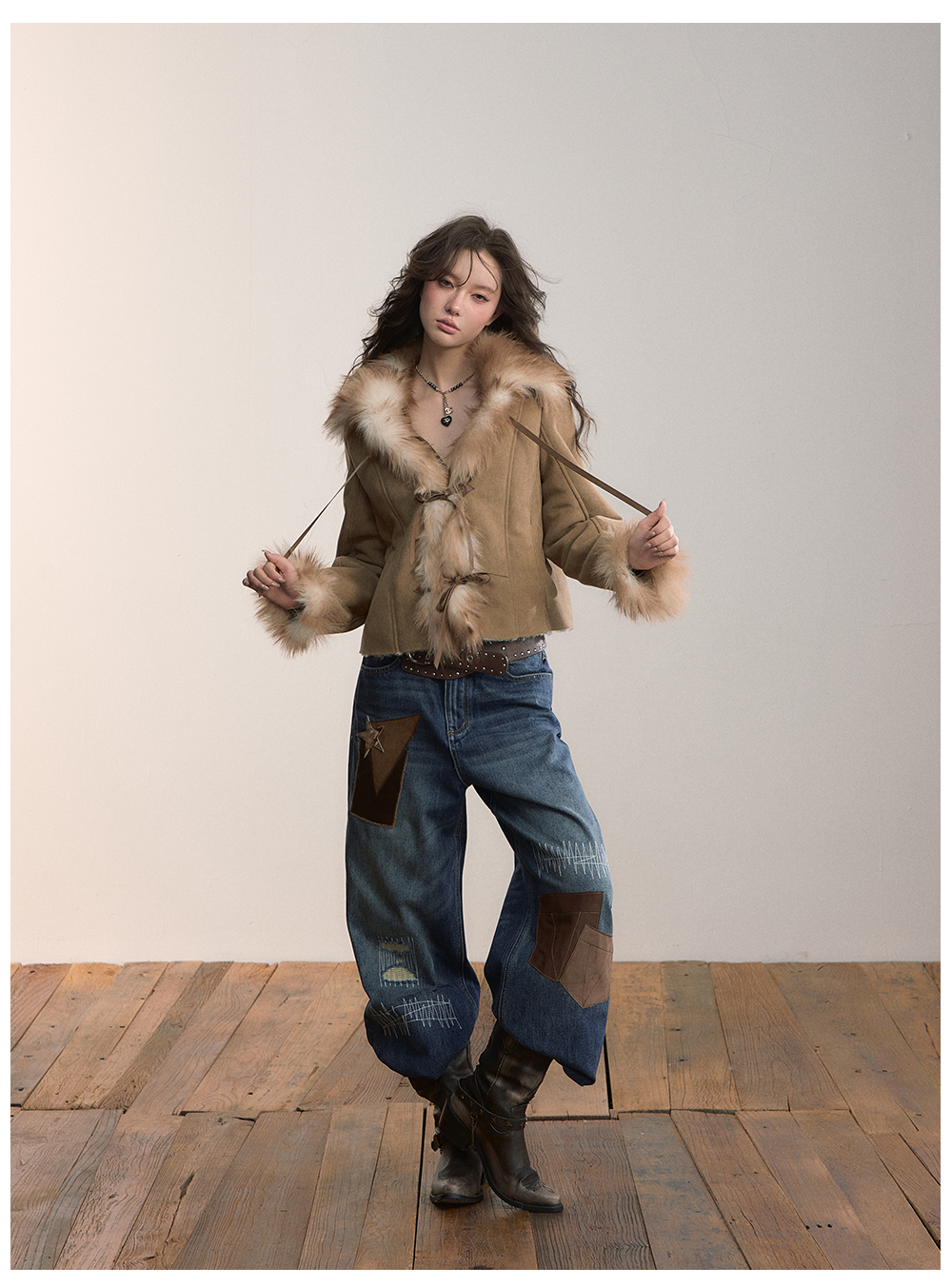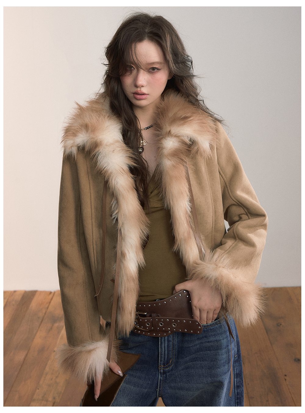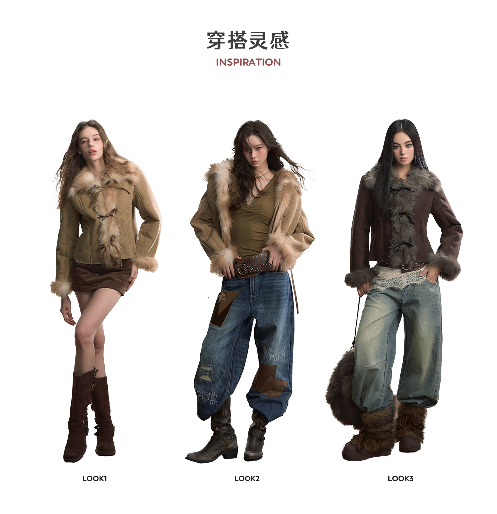 Viapitti Design-Focused Heavy-Duty Bow-Tie Faux Fur Integrated Coat for Women, Autumn and Winter Large Fur Collar Top