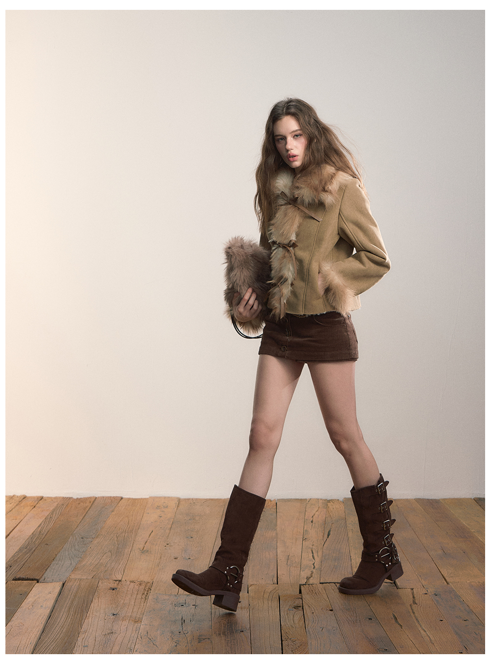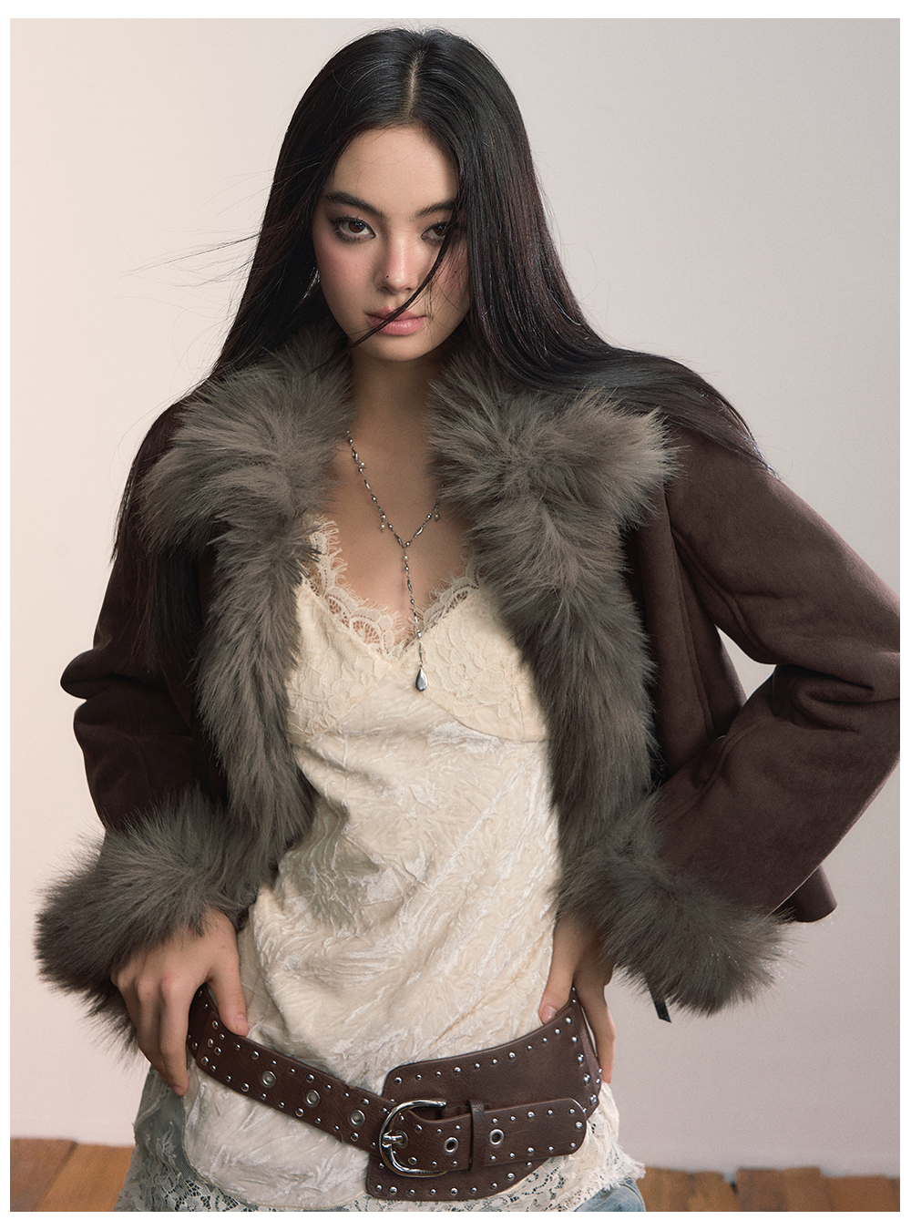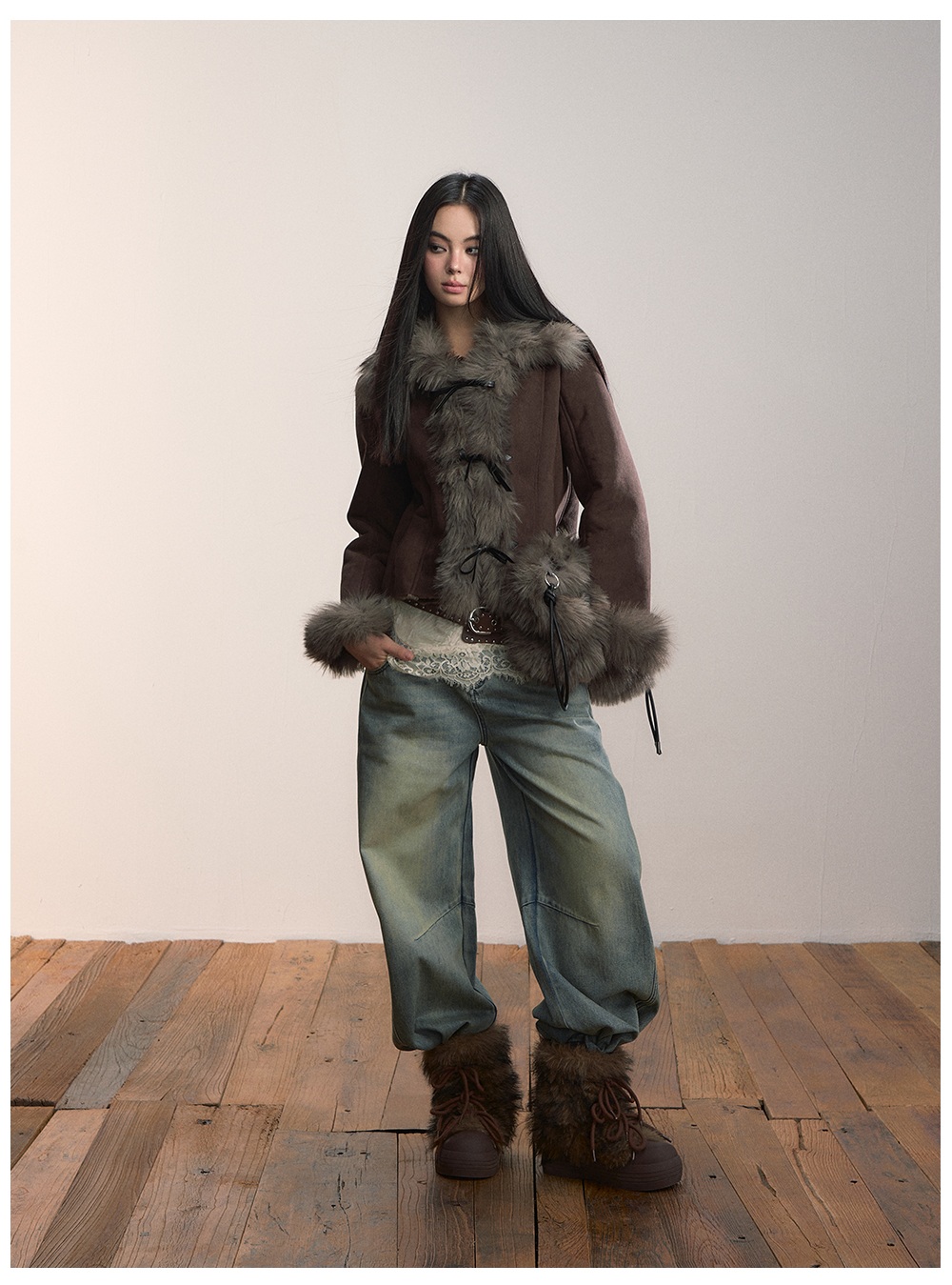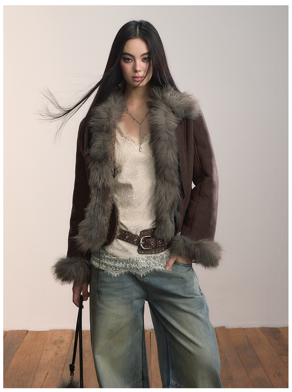 Viapitti Design-Focused Heavy-Duty Bow-Tie Faux Fur Integrated Coat for Women, Autumn and Winter Large Fur Collar Top