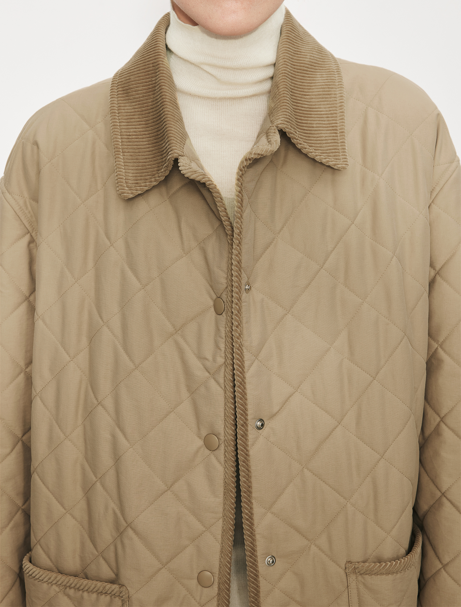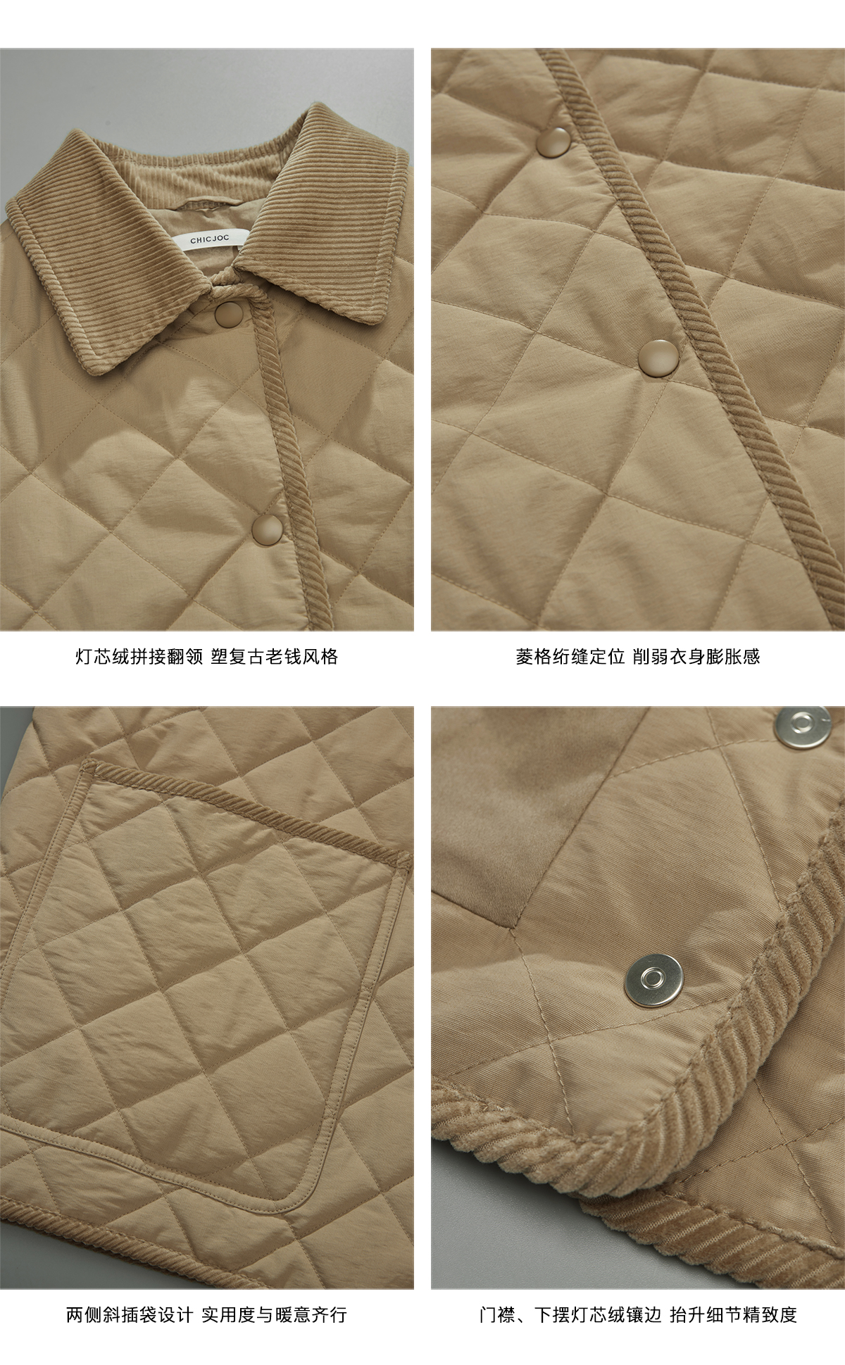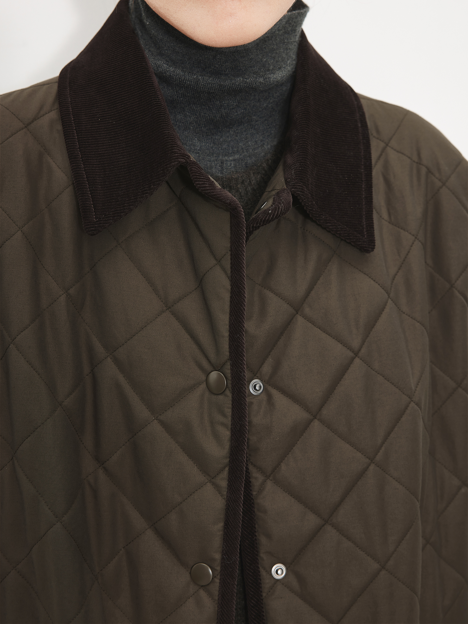 Chicjoc Italian-Style Micro-Crepe Long-Staple Cotton + Corduroy Collar Trim Barn Style Quilted Bias-Cut Jacket Cotton Coat
