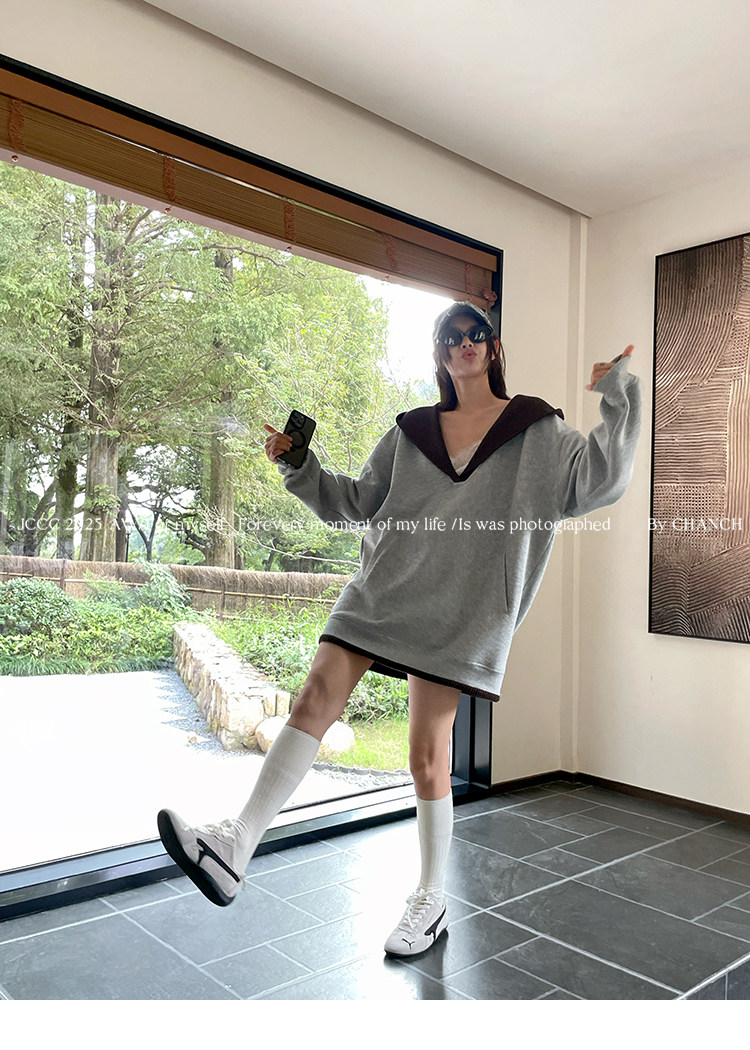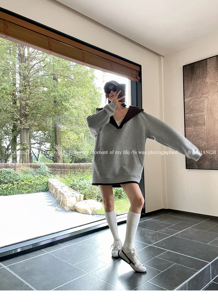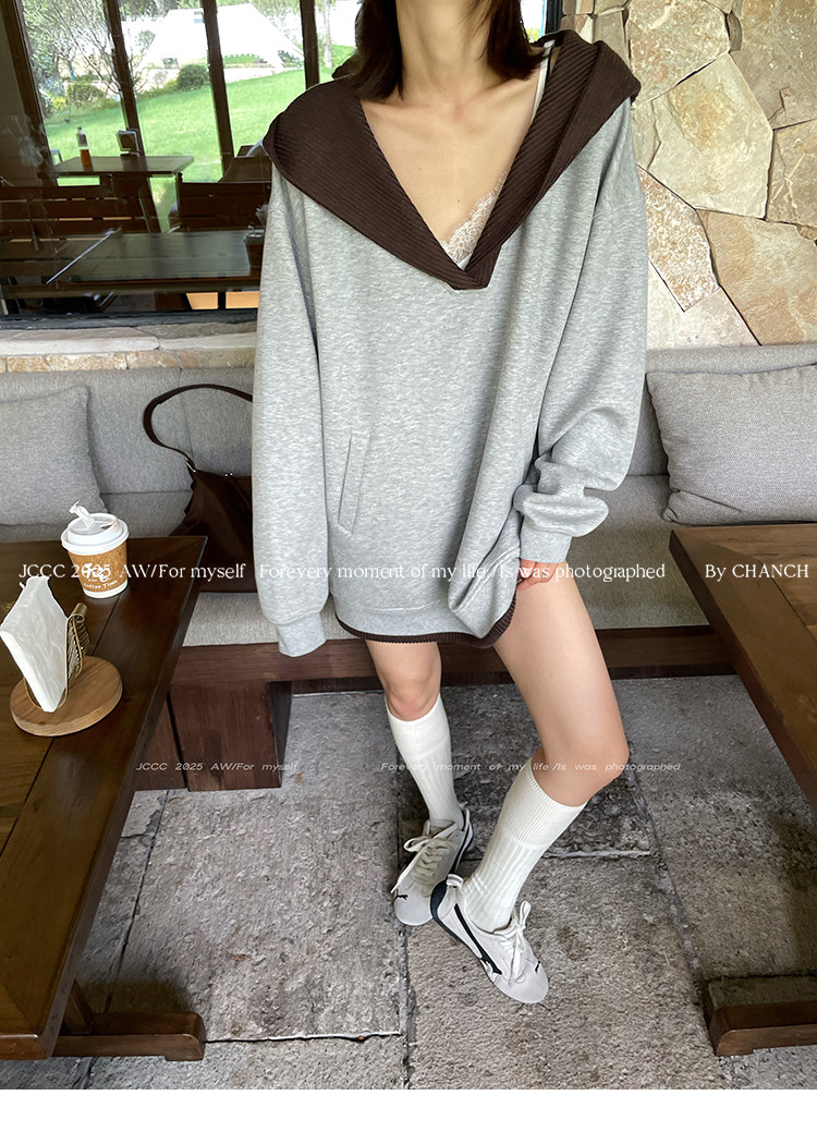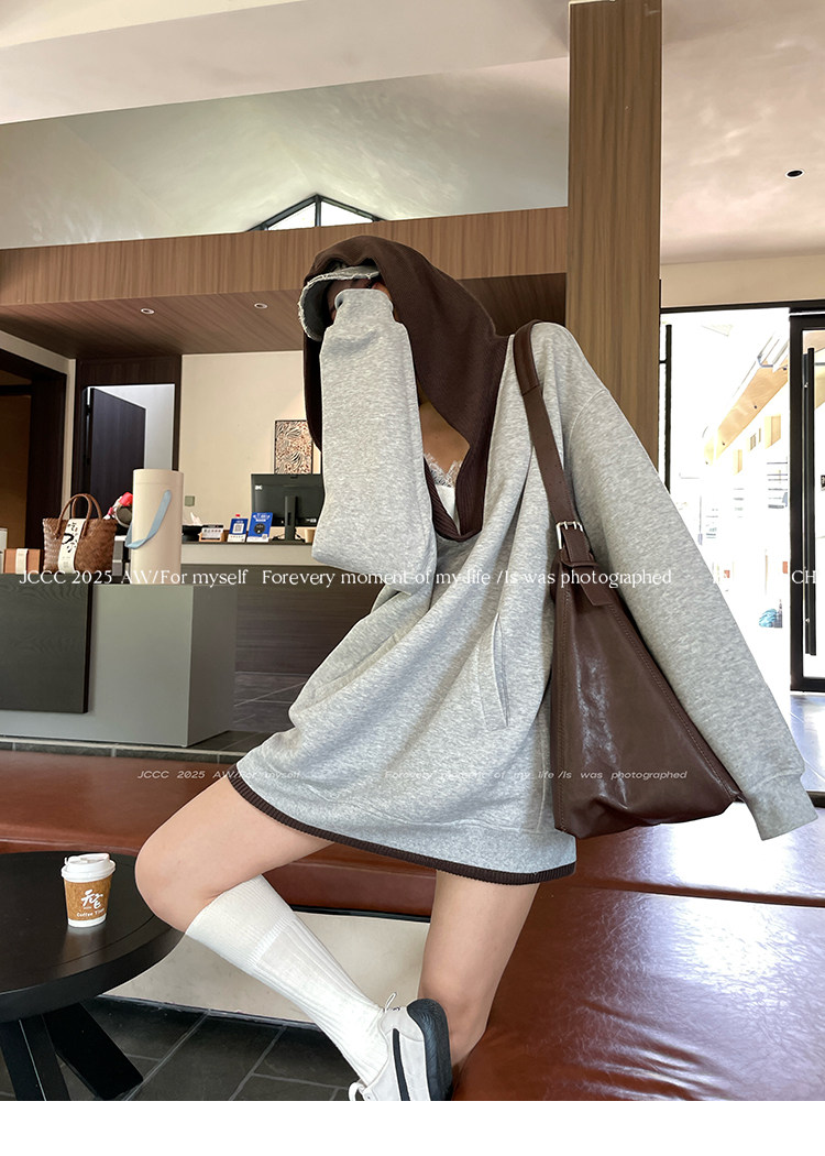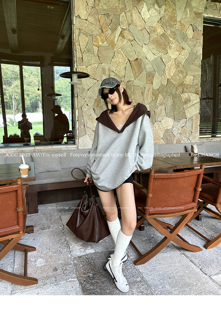 Jccc Shadow [Gray Coffee Shadow] Versatile Gray V-Neck Knitted Patchwork Fake Two-Piece Hooded Pullover Sweatshirt