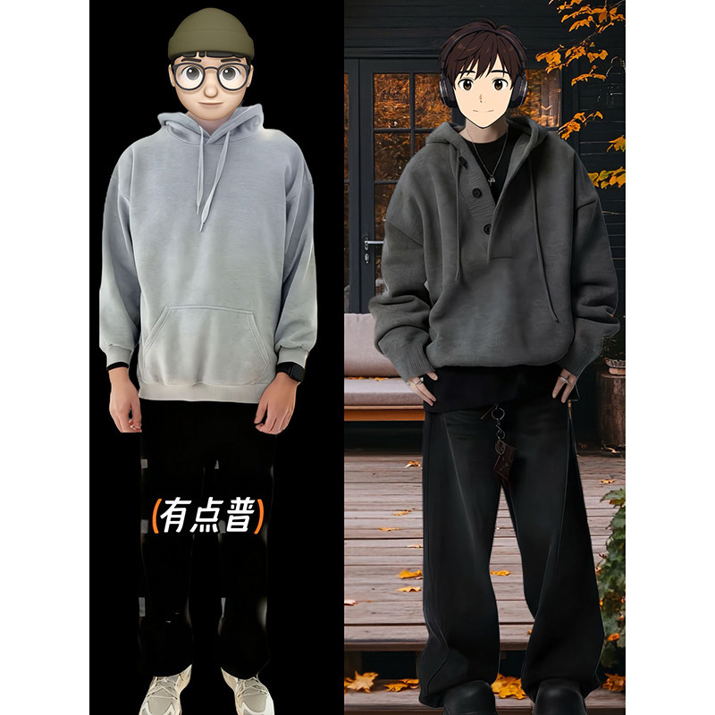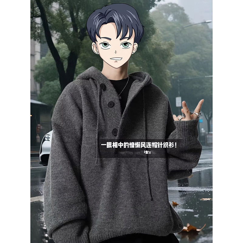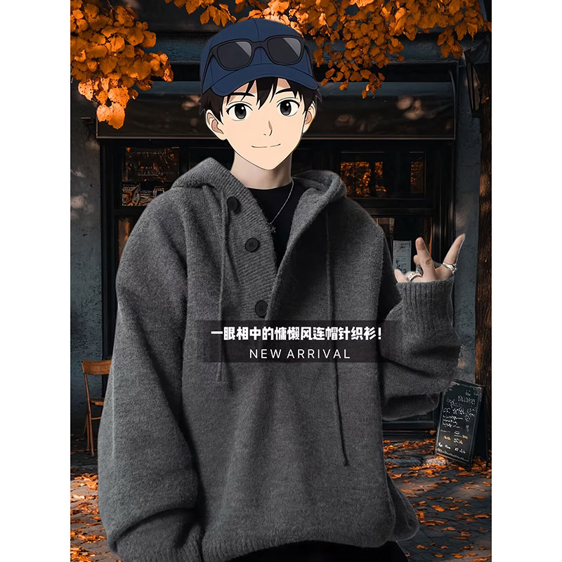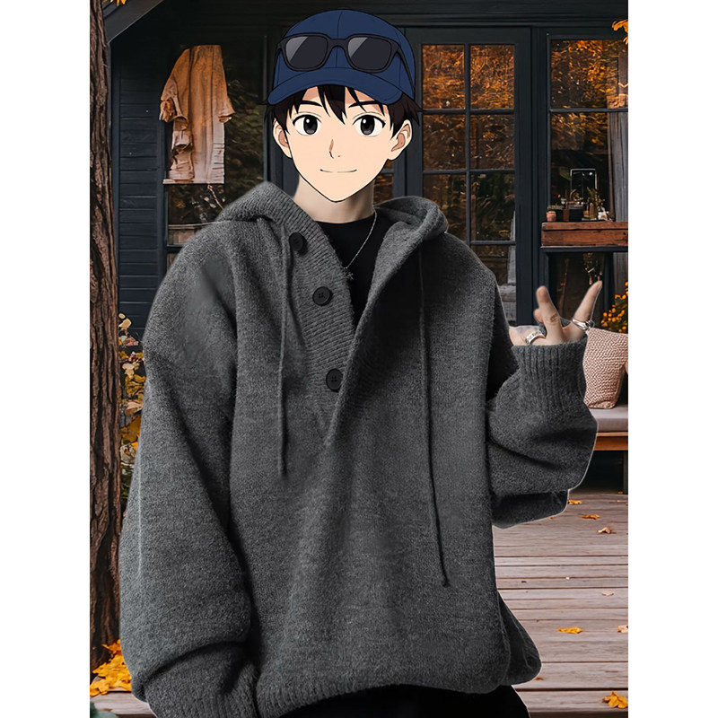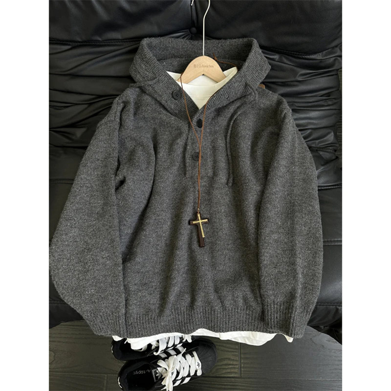 Dark Gray Lazy Style Hooded Sweater for Men, Autumn and Winter, High-End Thickened American Cleanfit Knit Sweatshirt