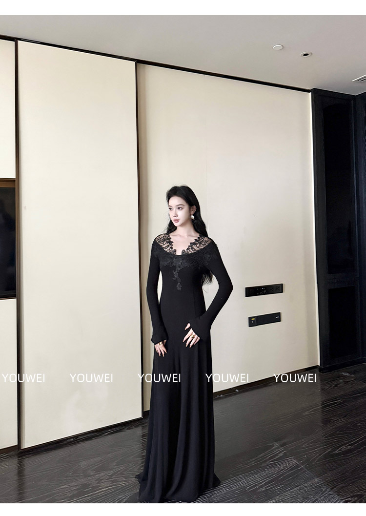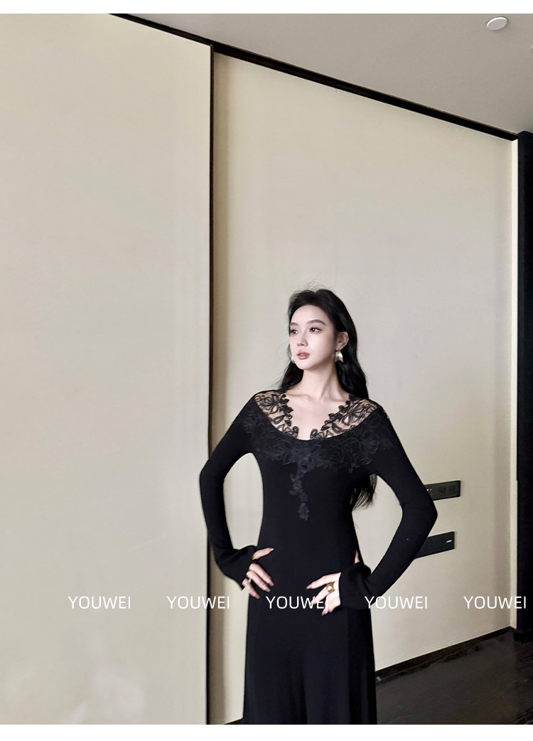Youwei Banquet Autumn and Winter Dress for Women 2025 New Winter Base Layer Knitted Lace Long Dress