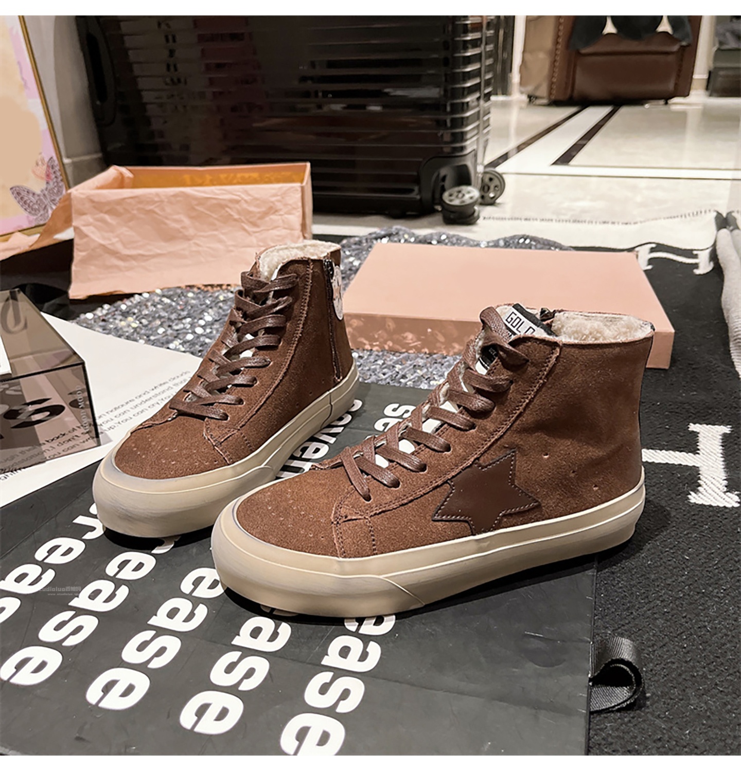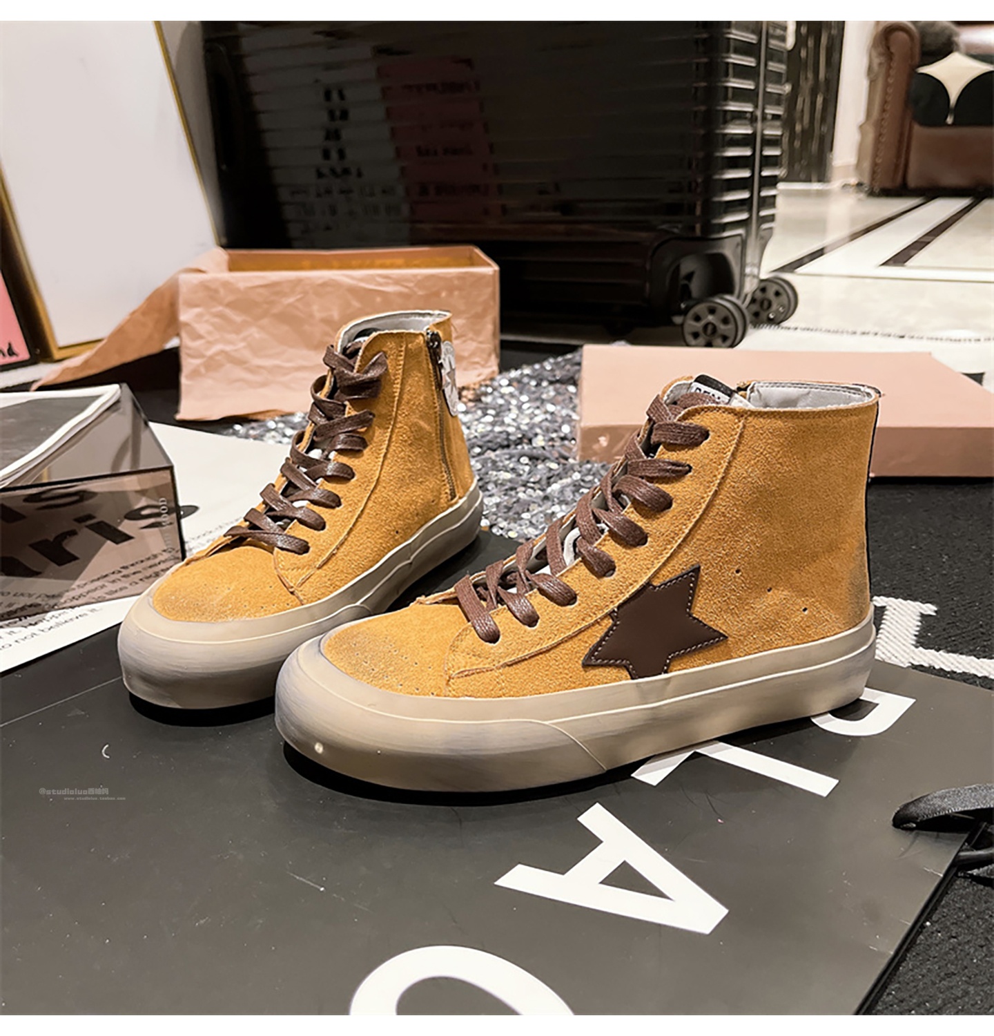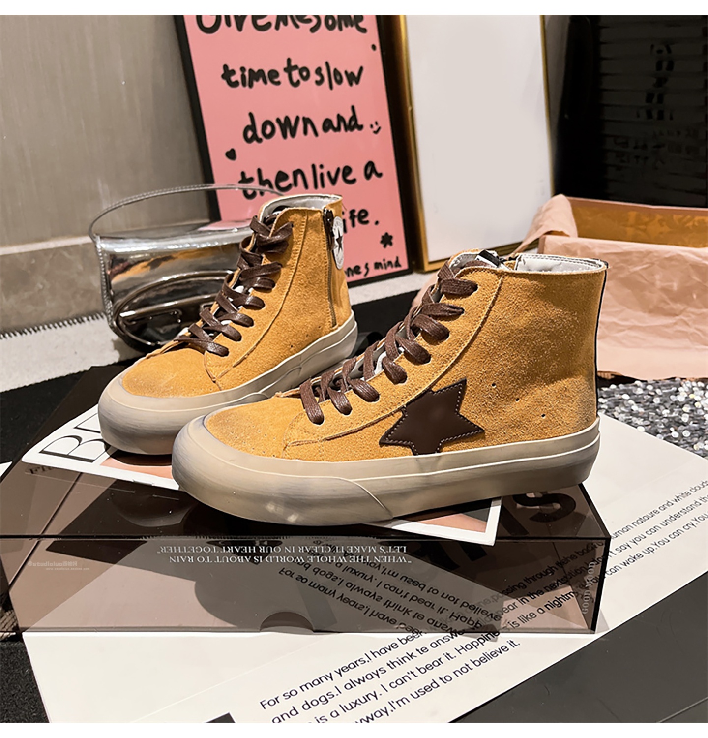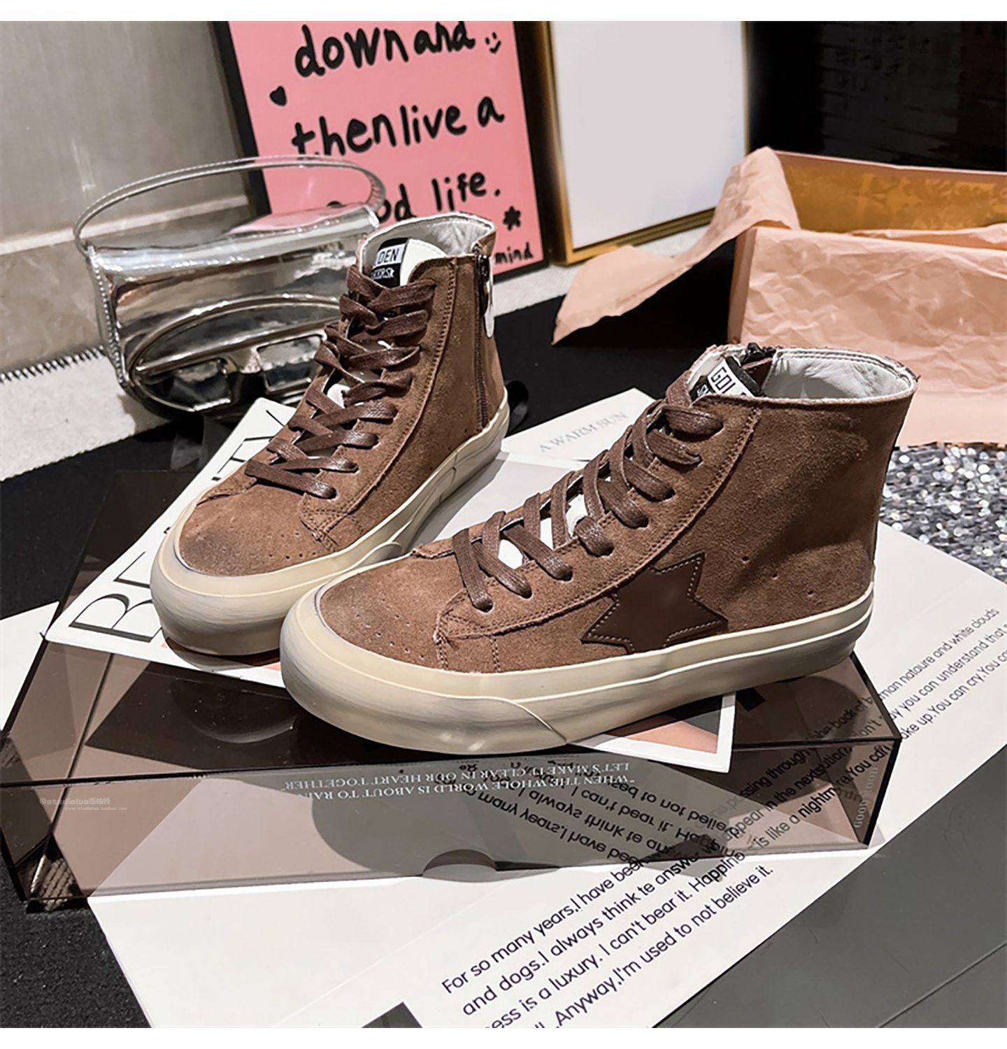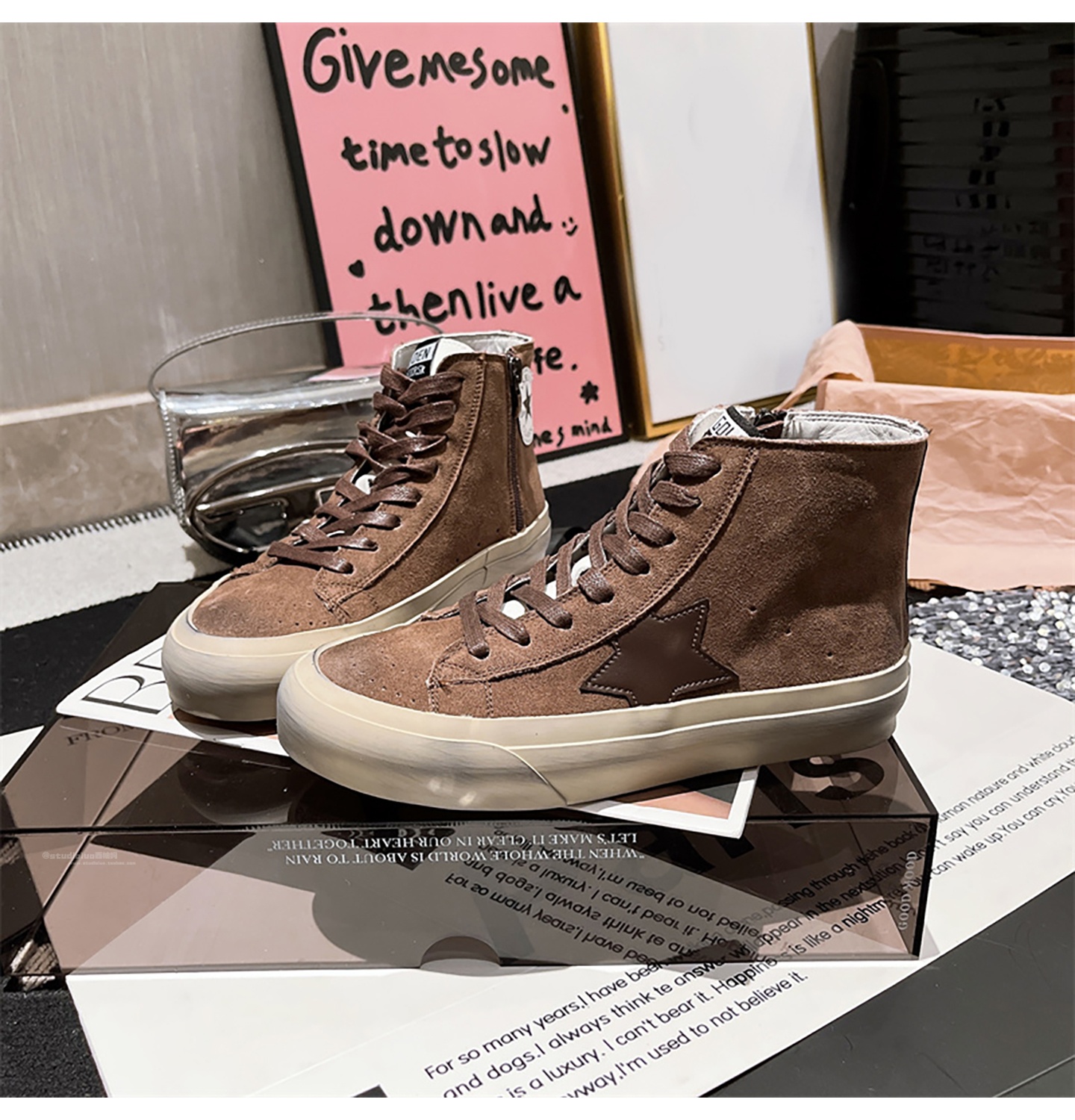 Hong Kong Retro Style Genuine Leather Lace-Up Casual High-Top Shoes for Women 2025 Autumn and Winter New Star Distressed Fleece-Lined Dirty Shoes