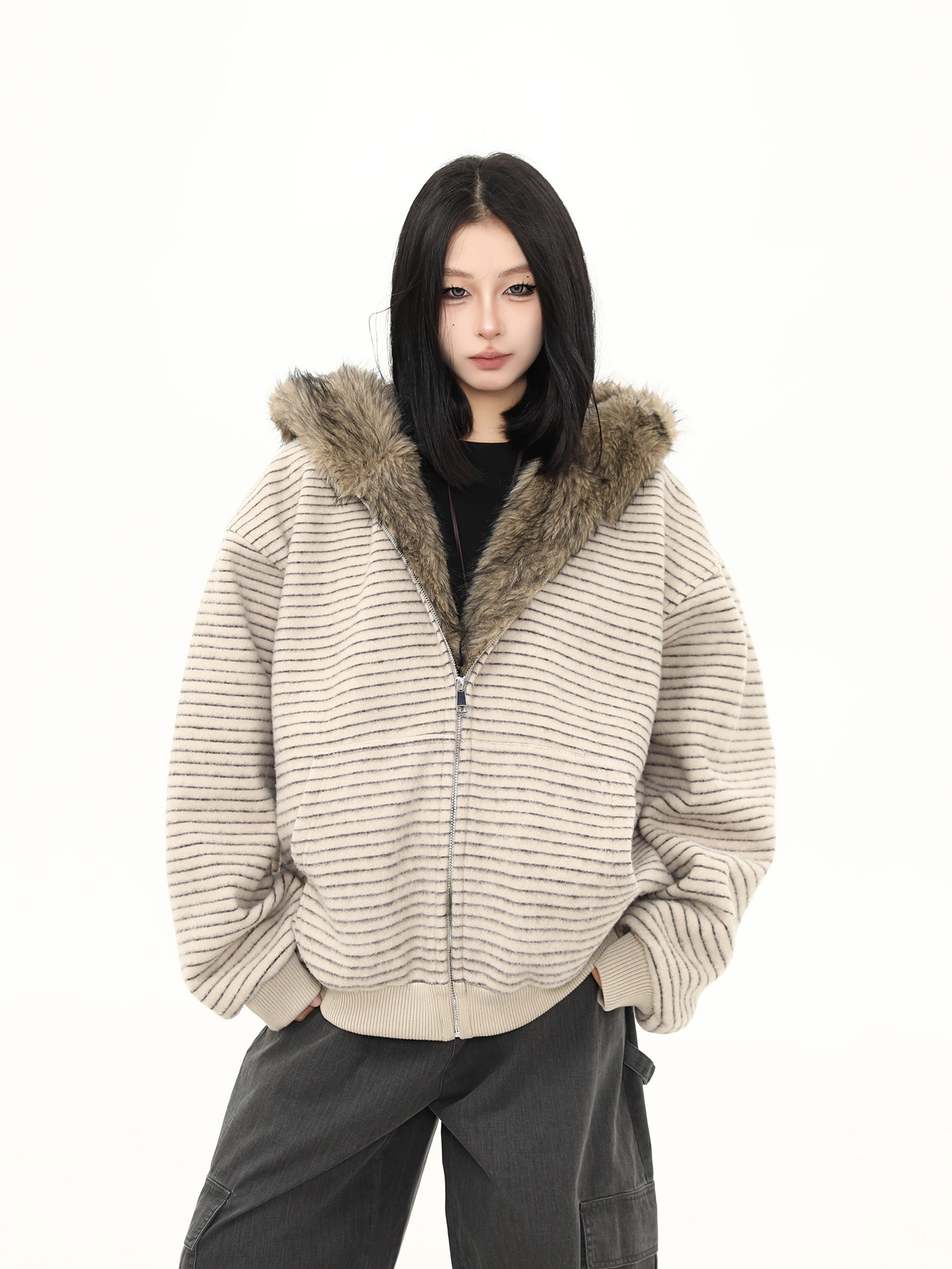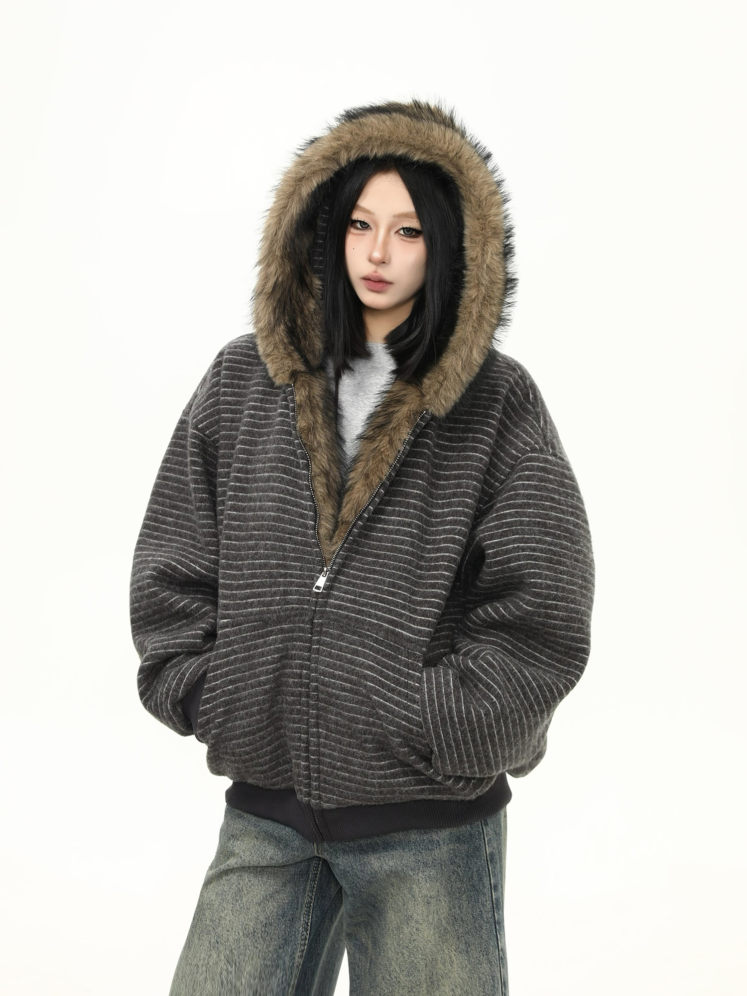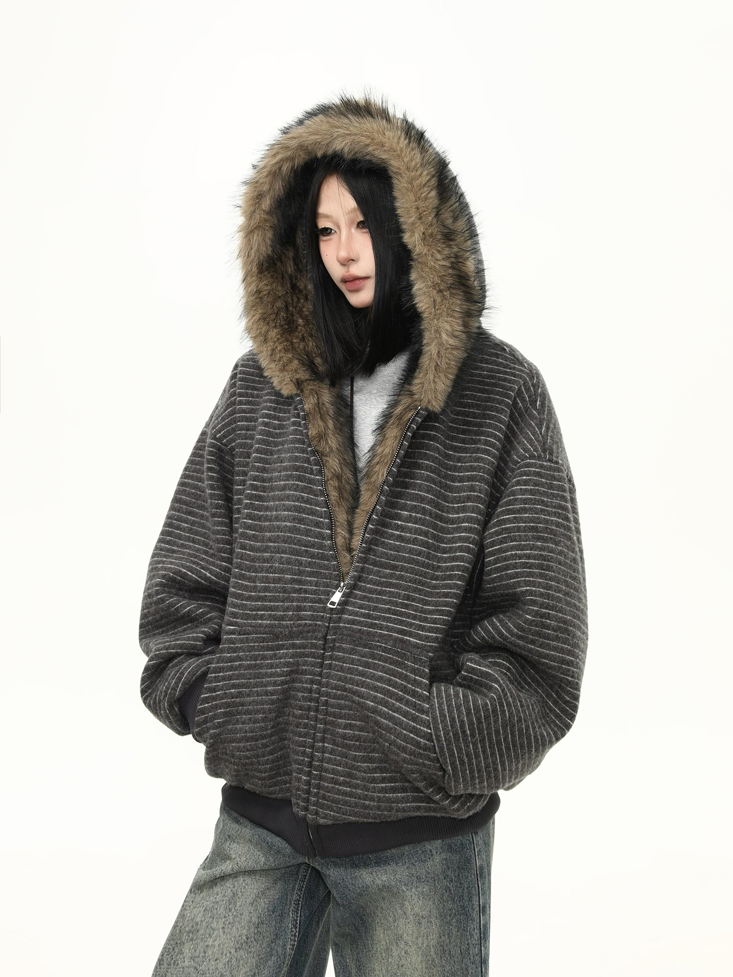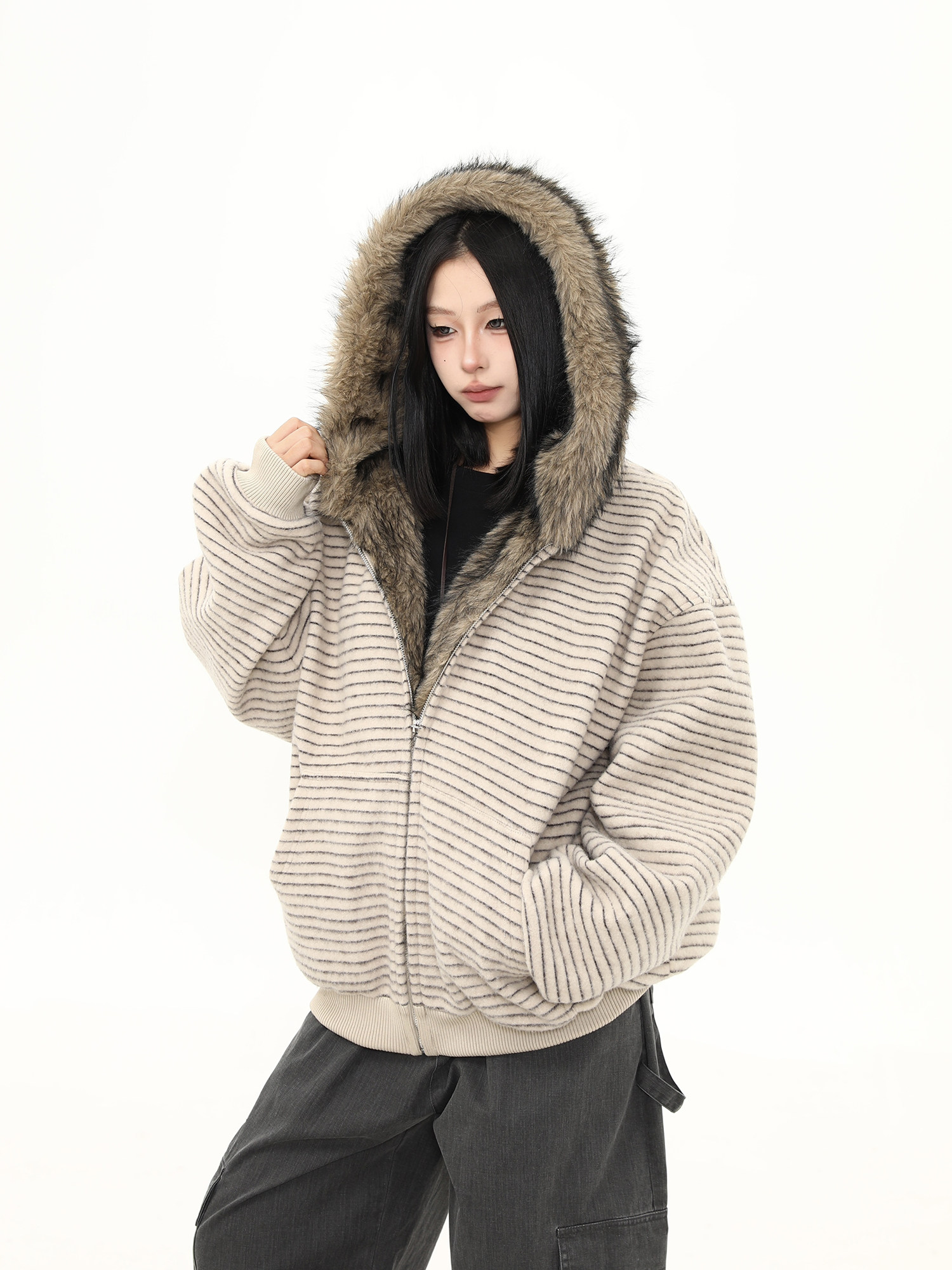 Wild Azi Winter Fleece-Lined Striped Hooded Sweatshirt for Women, American Retro Heavy Fur Collar Cardigan, Thickened Trendy Coat