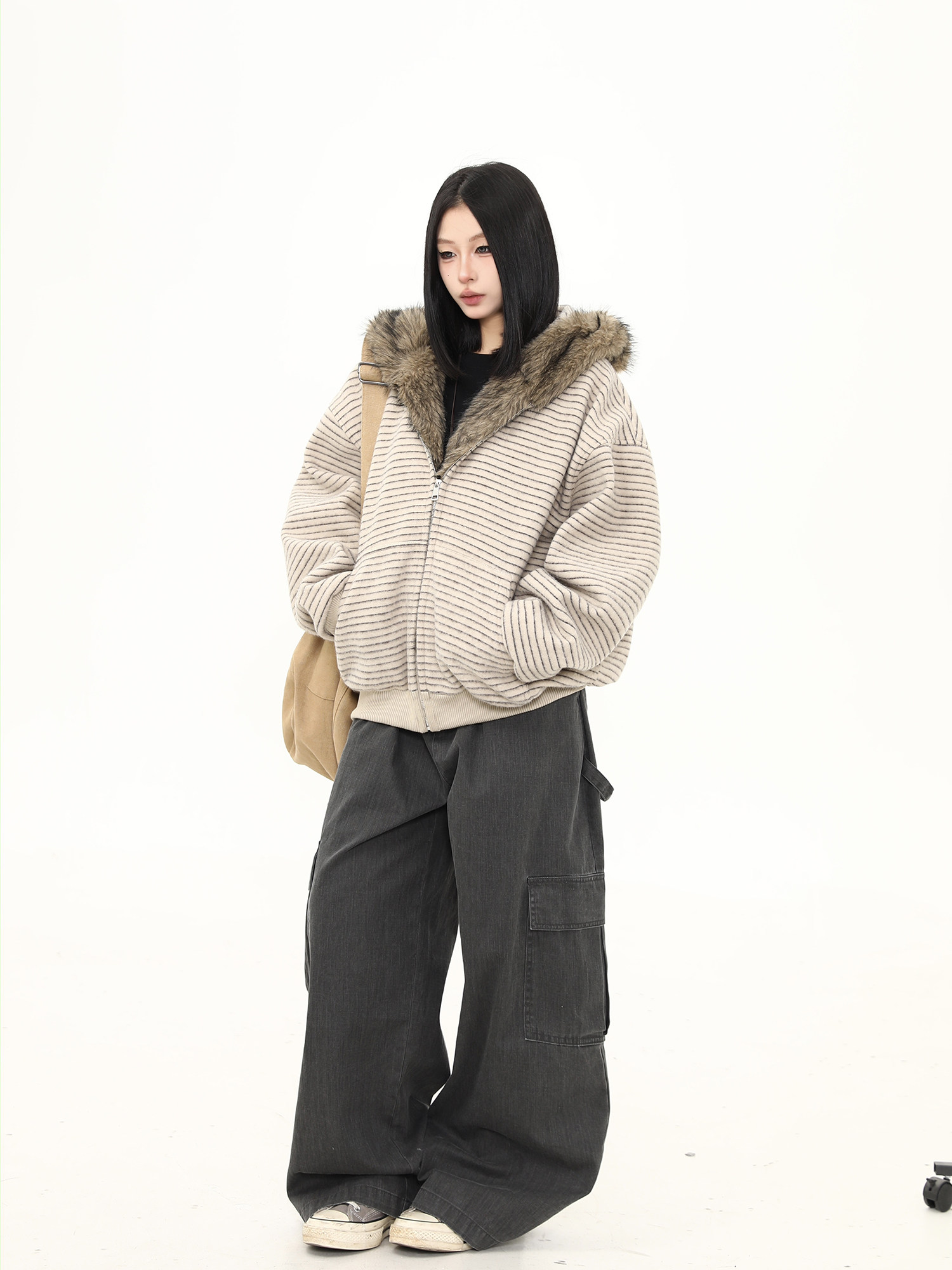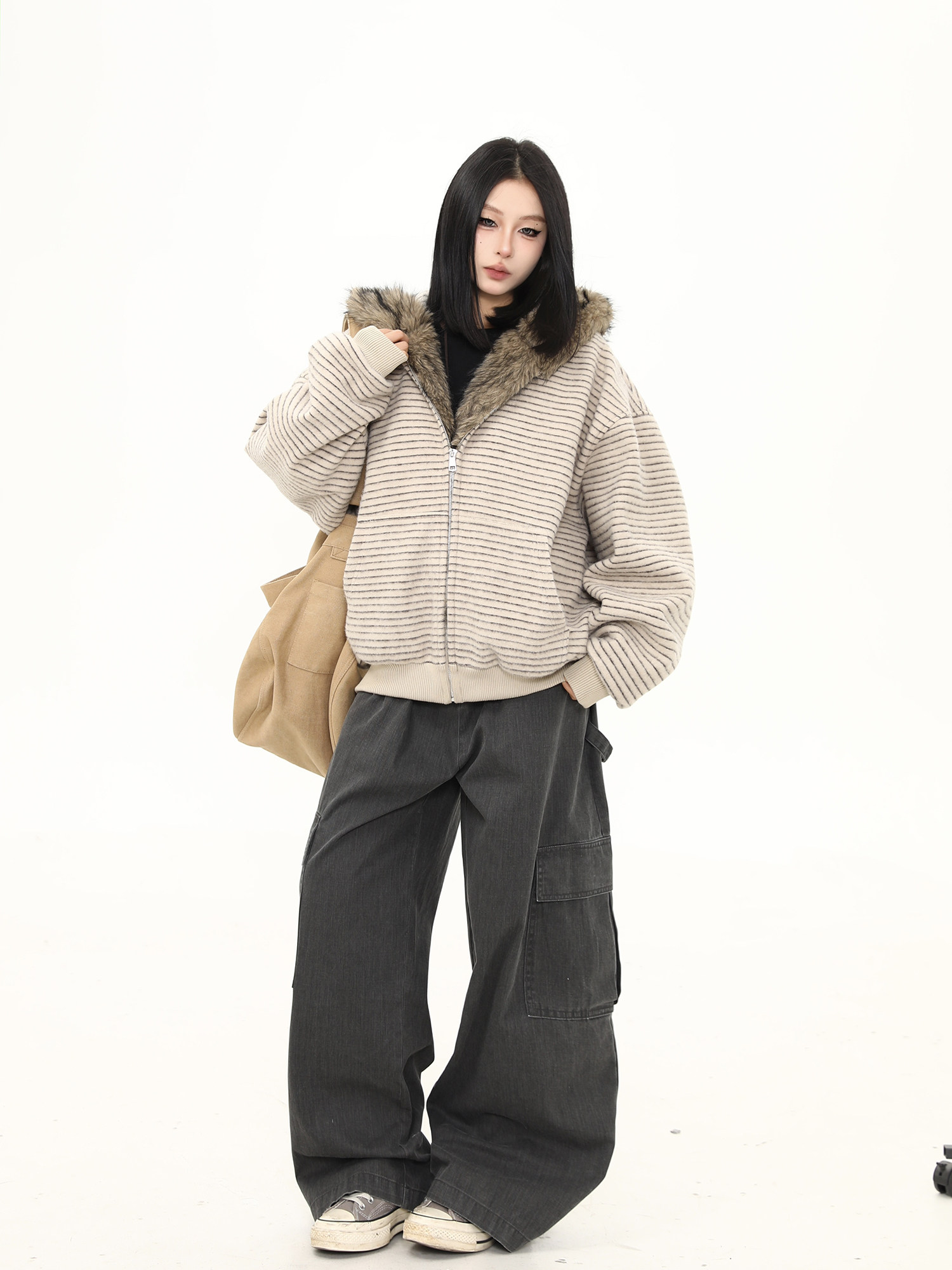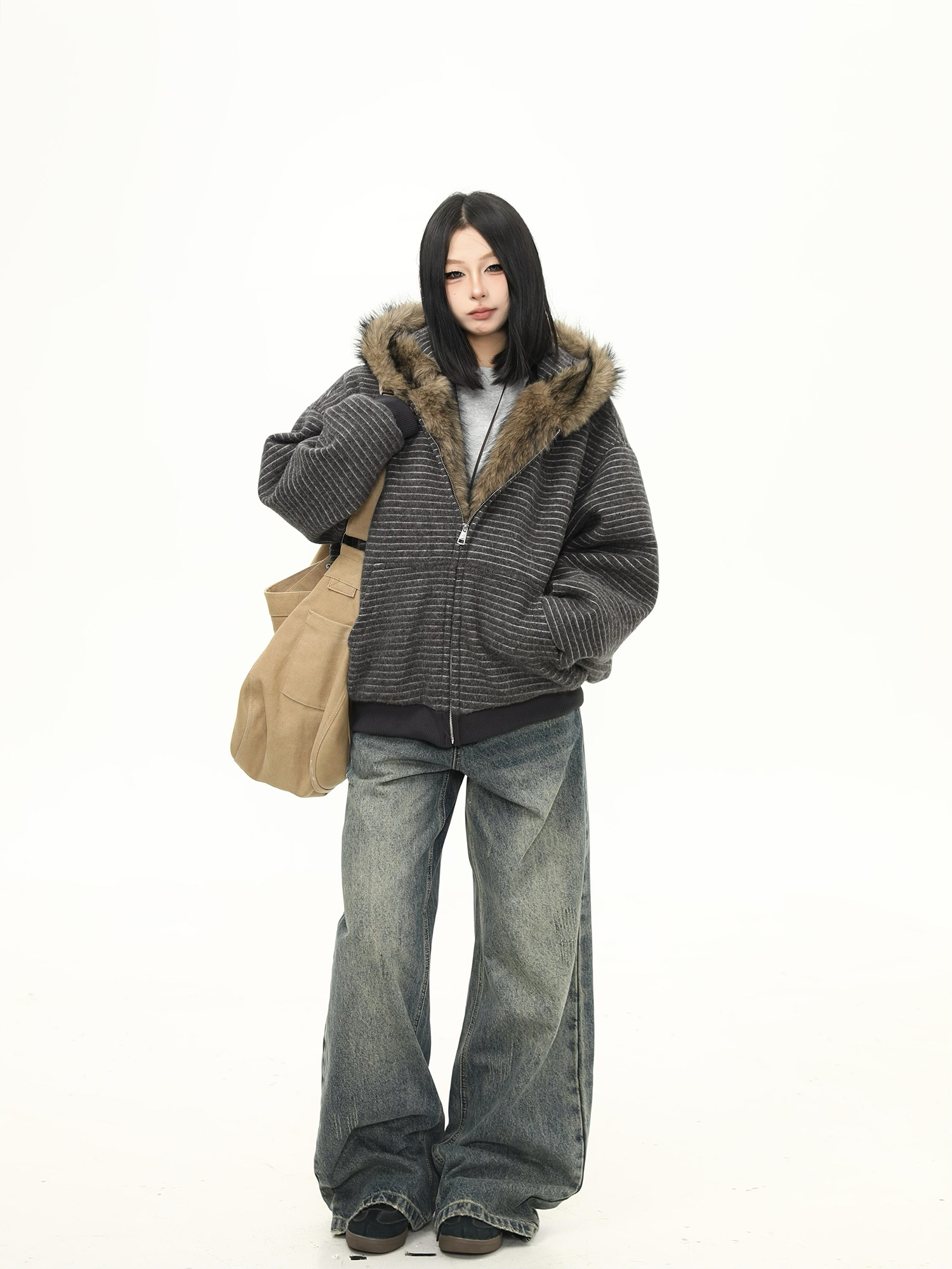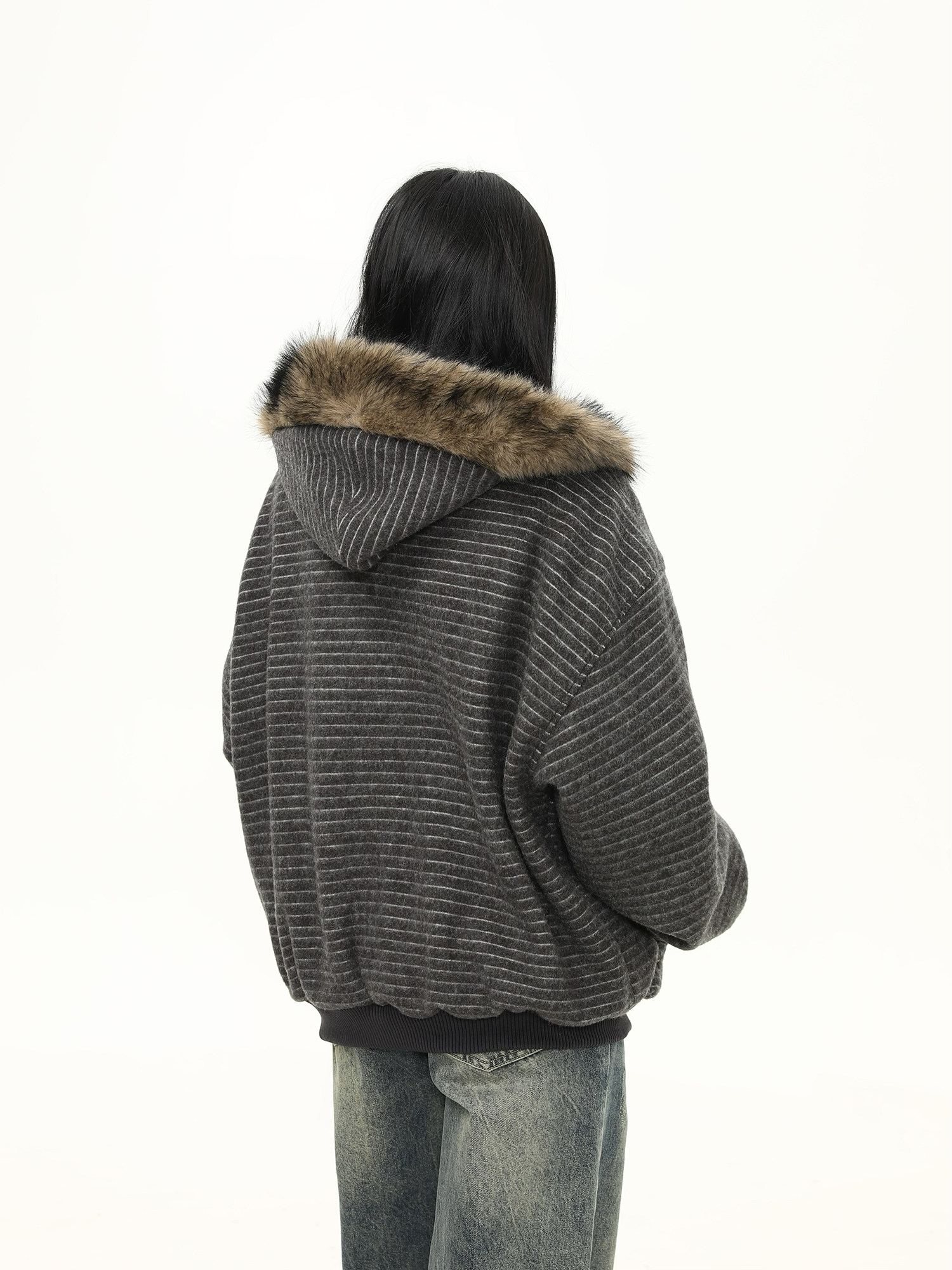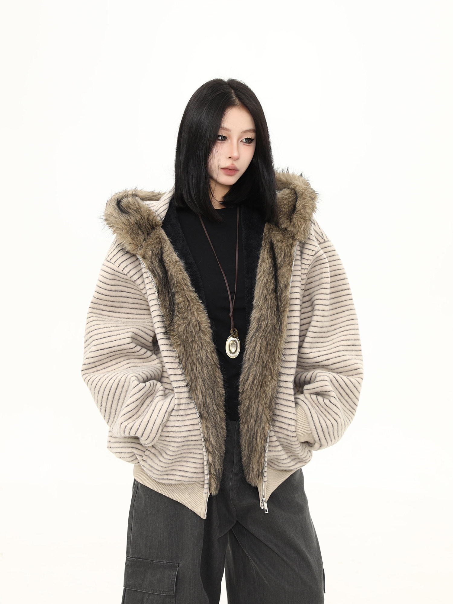 Wild Azi Winter Fleece-Lined Striped Hooded Sweatshirt for Women, American Retro Heavy Fur Collar Cardigan, Thickened Trendy Coat