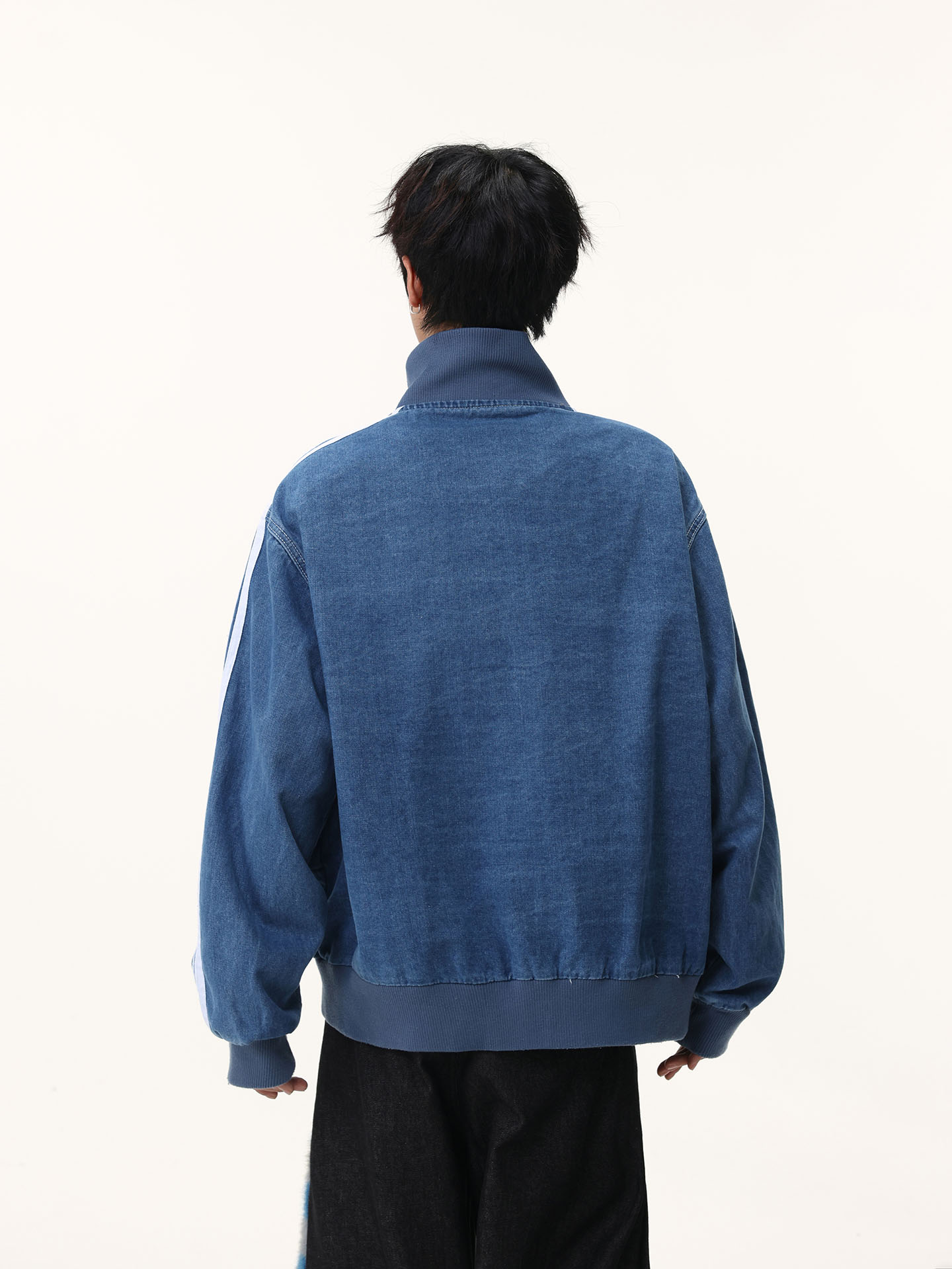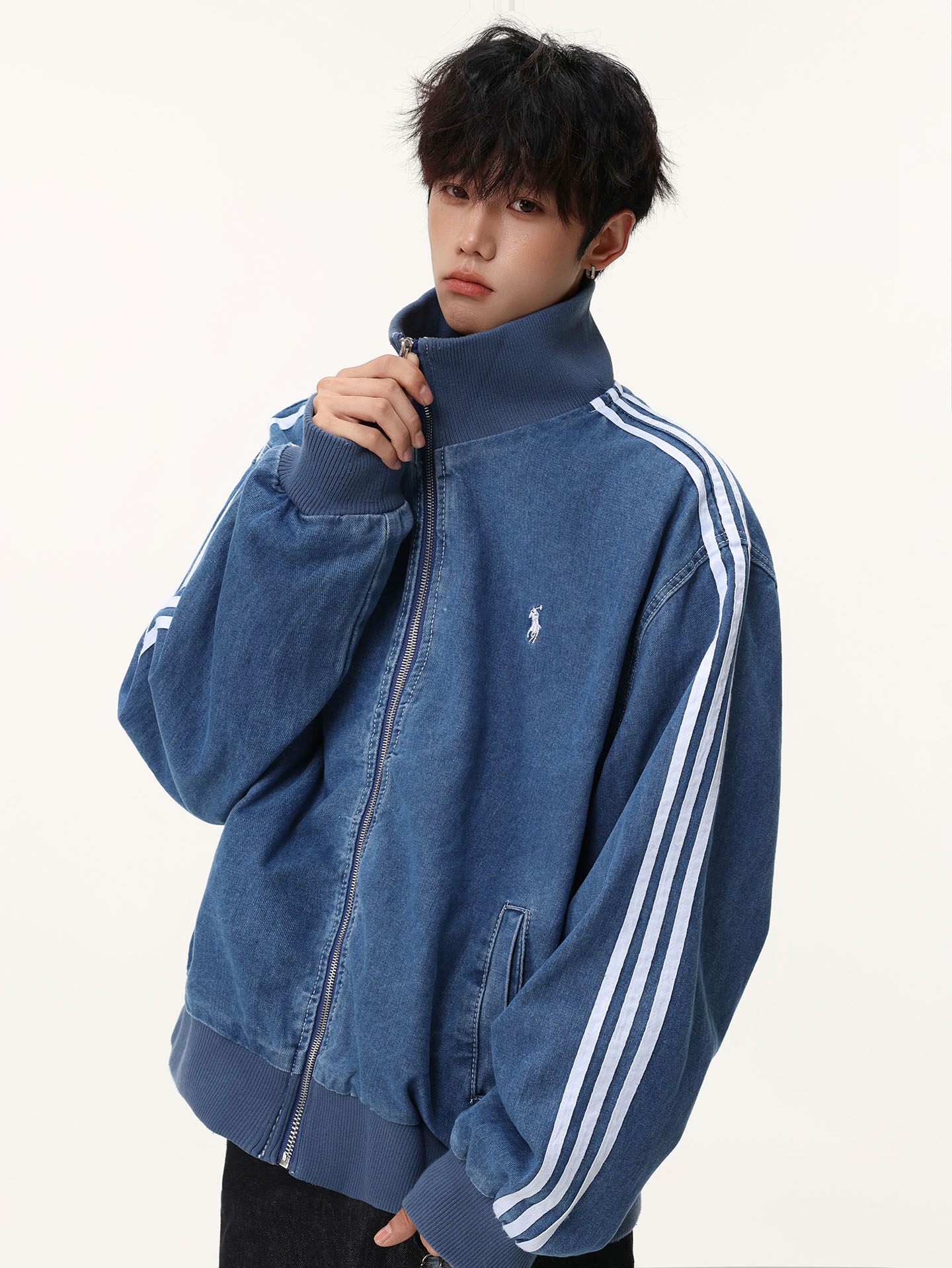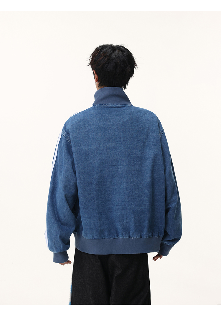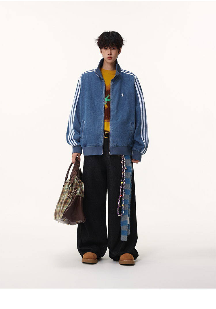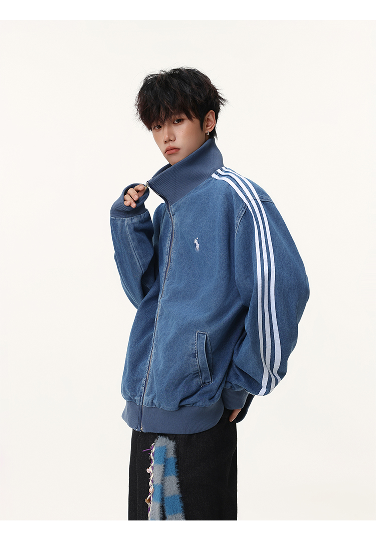 Washed Blue Three-Stripe Short Denim Jacket for Men, Spring and Autumn American Retro Striped Stand-Up Collar Sports Jacket
