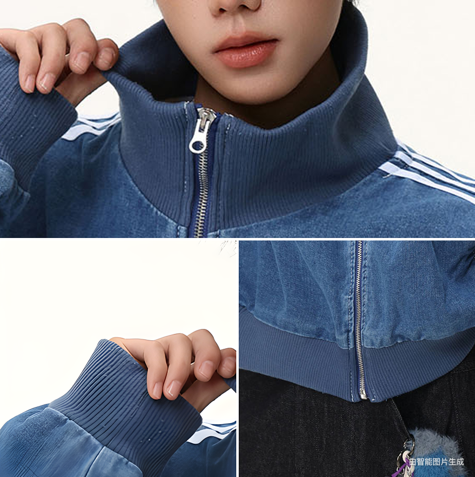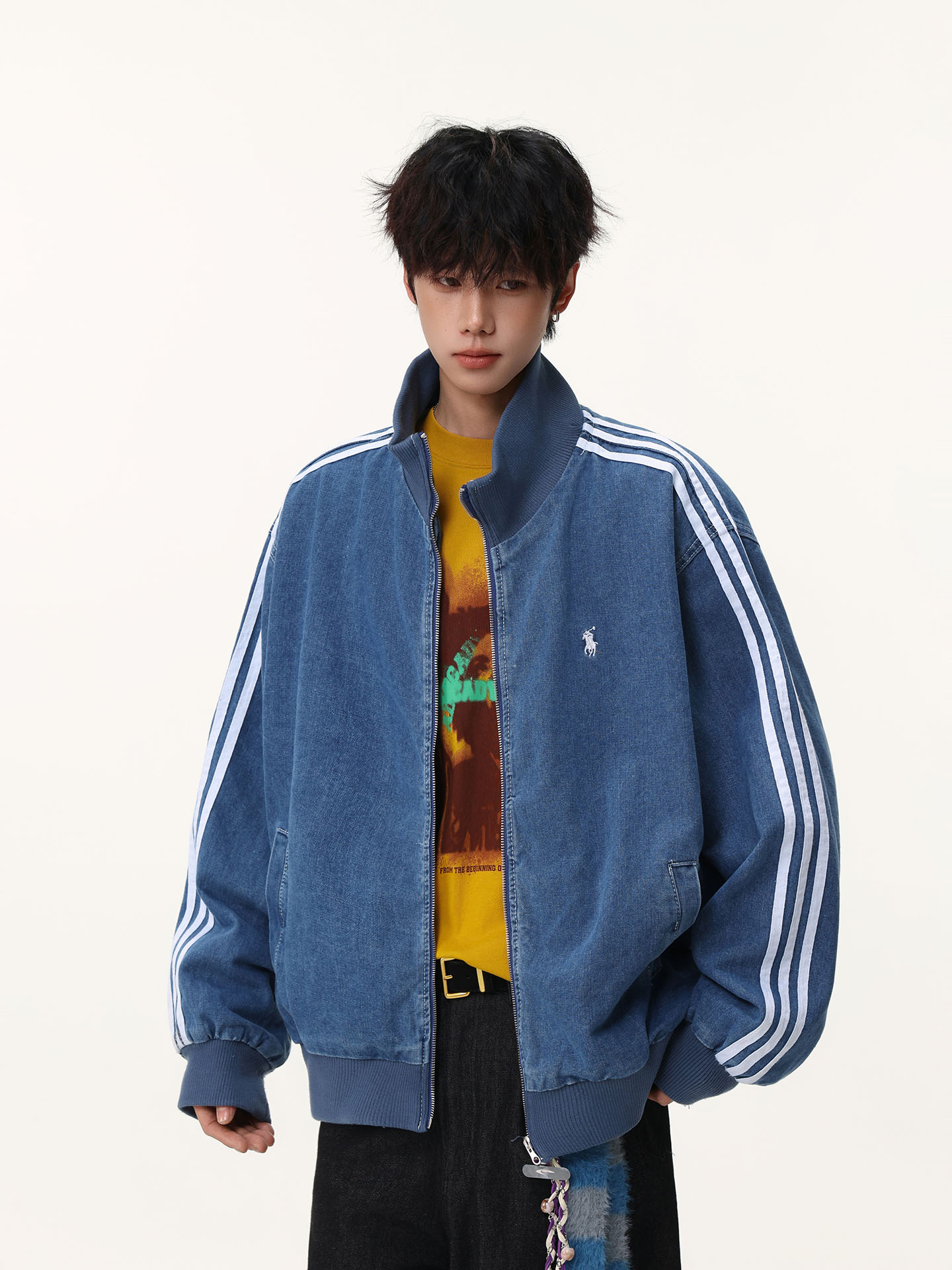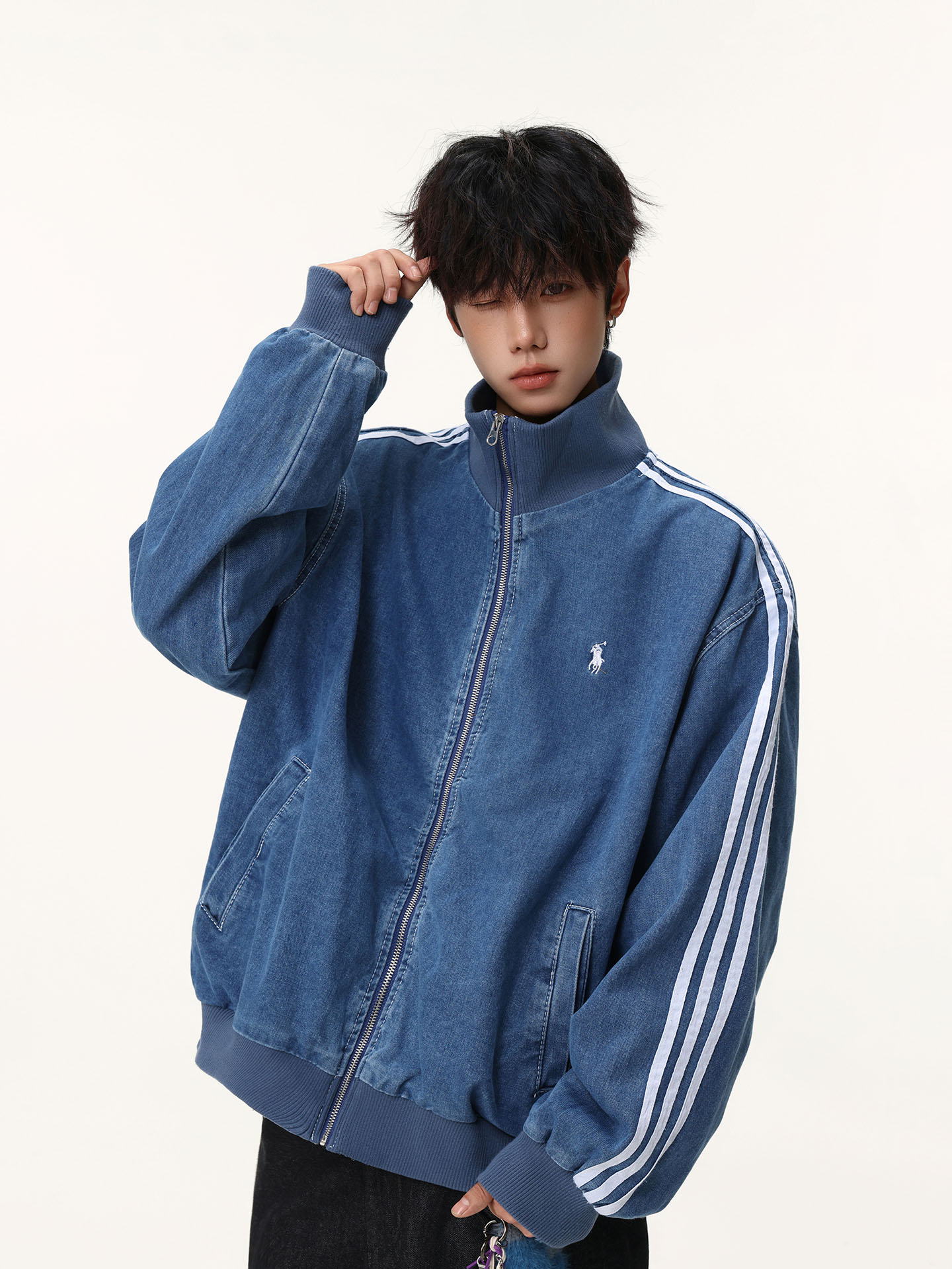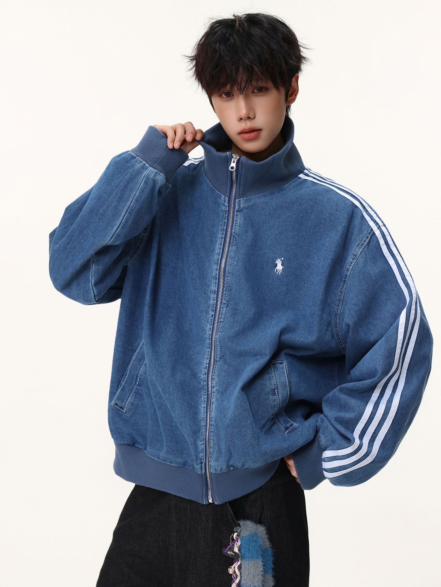 Washed Blue Three-Stripe Short Denim Jacket for Men, Spring and Autumn American Retro Striped Stand-Up Collar Sports Jacket