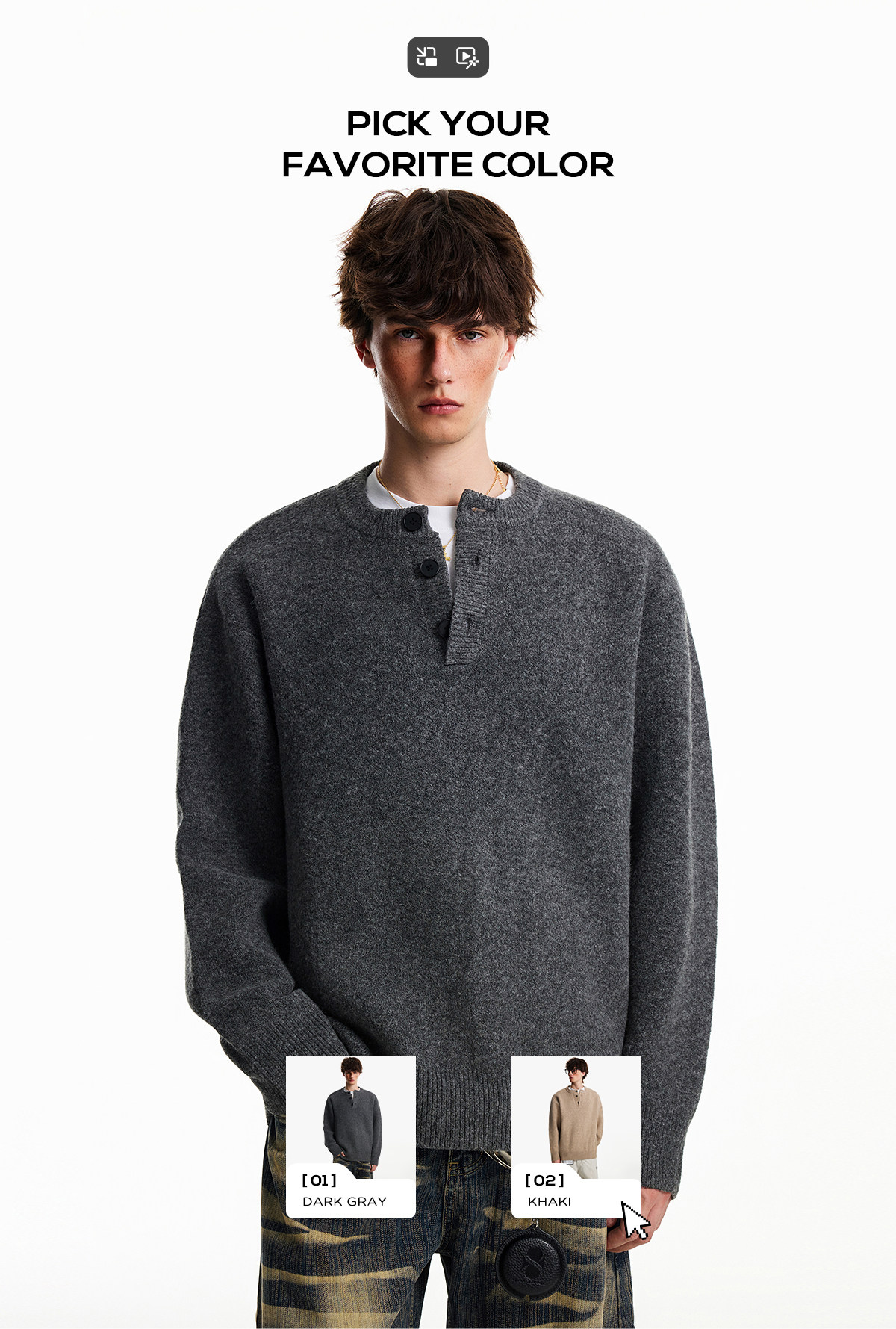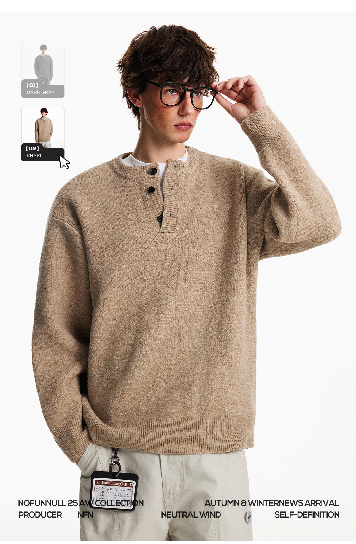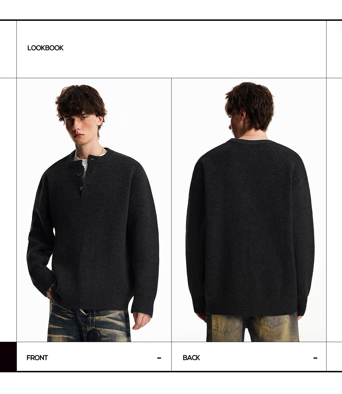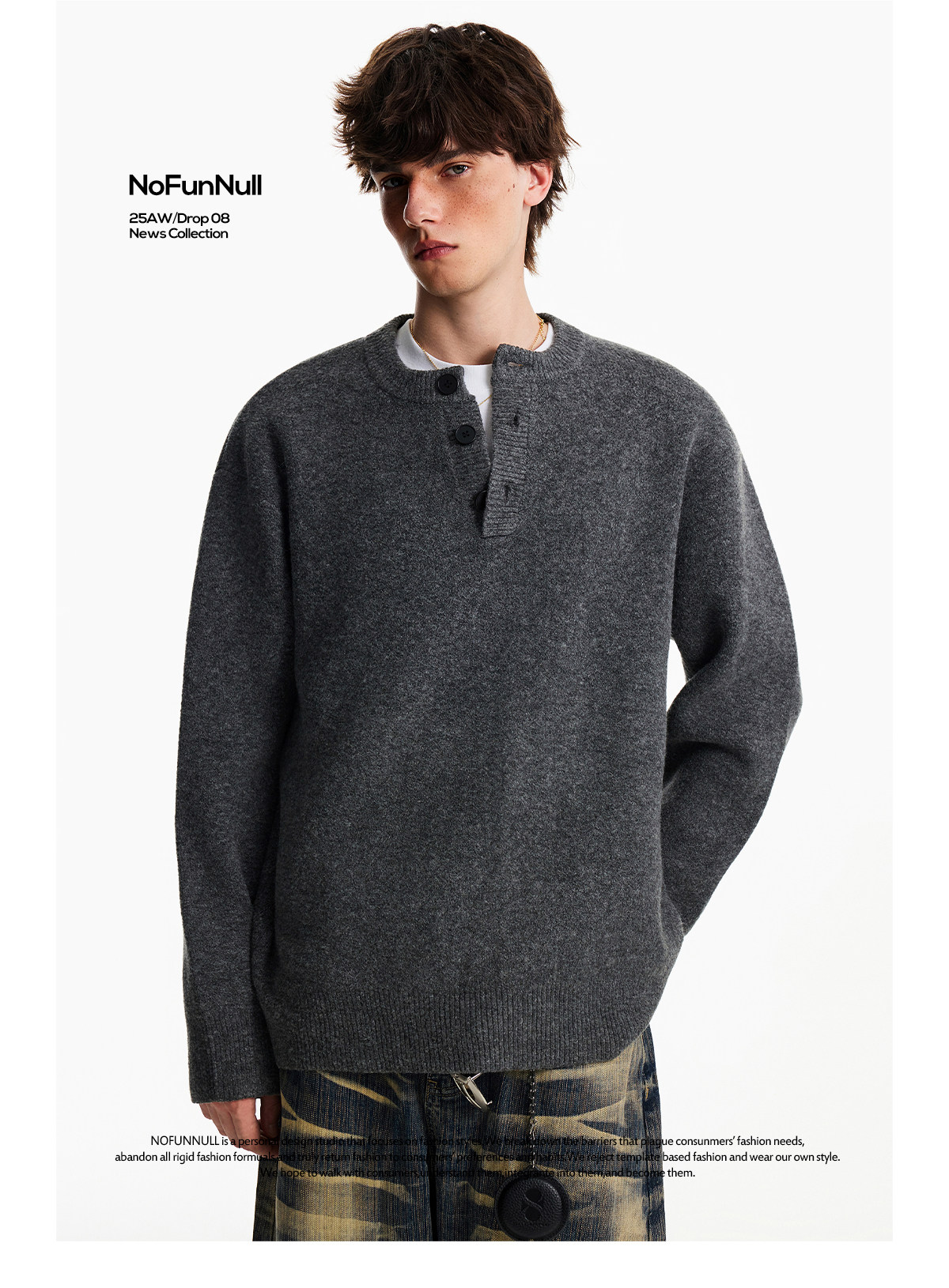 Nofunnull American-Style Henry Collar Buttoned Wool Sweater for Men, Autumn and Winter Loose Round Neck Heavy Knit Top