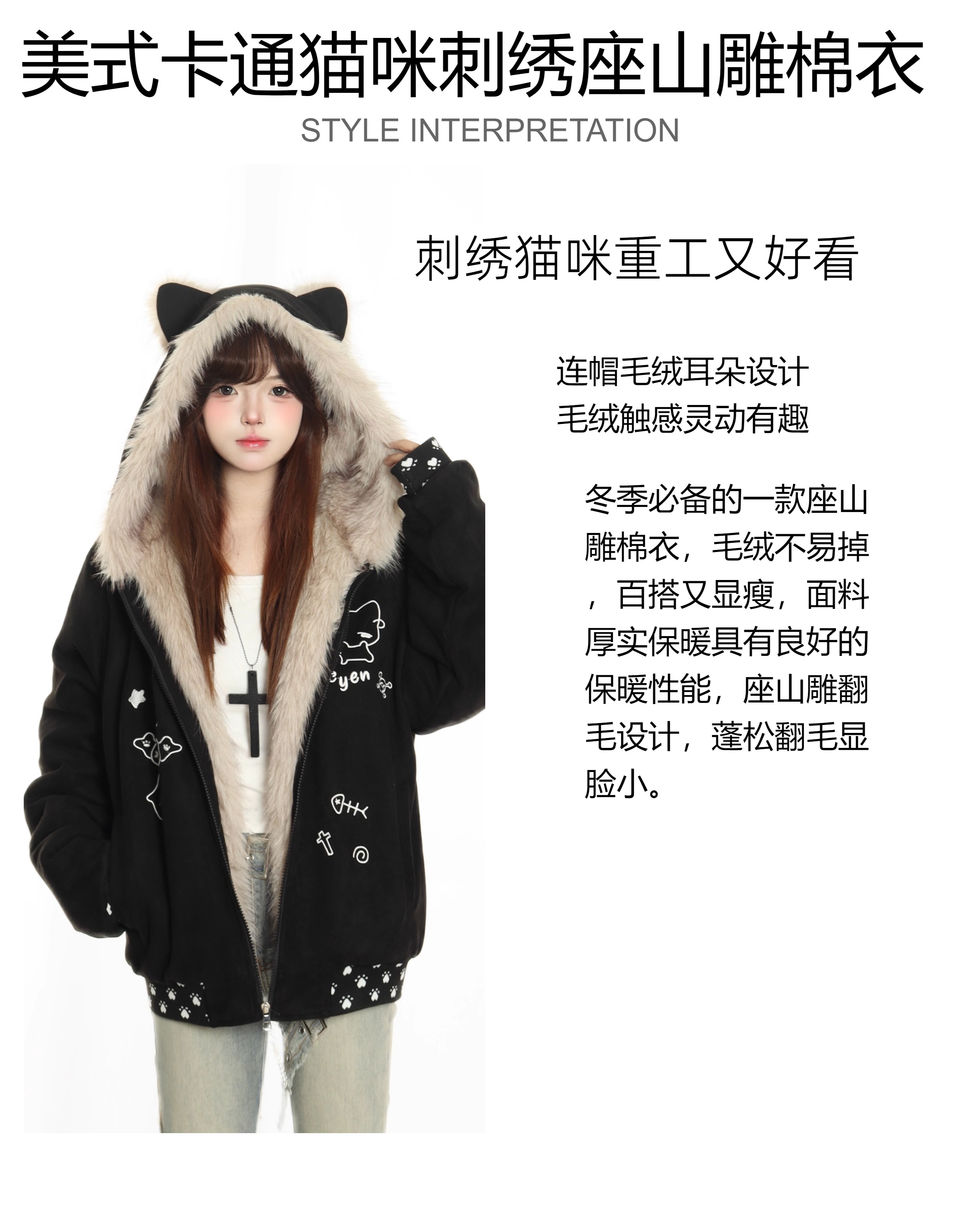 Xiao Hang Hasn'T Had Enough to Eat Yet, Original Winter Cat Embroidery Thickened Warm Cotton Coat for Men and Women, Suede Jacket