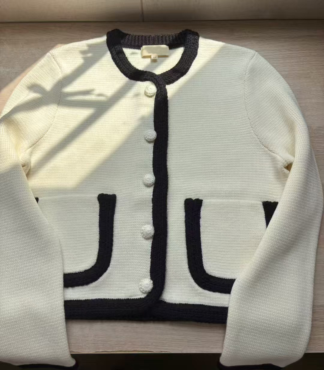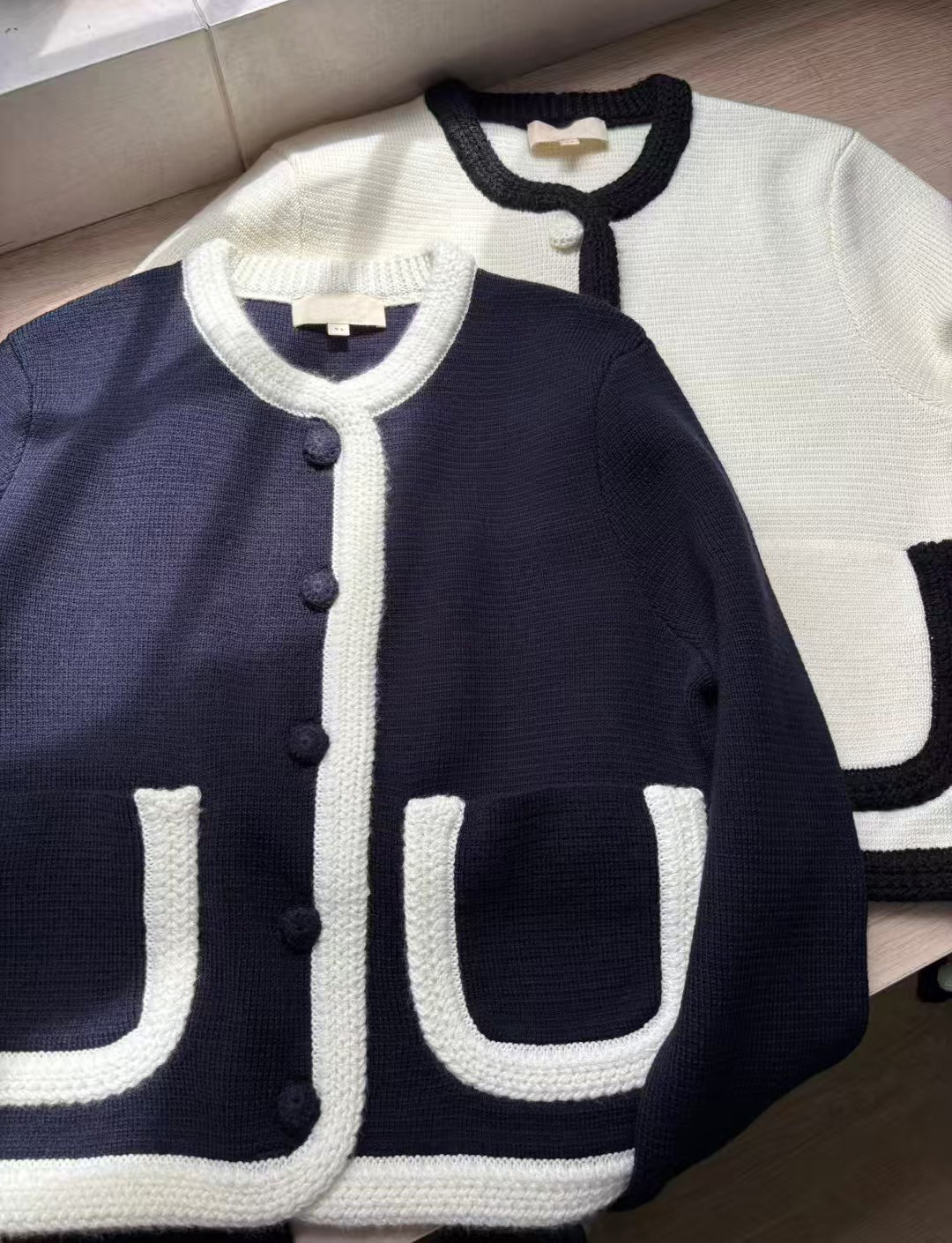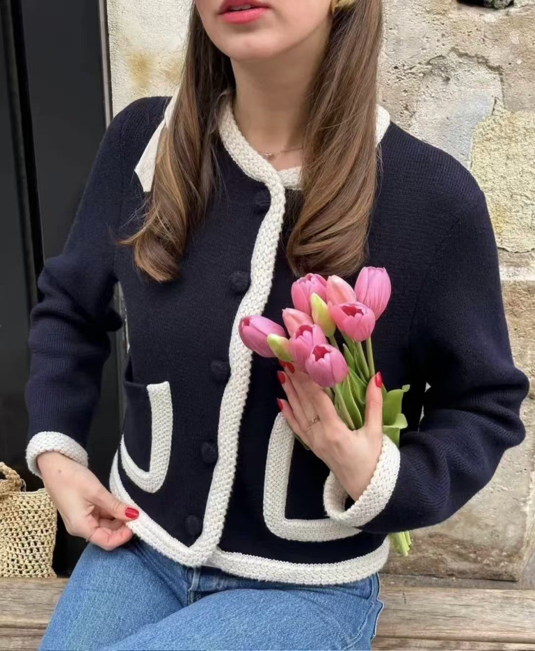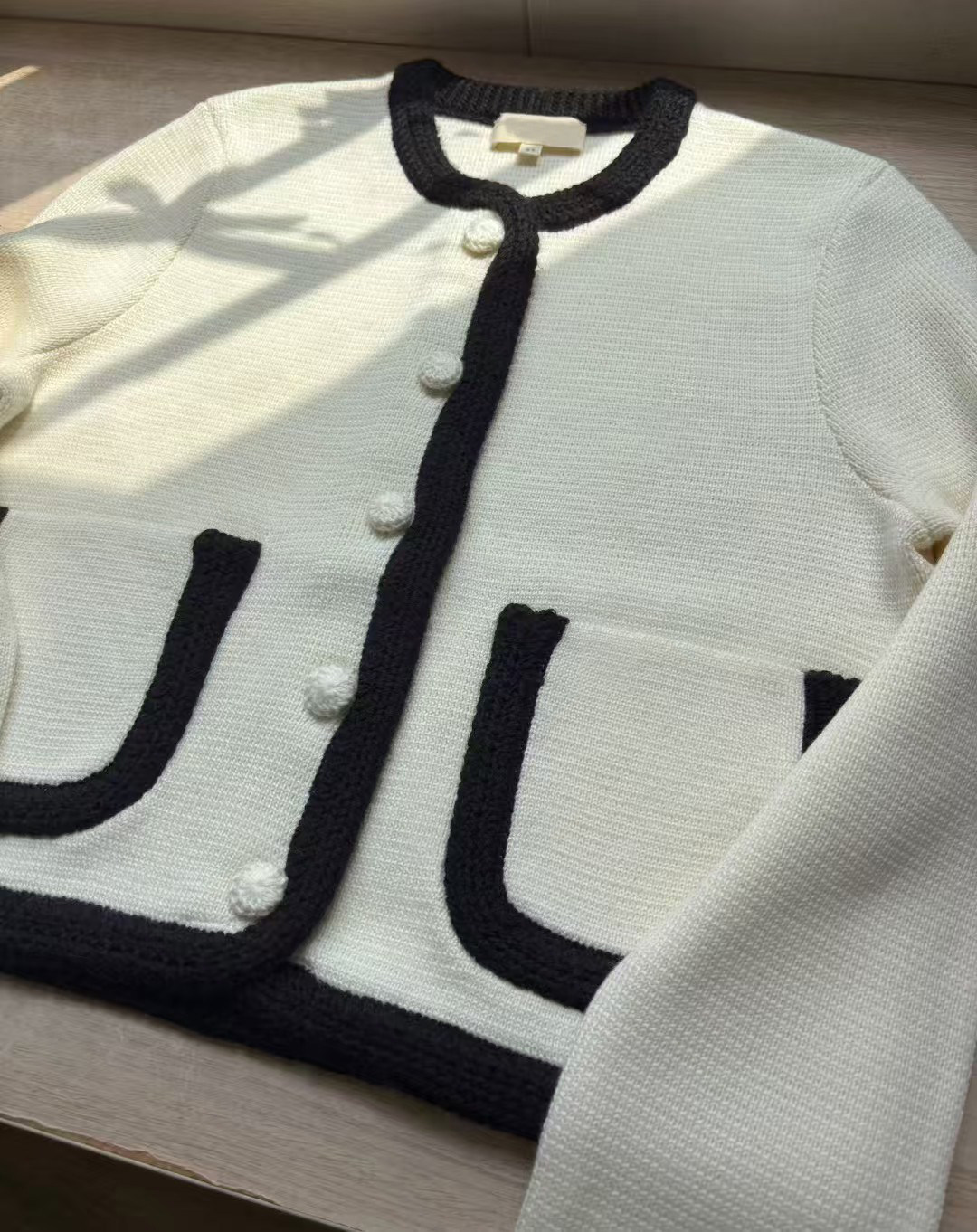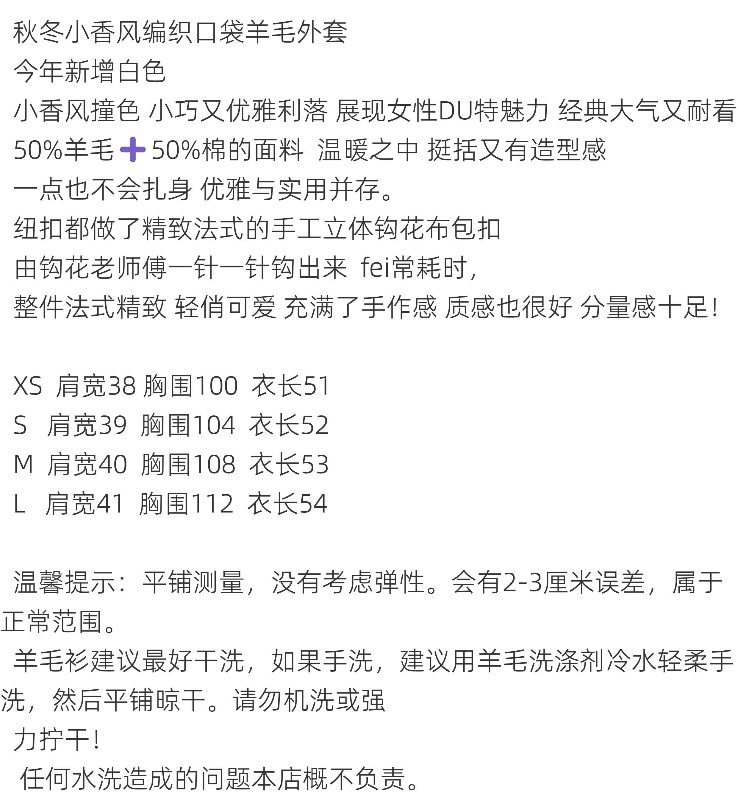 French-Style Autumn and Winter Tweed Pocket Wool-Cotton Blend Jacket with a Three-Dimensional Round Neck, Hand-Crocheted Color-Blocked Short Top