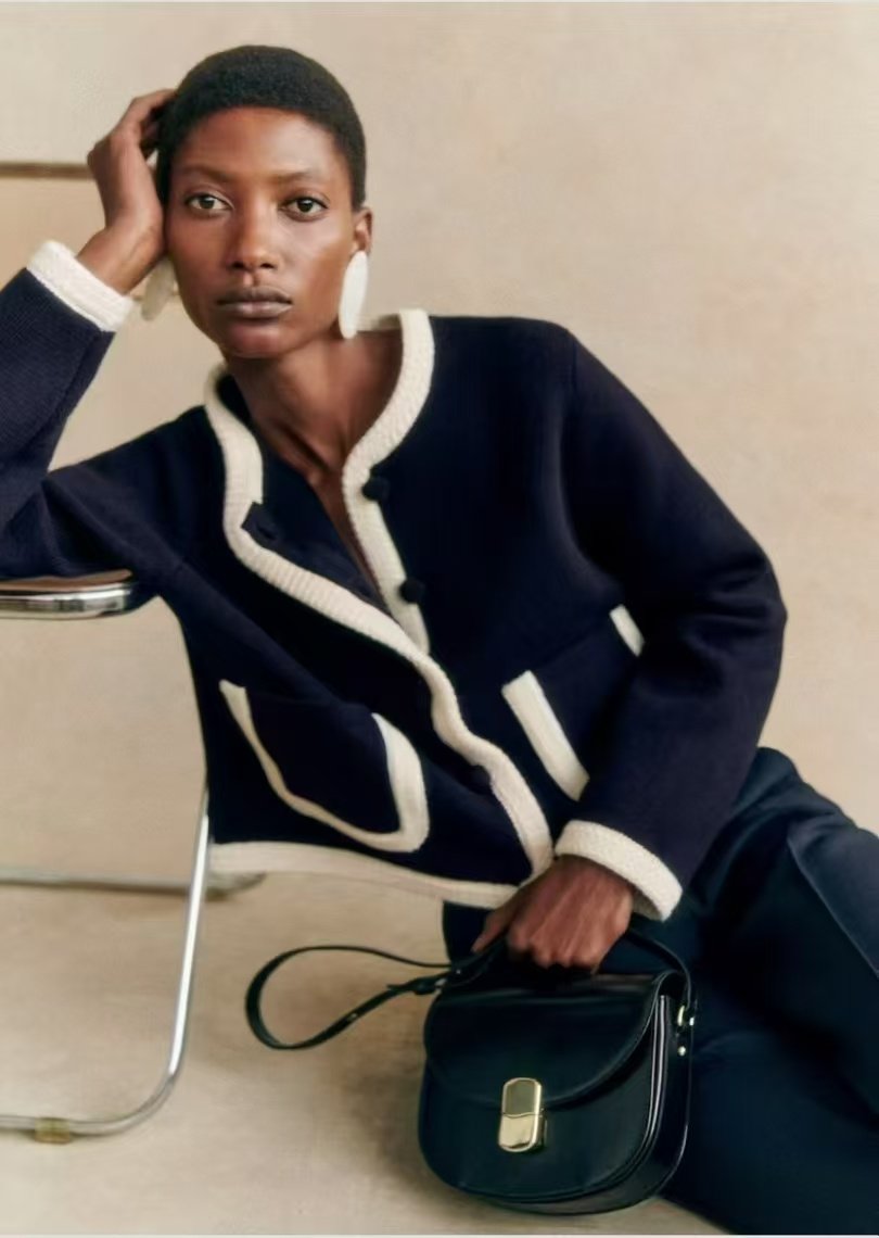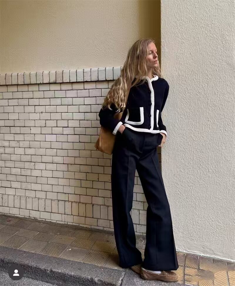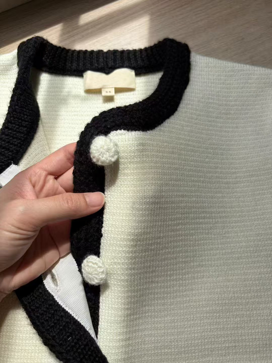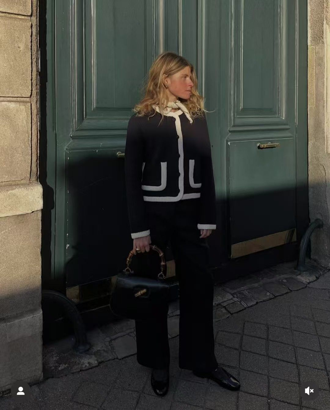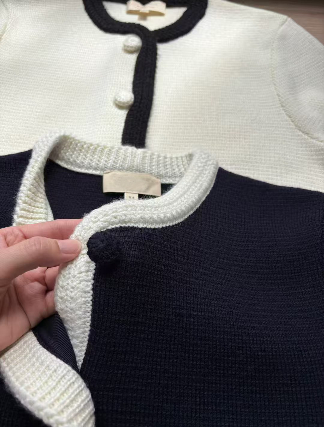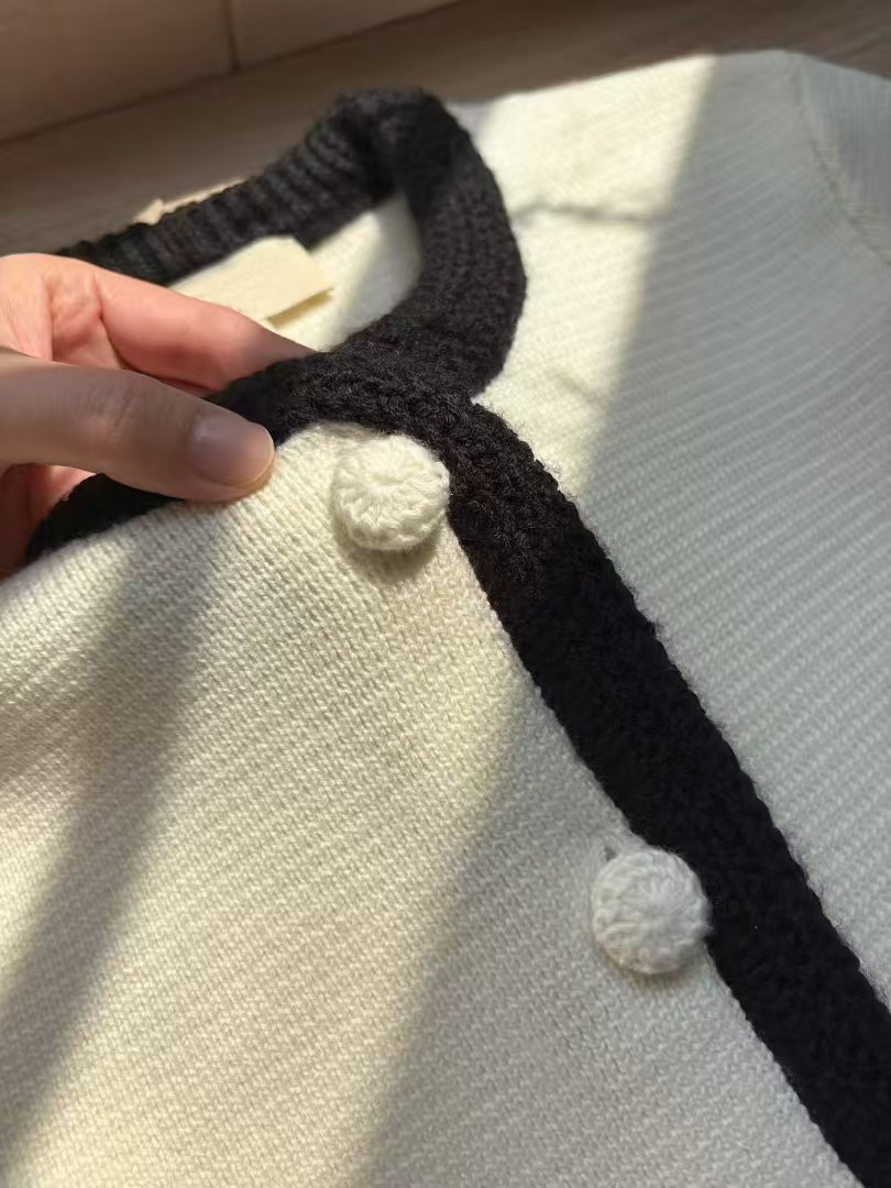 French-Style Autumn and Winter Tweed Pocket Wool-Cotton Blend Jacket with a Three-Dimensional Round Neck, Hand-Crocheted Color-Blocked Short Top