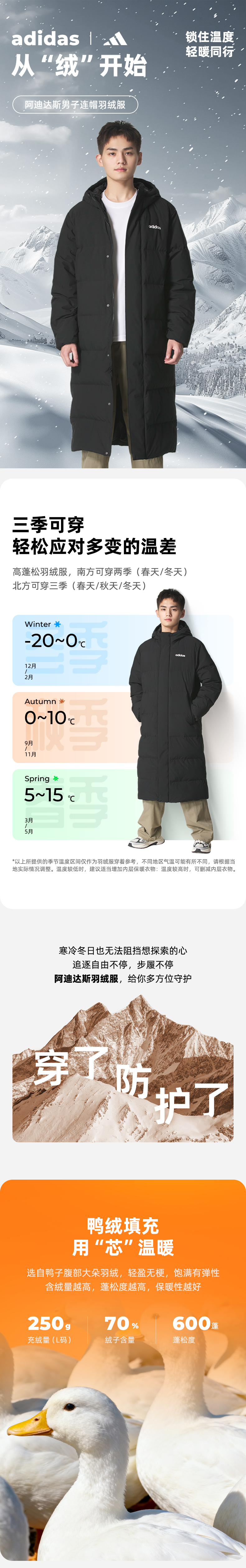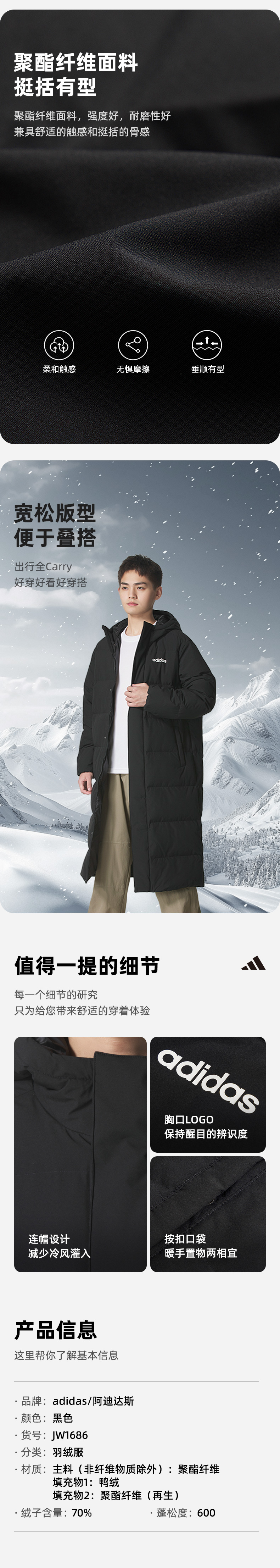 Adidas Black Long down Jacket for Men and Women 25 Winter Casual Thickened Duck down Jacket Jw1686