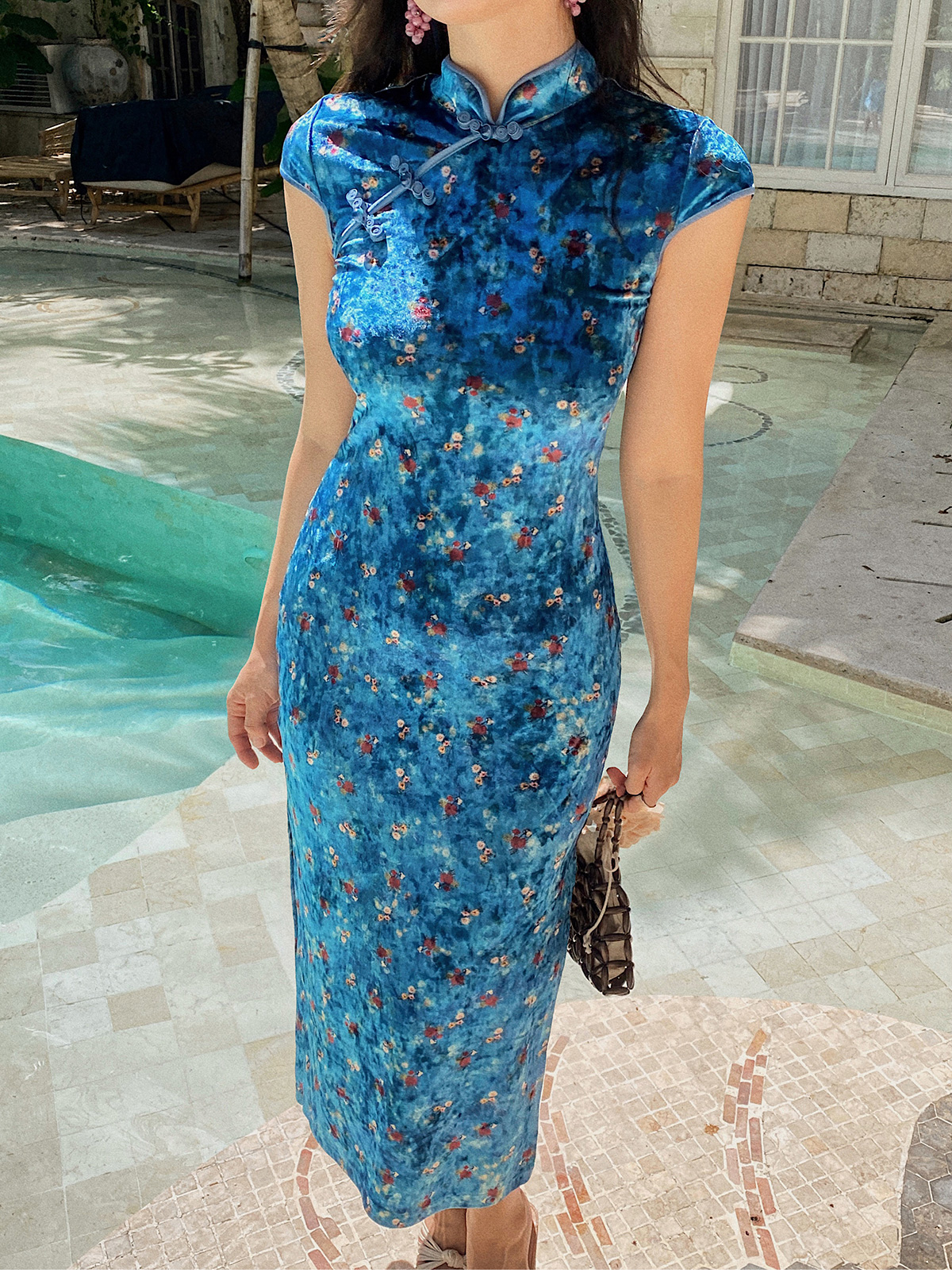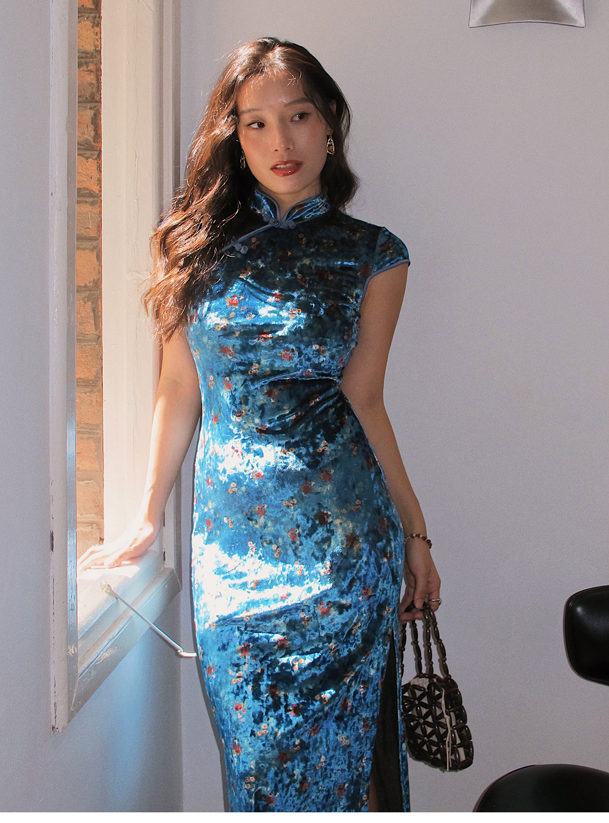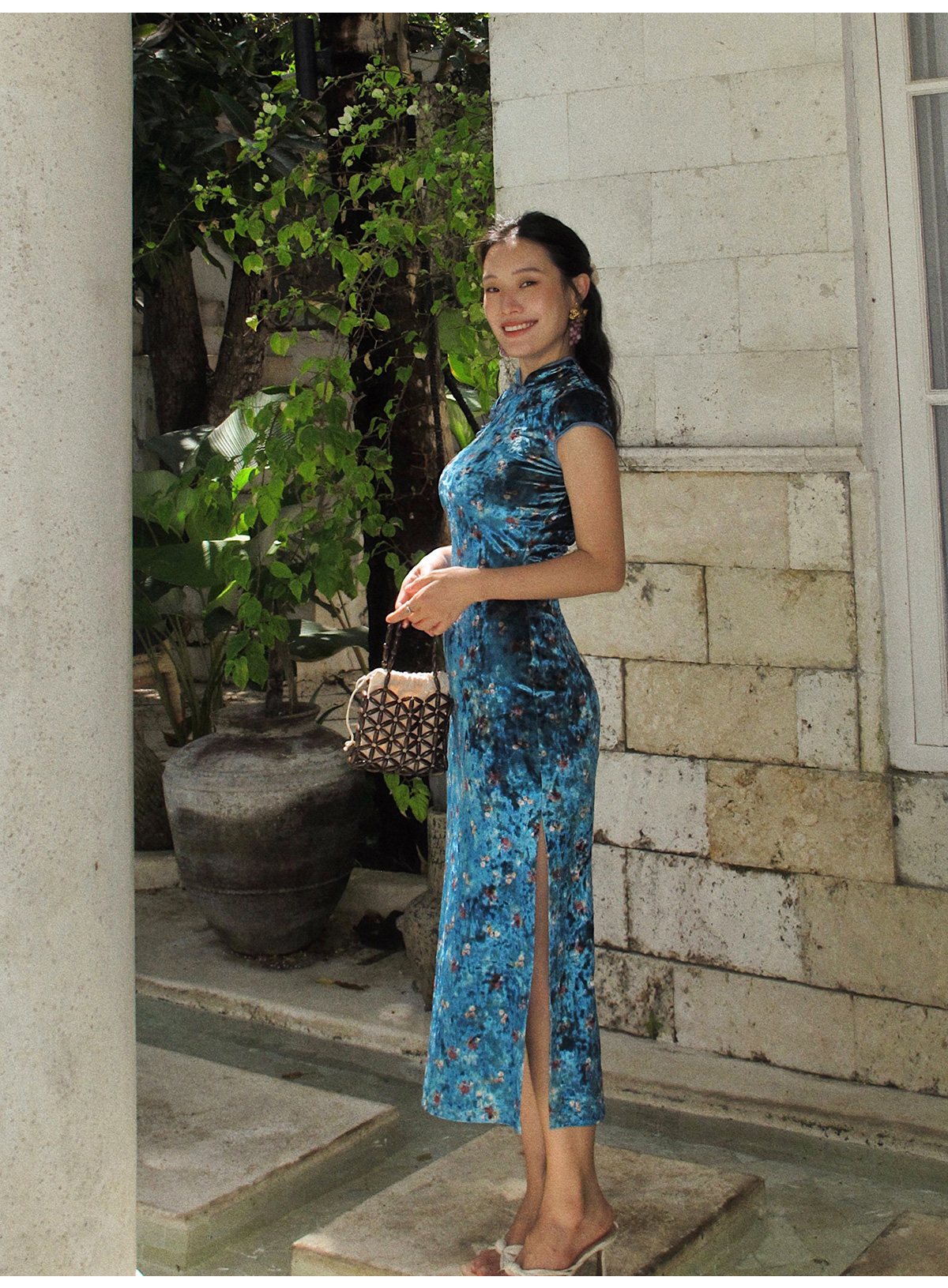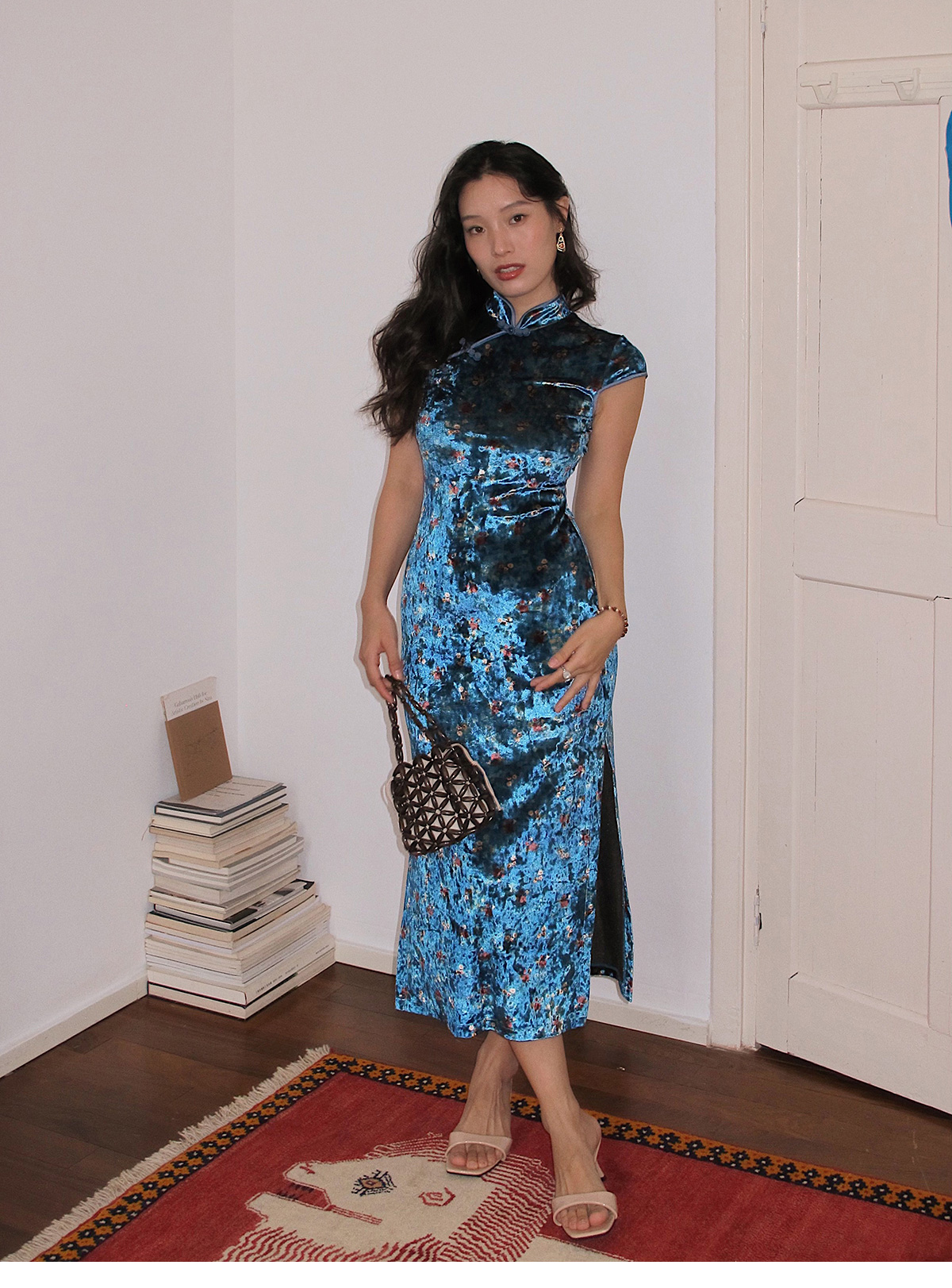 Ooh Itch Itch's New Chinese-Style Diamond Velvet Slim-Fitting Cheongsam Dress with Slit