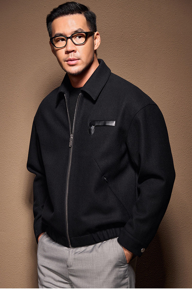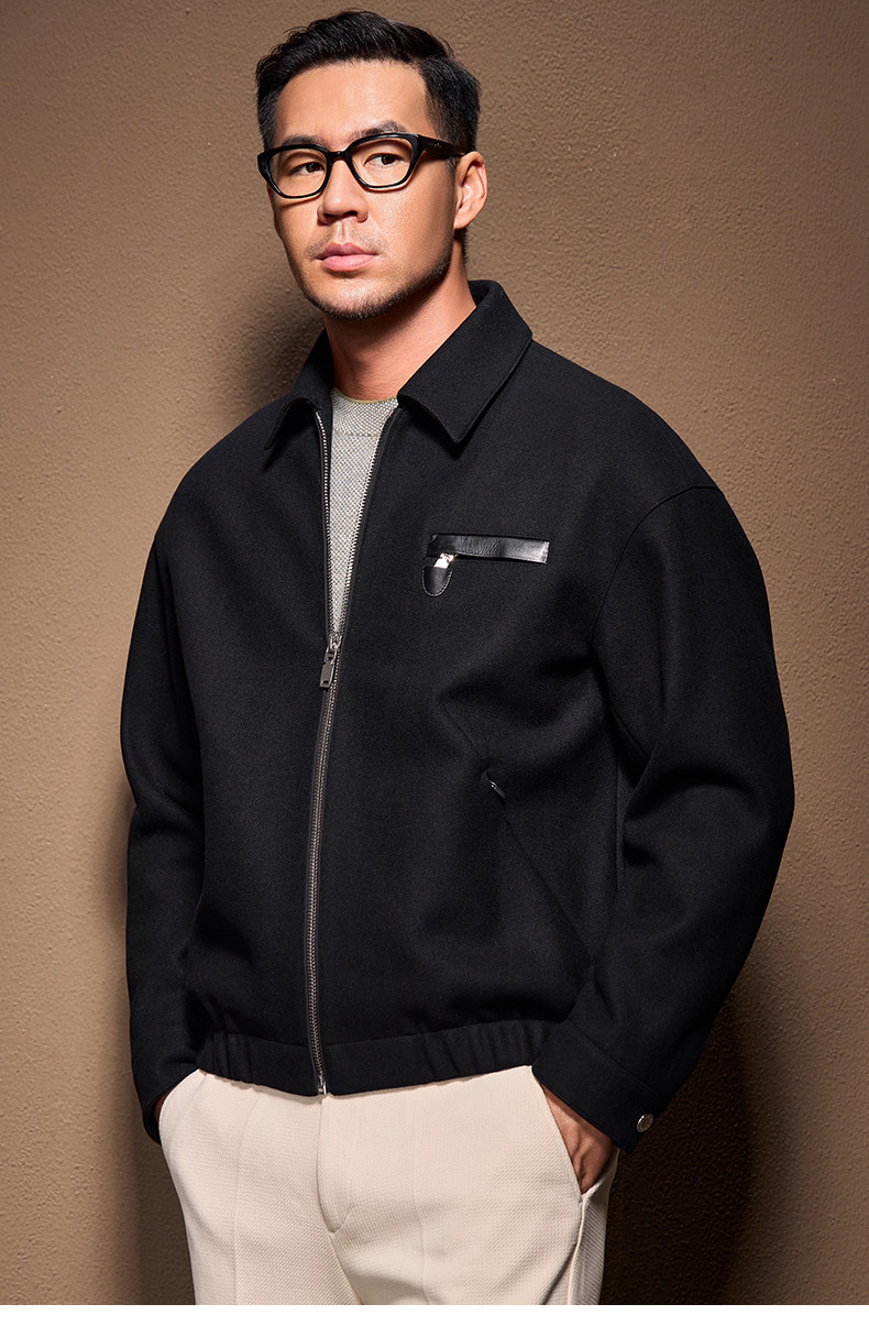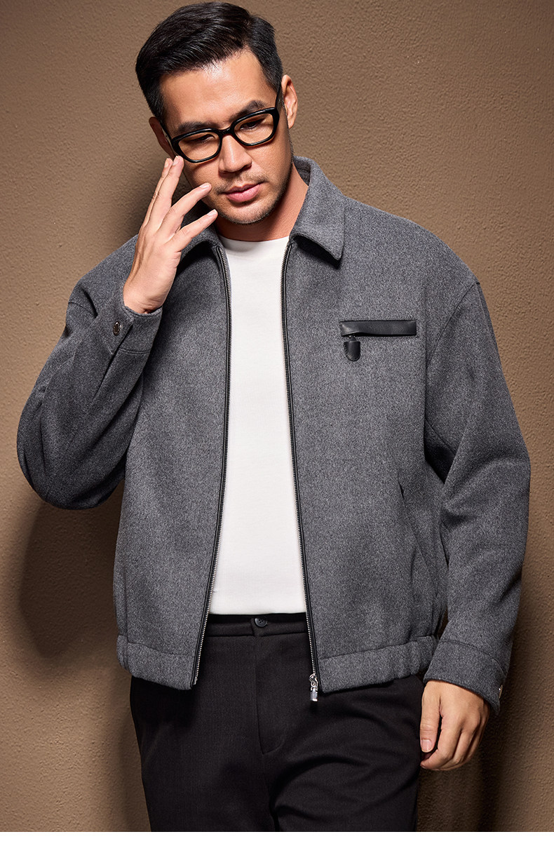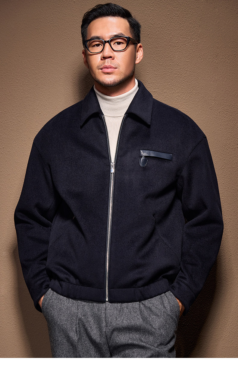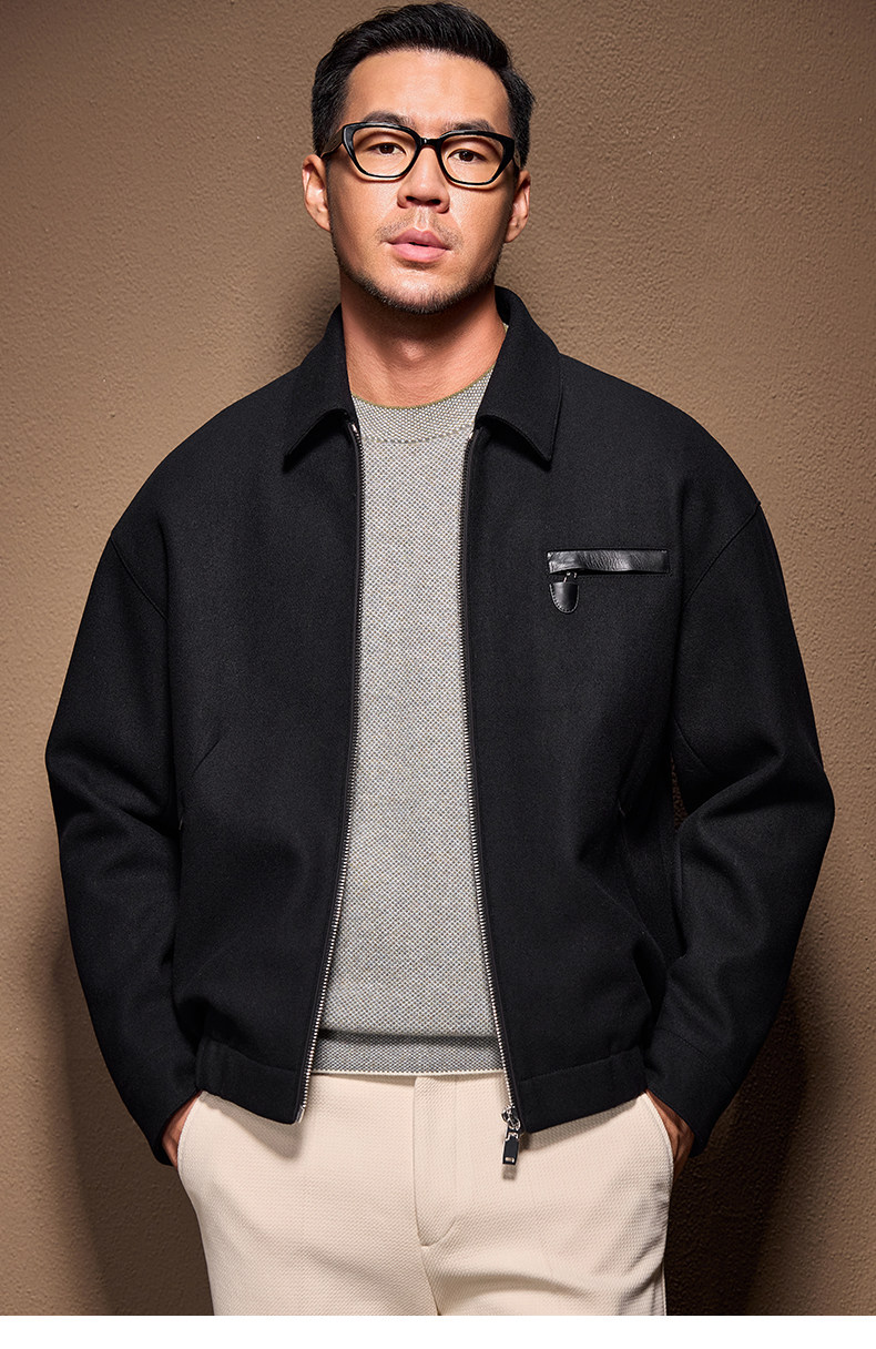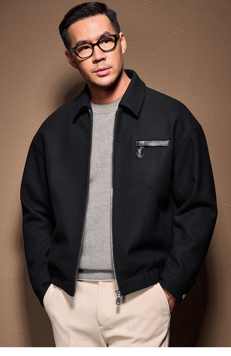 Men's Thick Woolen Coat with Mulberry Silk, Genuine Leather Patchwork Jacket, Autumn and Winter Turn-Down Collar Loose Woolen Overcoat