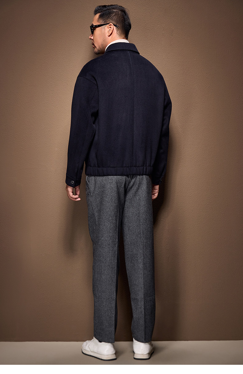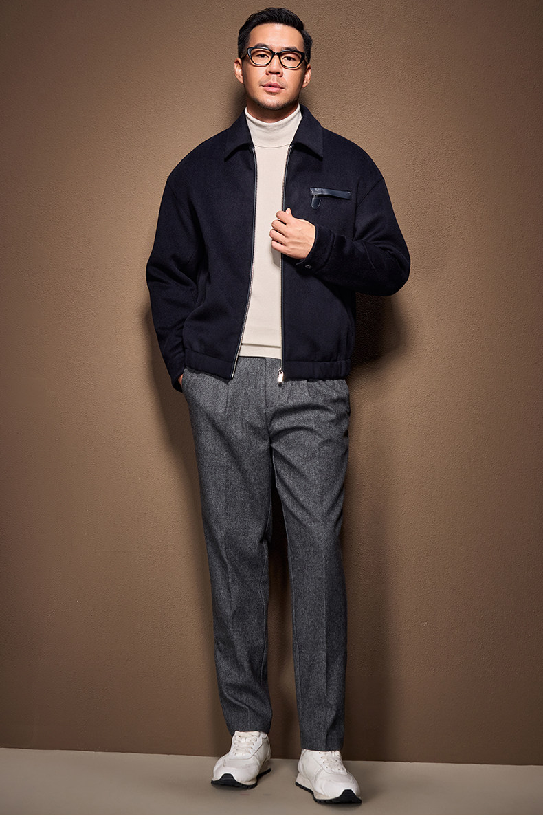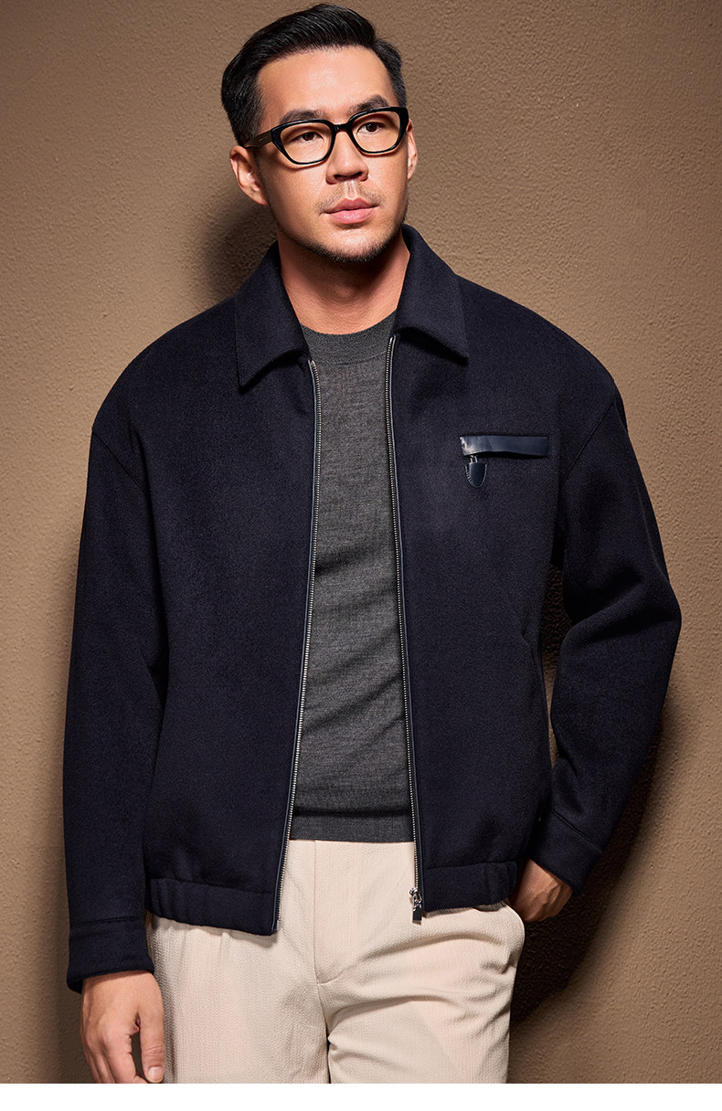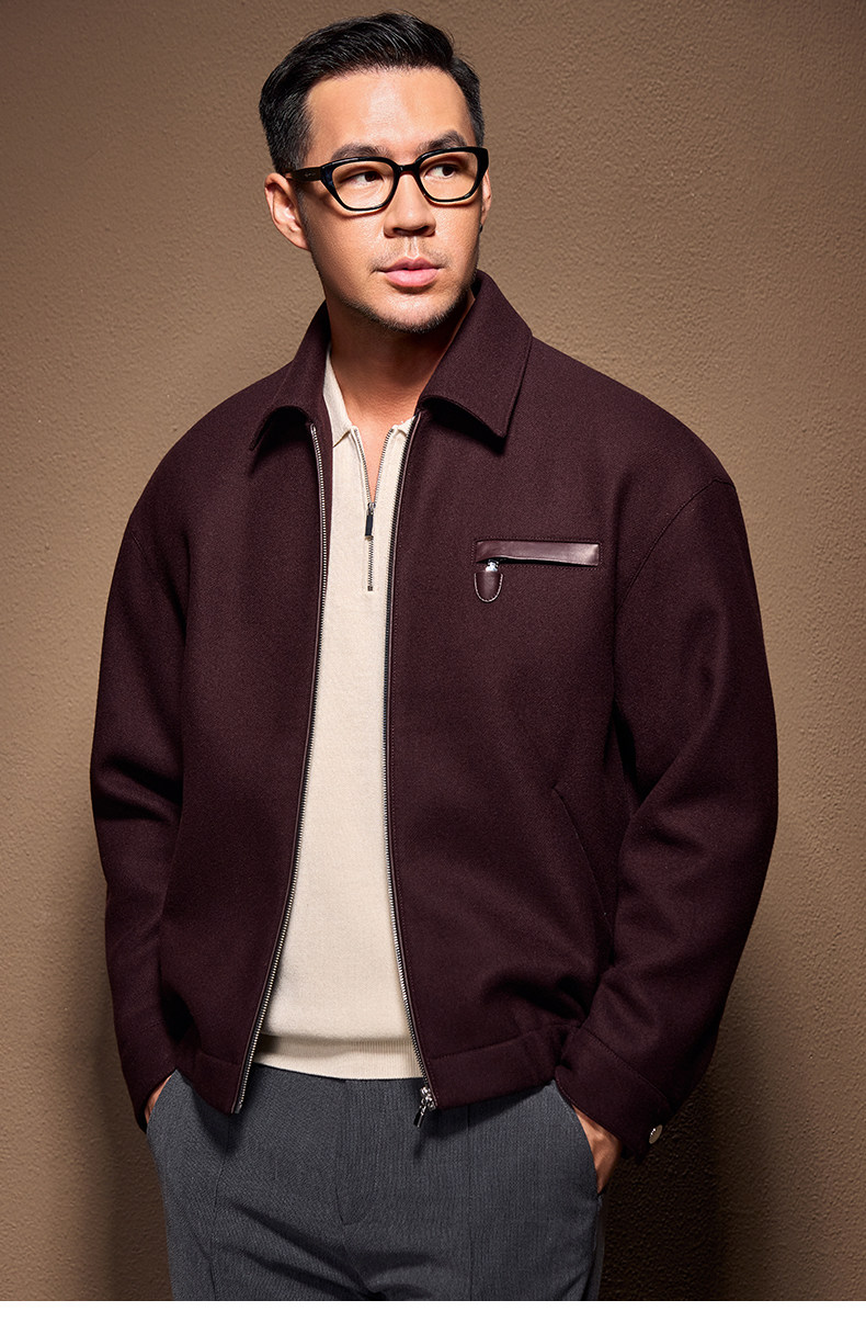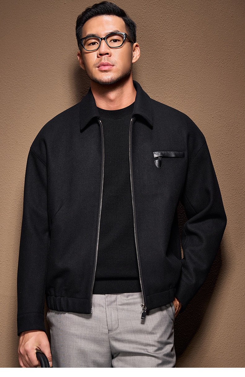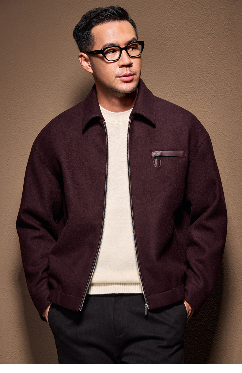 Men's Thick Woolen Coat with Mulberry Silk, Genuine Leather Patchwork Jacket, Autumn and Winter Turn-Down Collar Loose Woolen Overcoat
