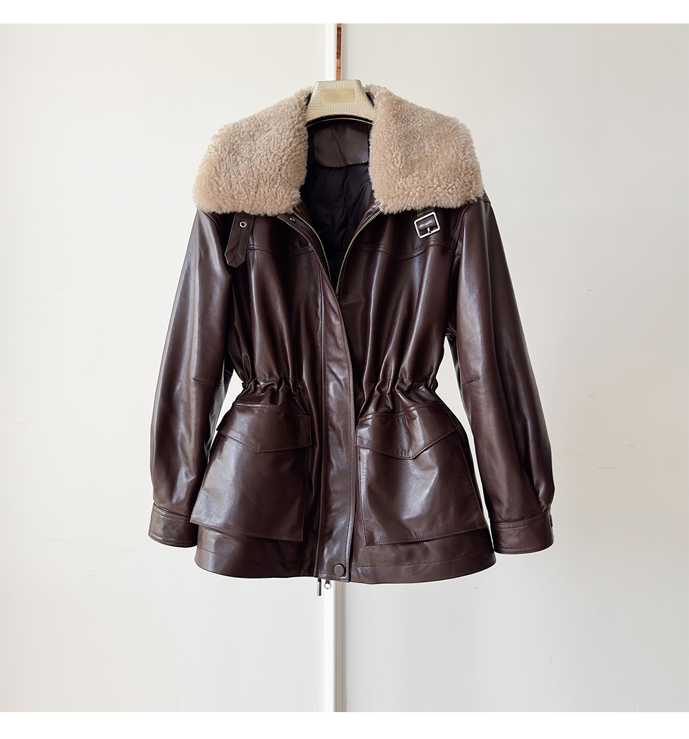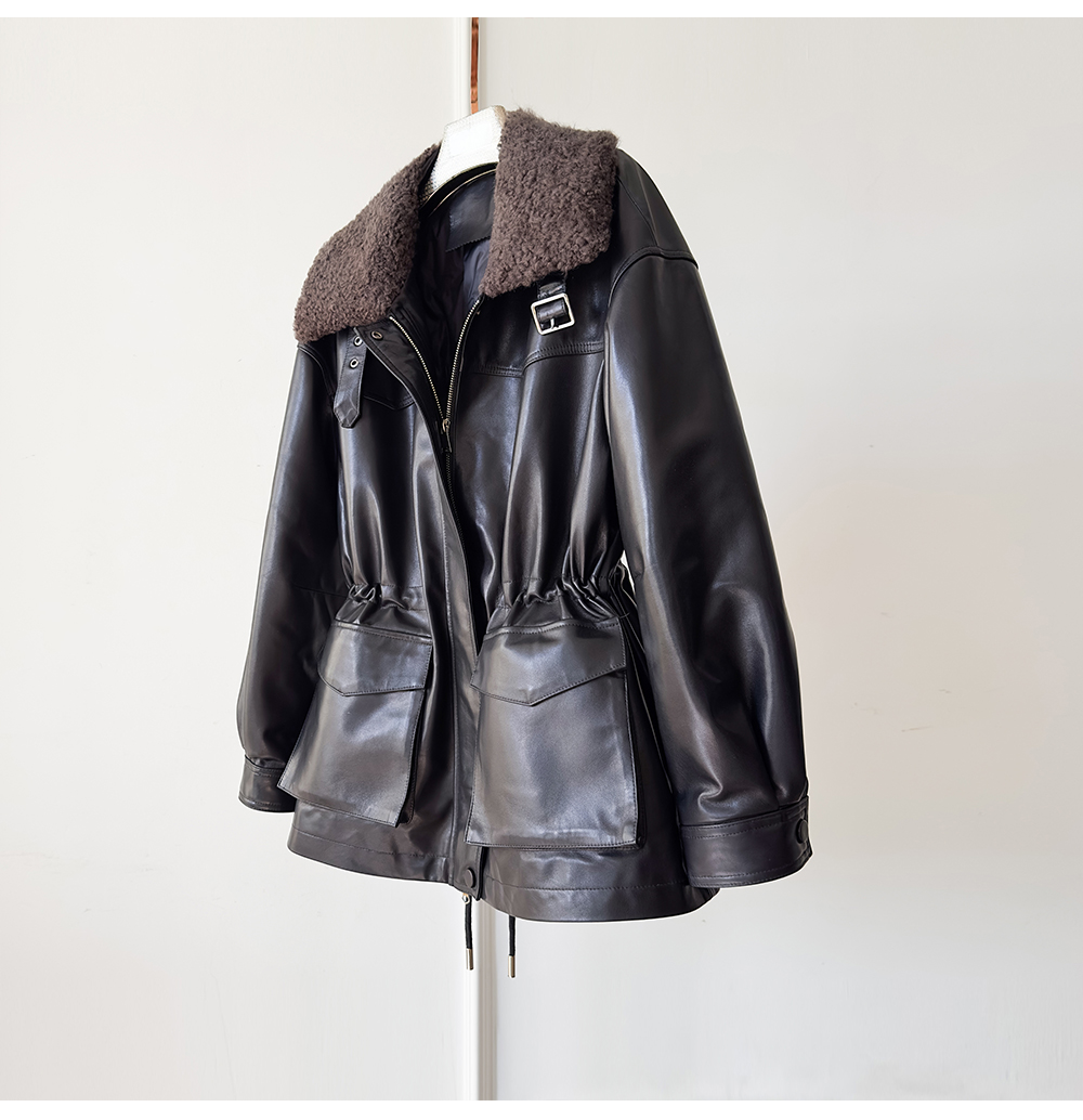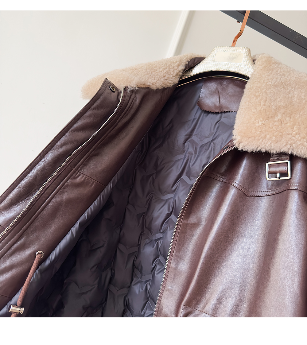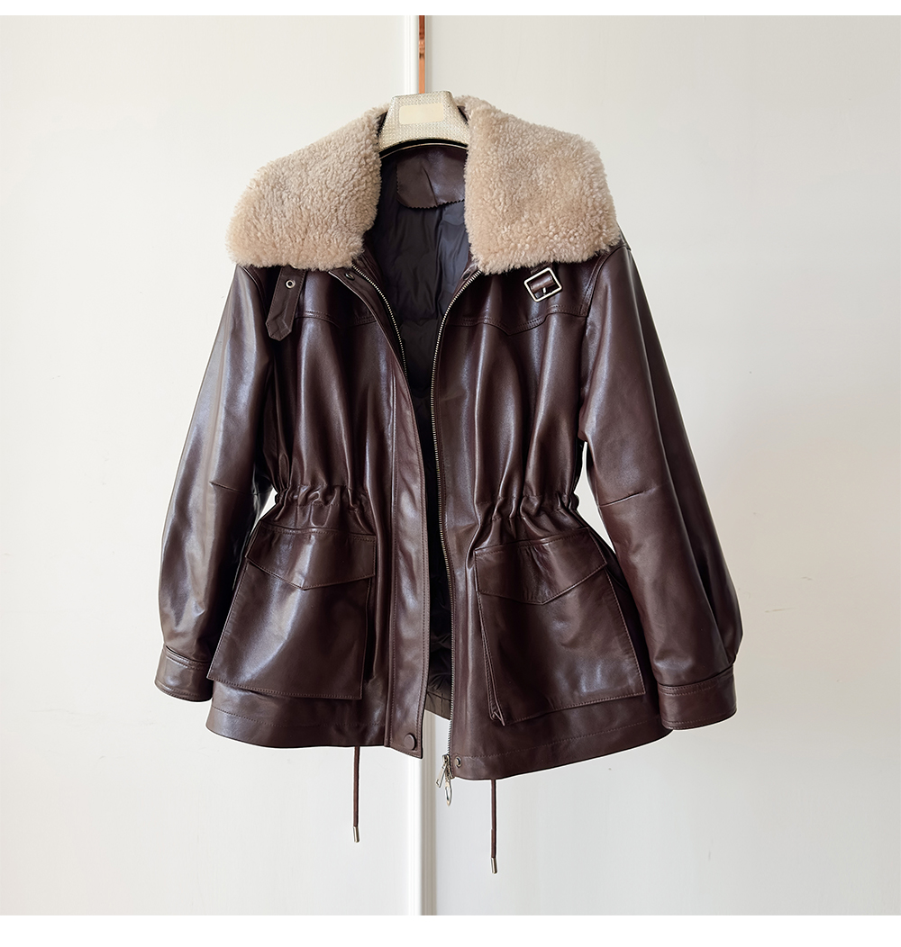 White Goose down Genuine Leather down Jacket for Women 2025 Sheepskin with Lambswool Collar, Drawstring Waist, Mid-Length Coat