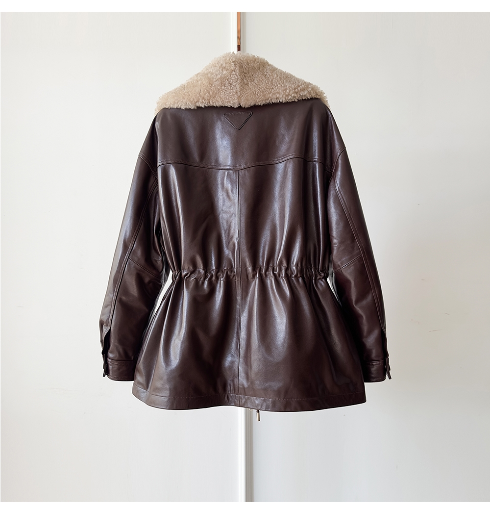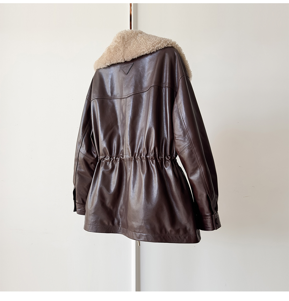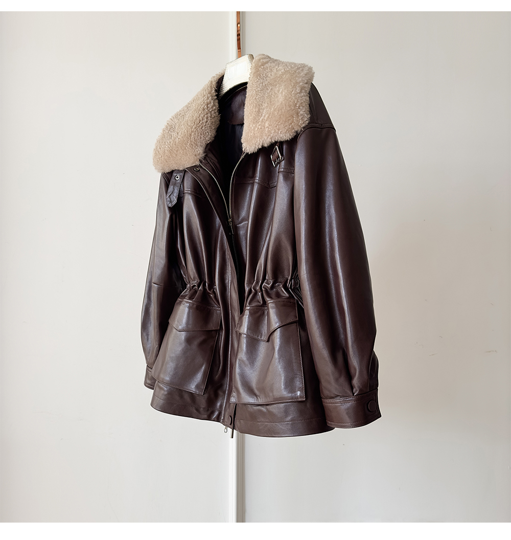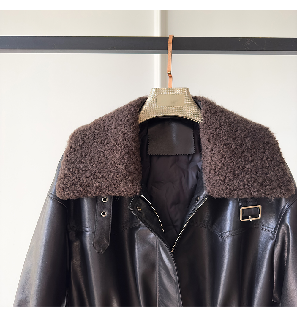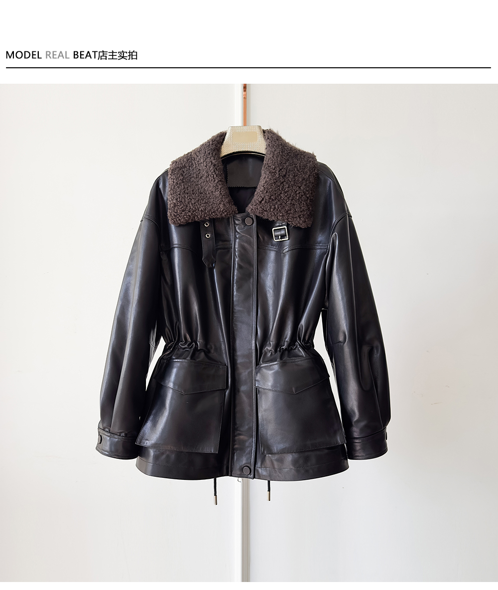 White Goose down Genuine Leather down Jacket for Women 2025 Sheepskin with Lambswool Collar, Drawstring Waist, Mid-Length Coat