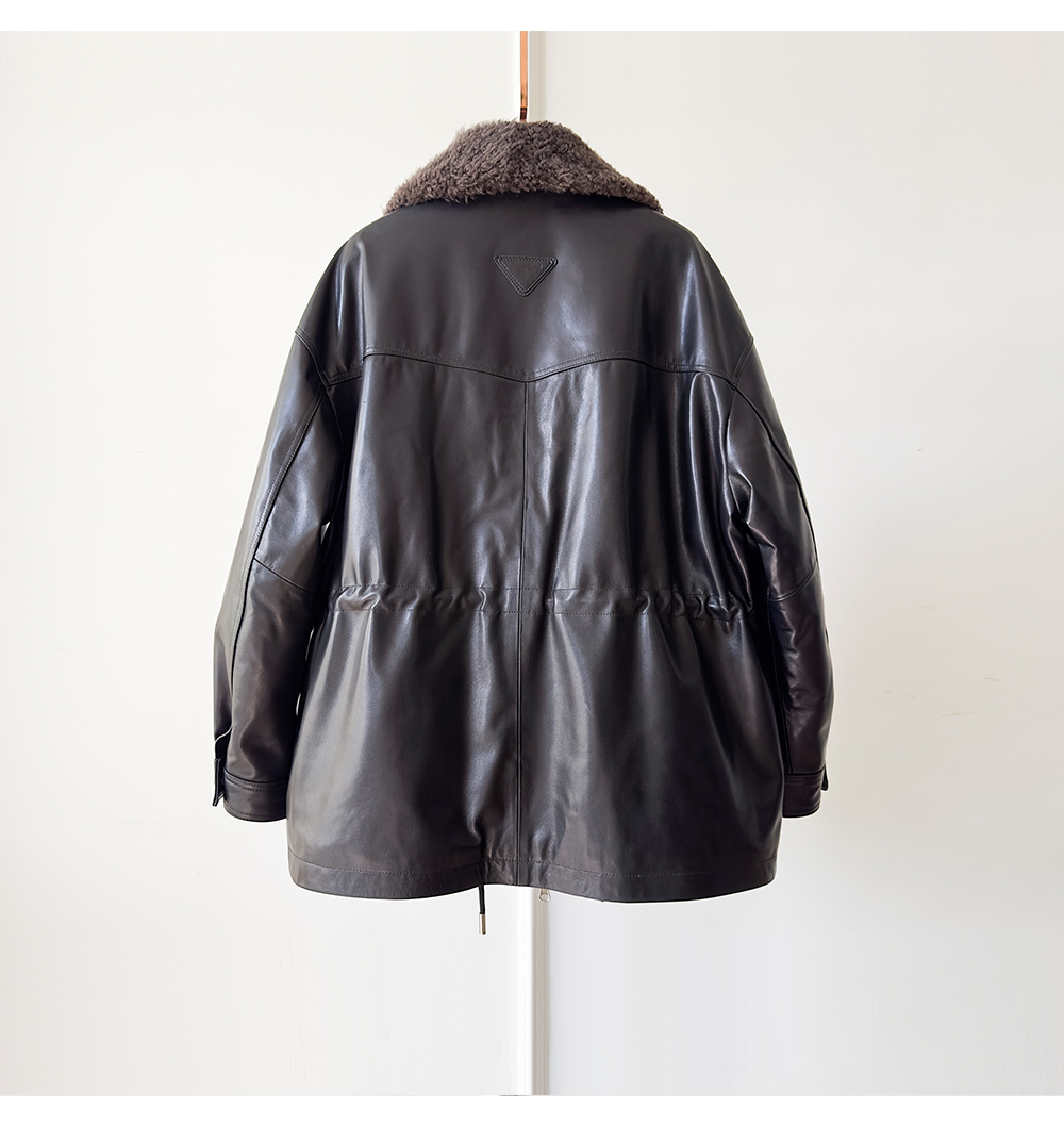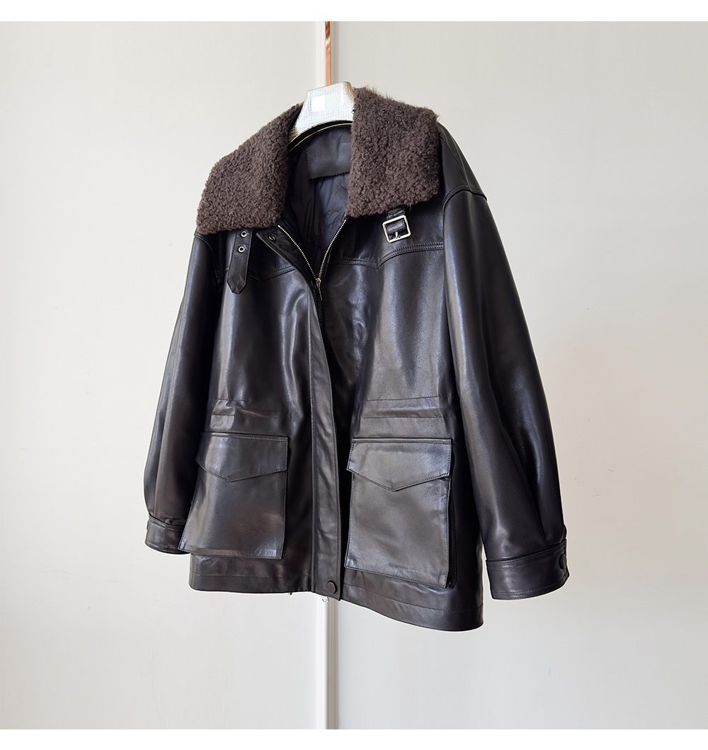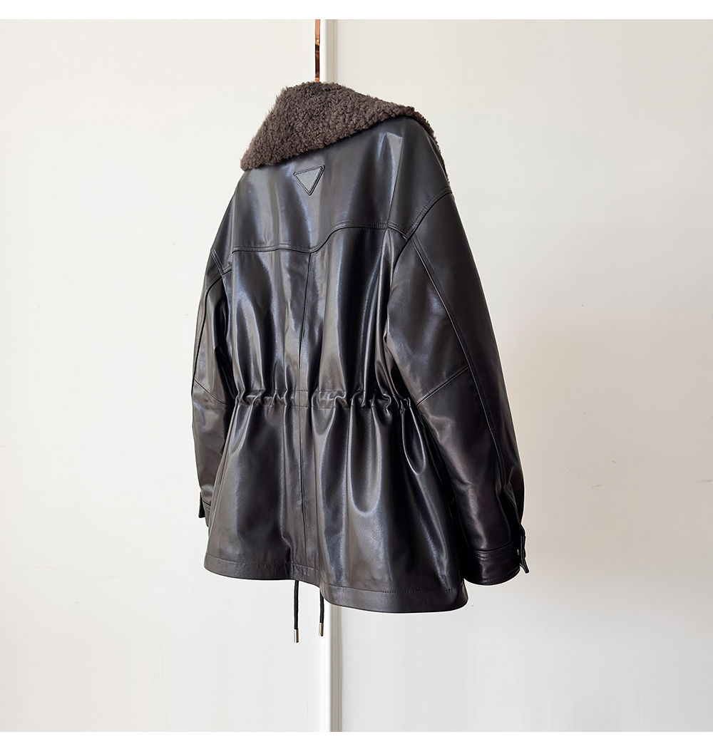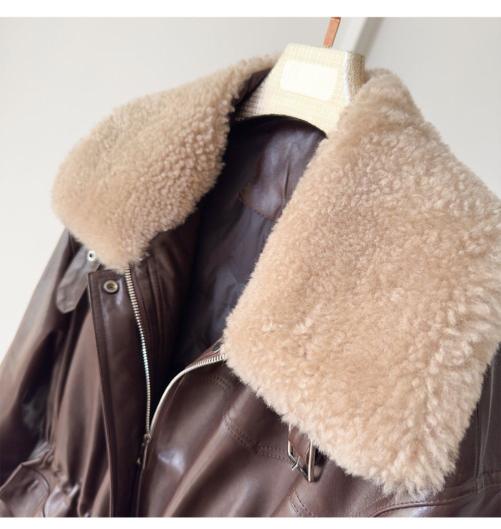 White Goose down Genuine Leather down Jacket for Women 2025 Sheepskin with Lambswool Collar, Drawstring Waist, Mid-Length Coat