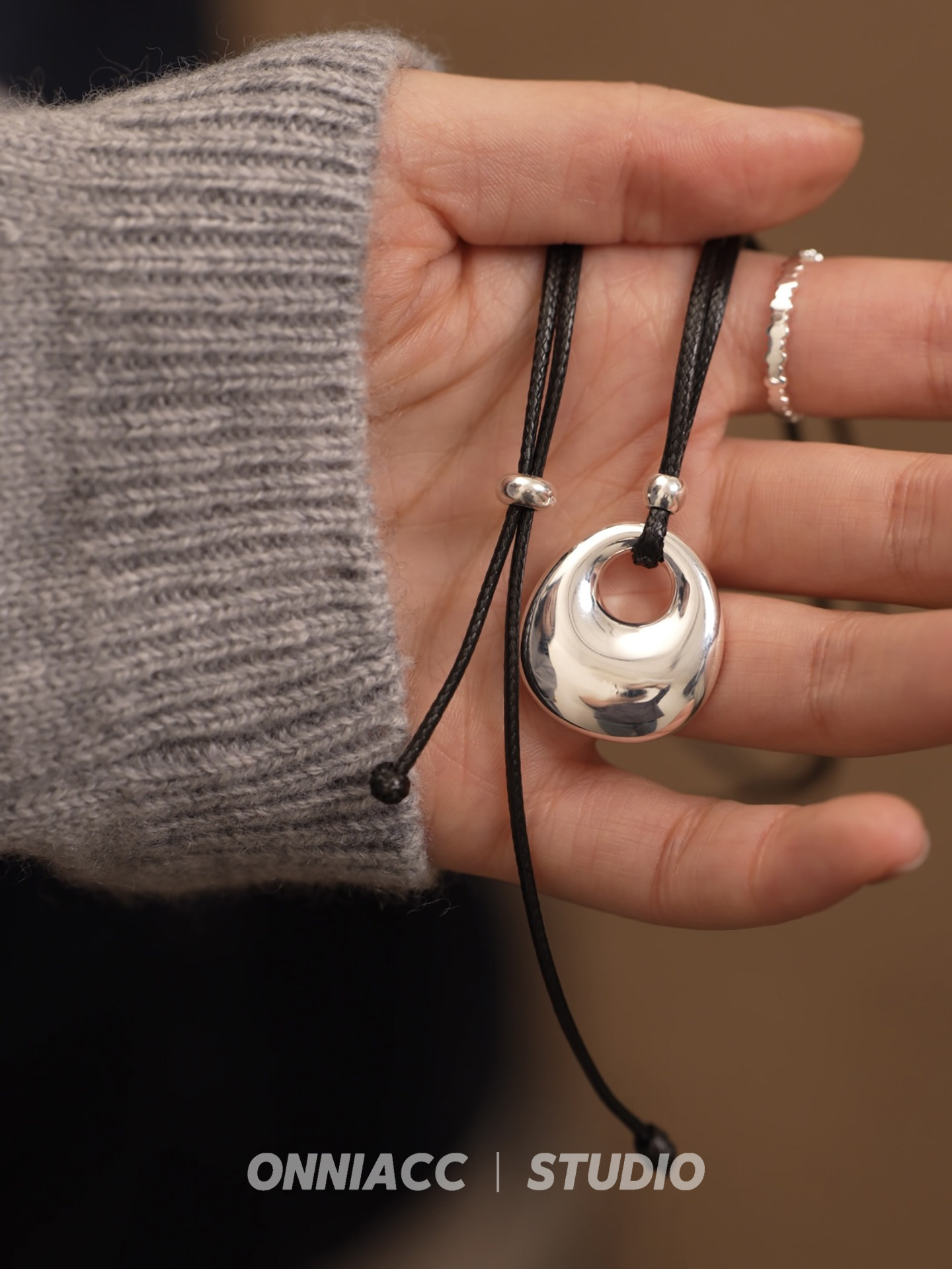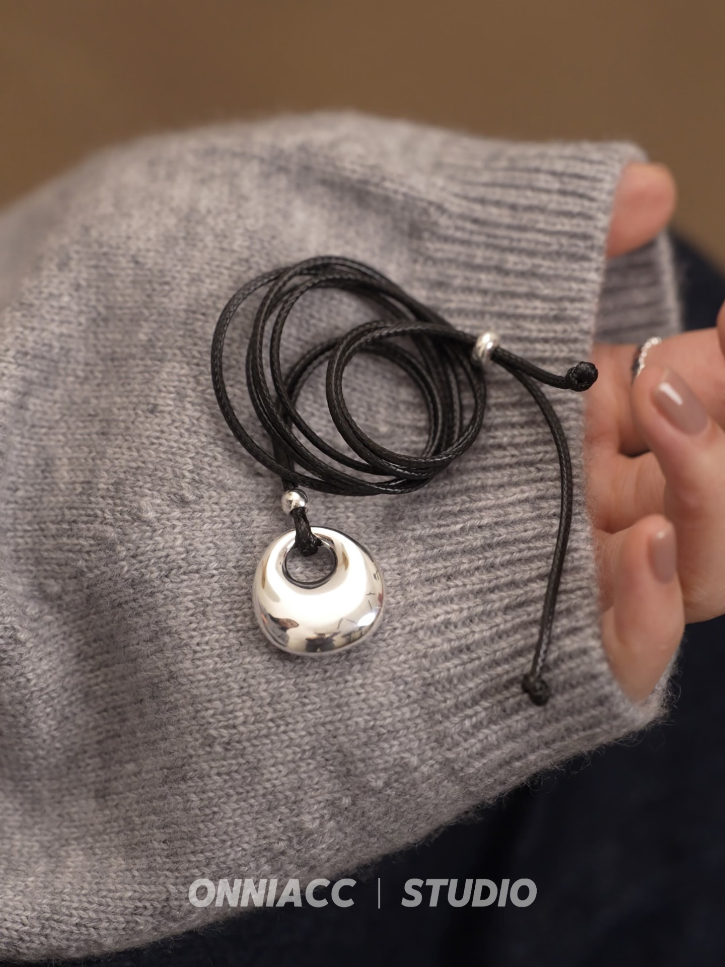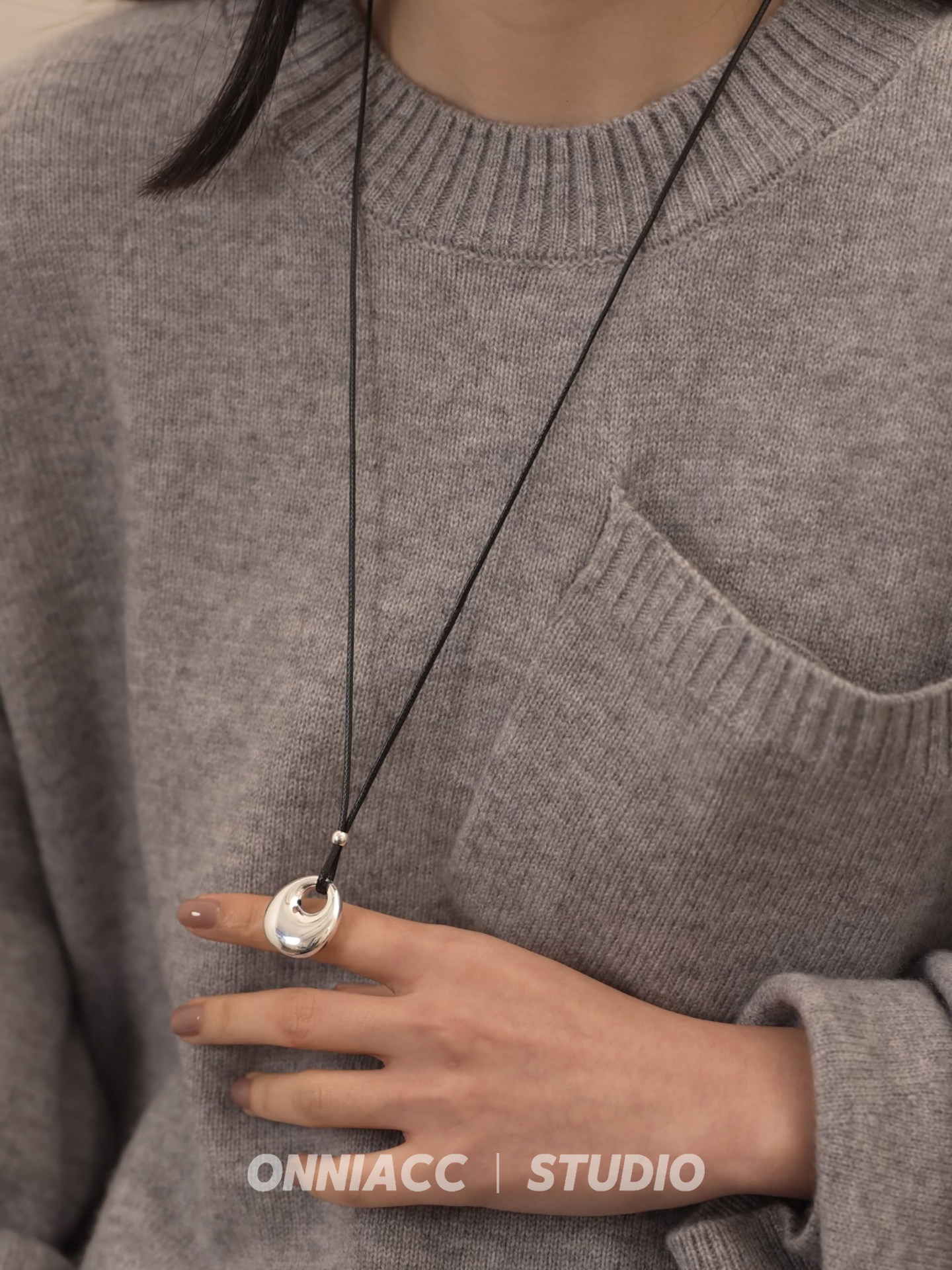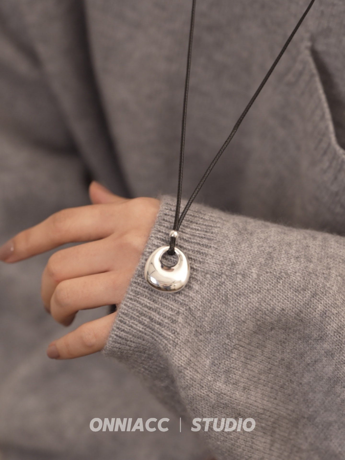 Peace Buckle Pendant Black Cord Necklace for Women, Long Sweater Chain, Sterling Silver Accessory, Autumn and Winter, High-End, Light Luxury, Niche, Simple