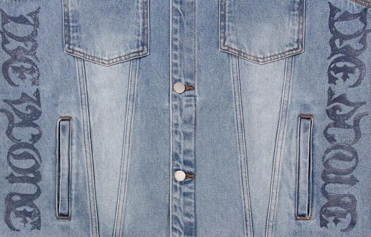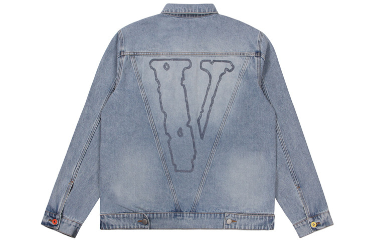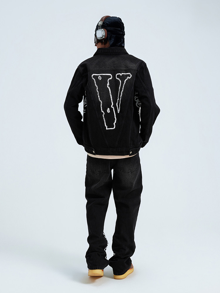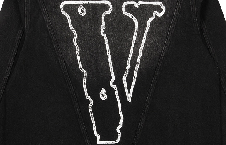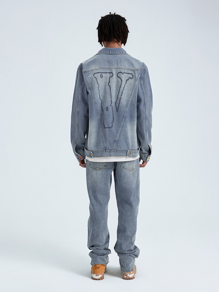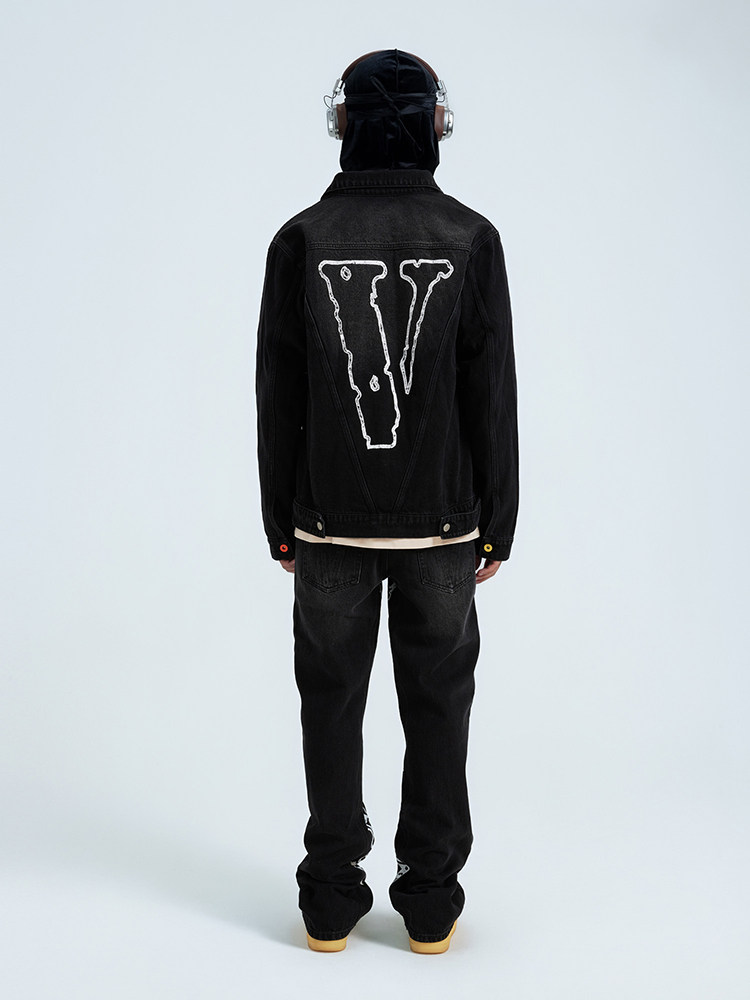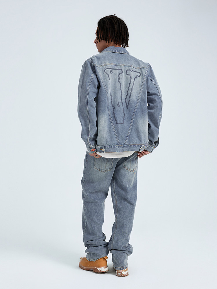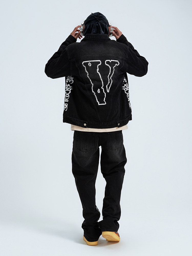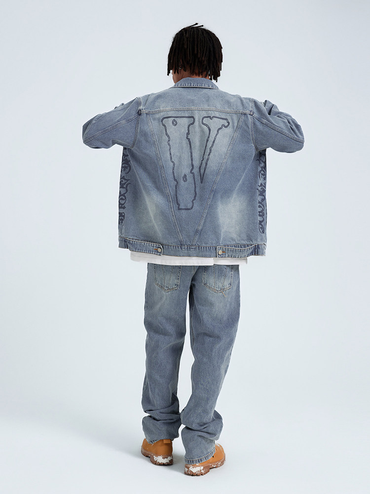 Vlone 25 New Gothic Style Slogan Large Logo Print Three-Dimensional Cut Distressed Washed Casual Denim Jacket