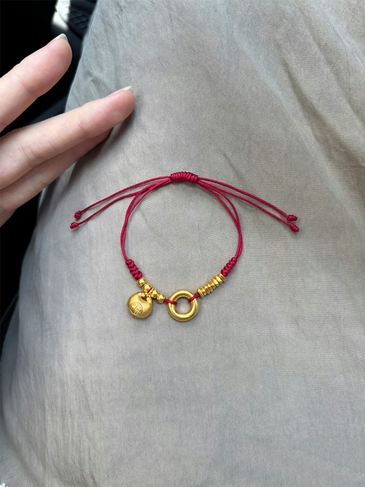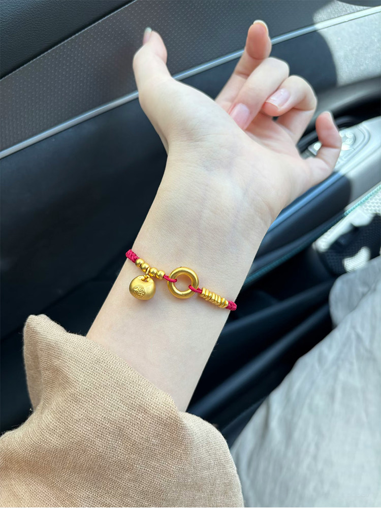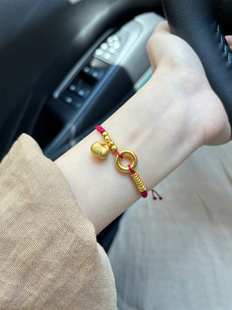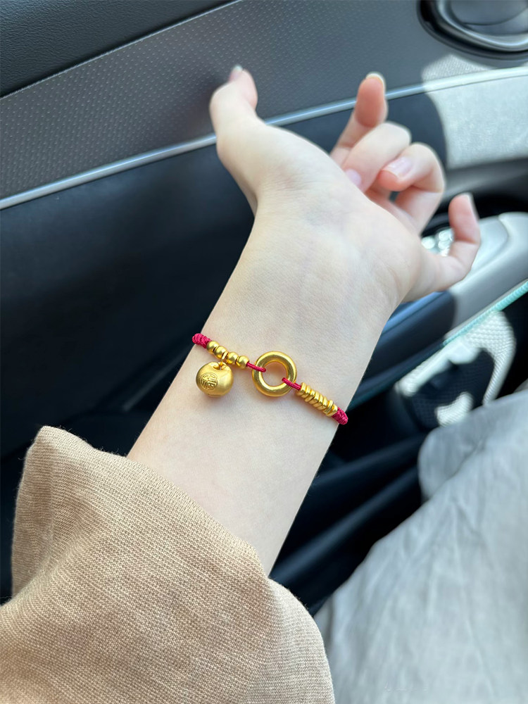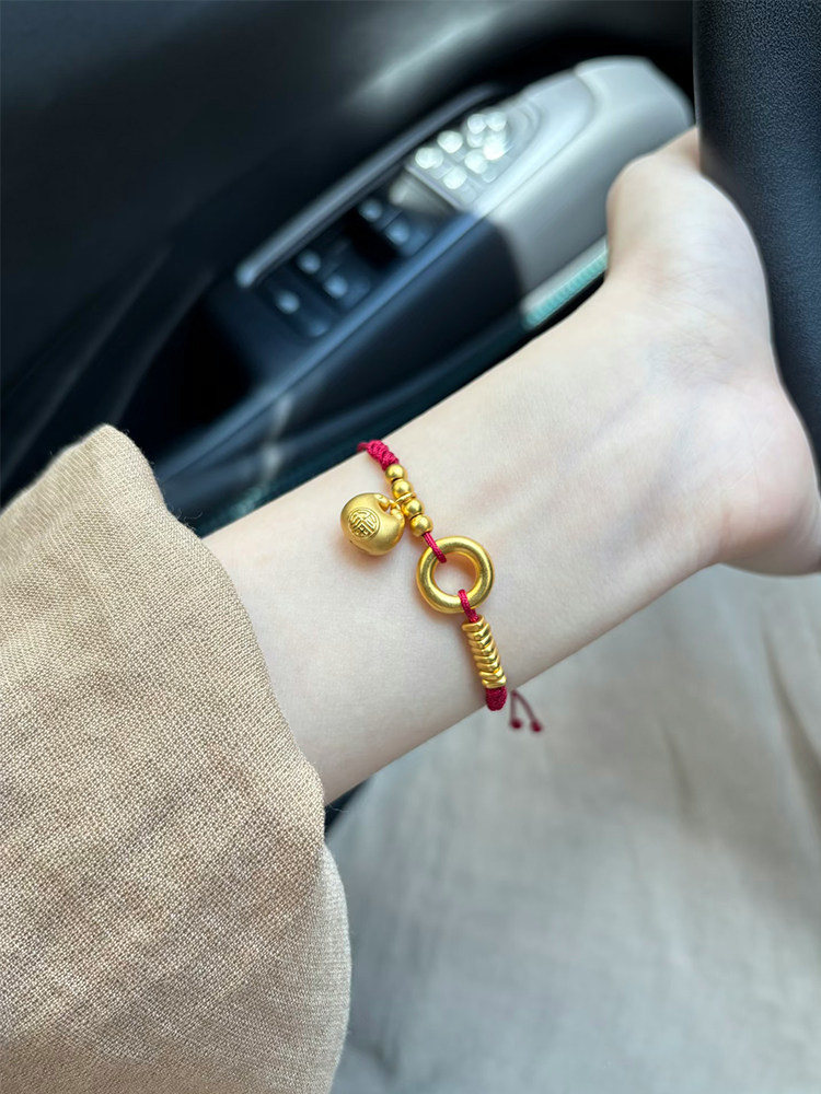 Gold Little Lucky Charm Bracelet for Women, 999 Pure Gold Safety Buckle, Fortune Beads, Small Gold Nuggets, Gold String Bracelet for Girlfriend