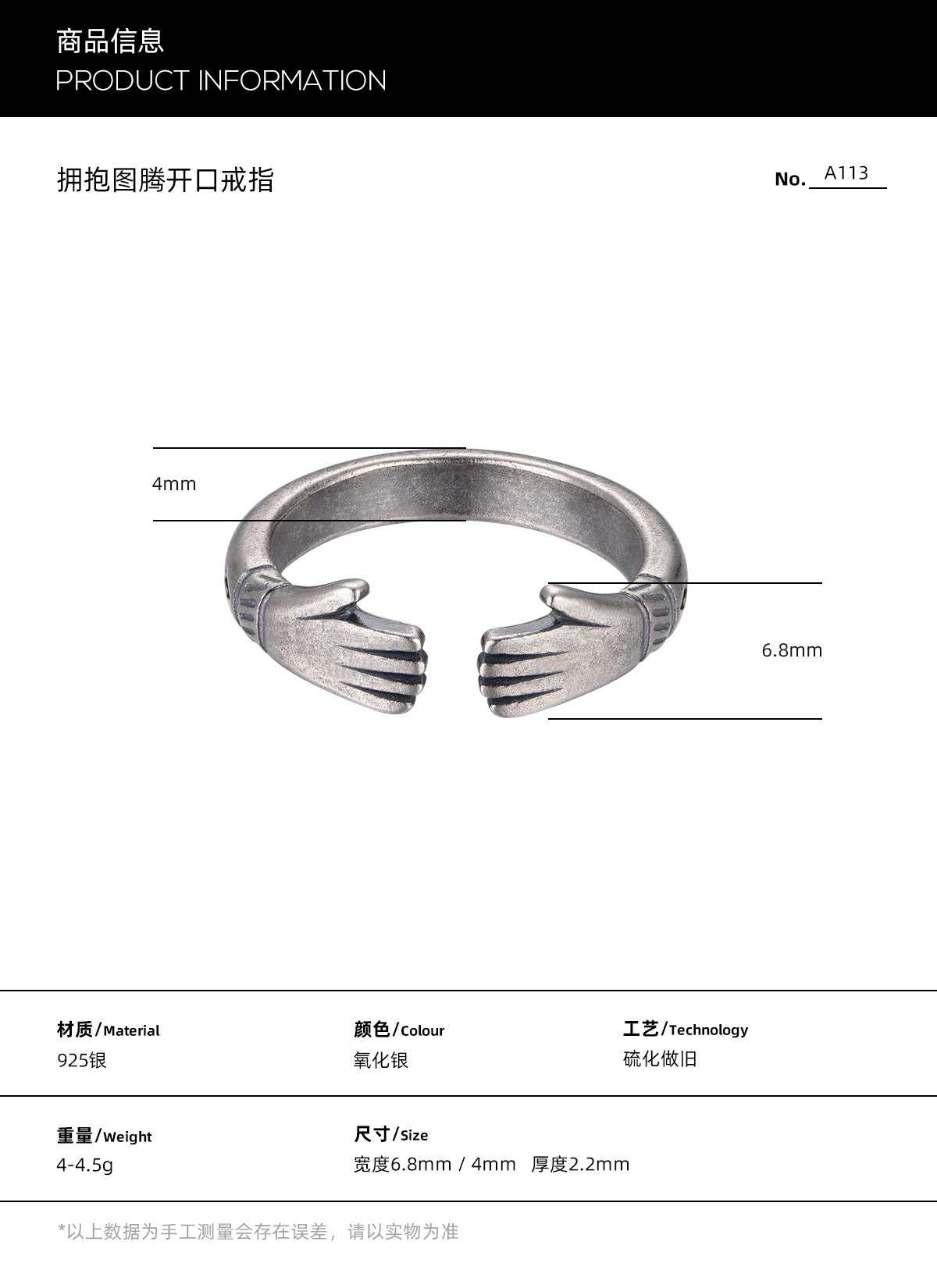 Janeng 925 Silver Embrace Totem Open Ring Vintage Distressed Pattern Personalized Silver Jewelry Ring