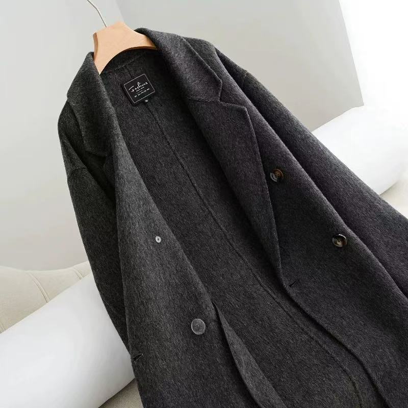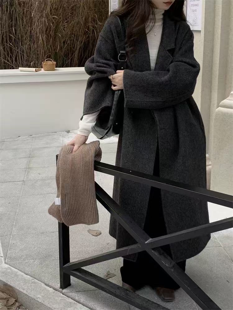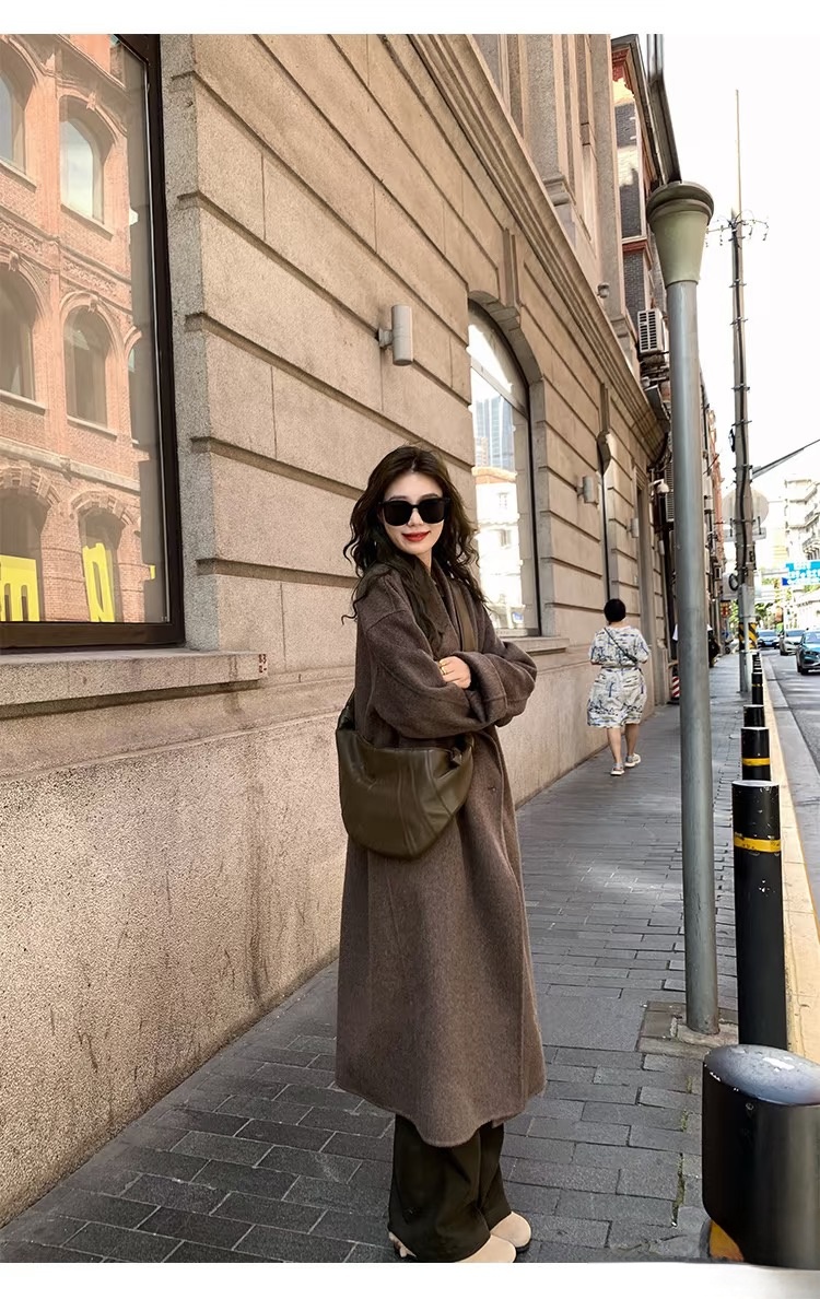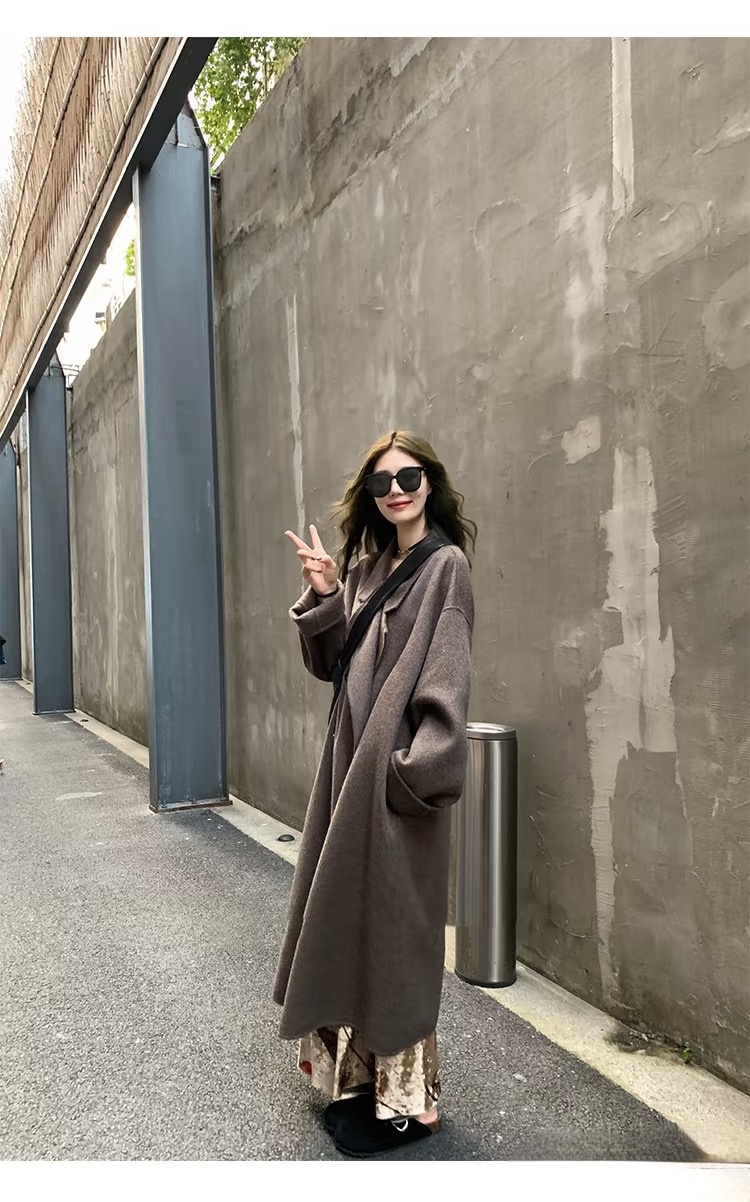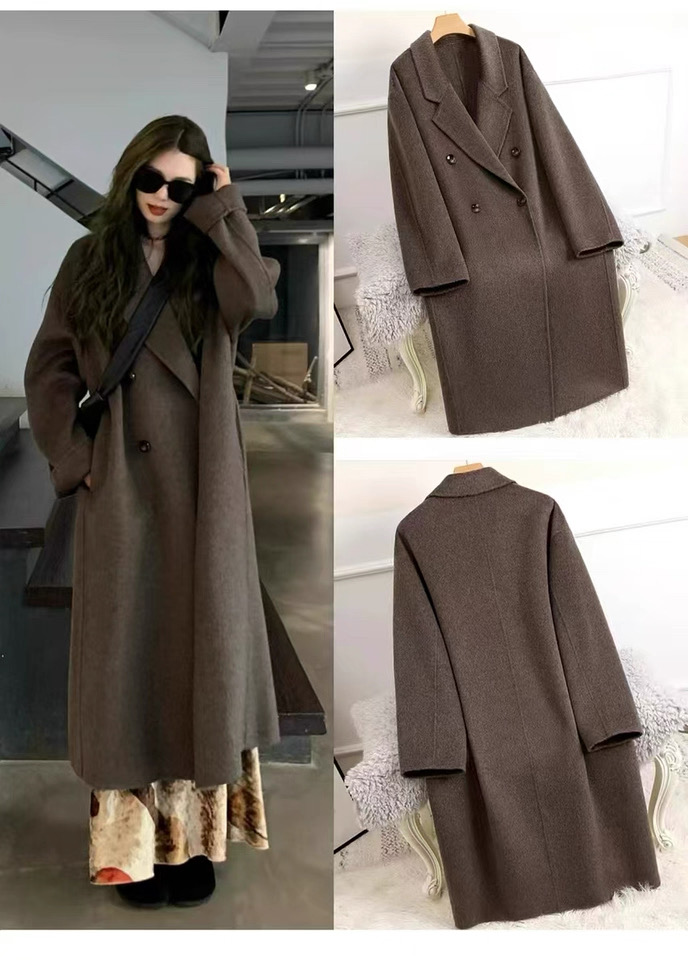 Mocha Brown Double-Sided Cashmere Coat for Women, Mid-Length, Lazy Style, 2025 New Korean Style Loose Woolen Coat