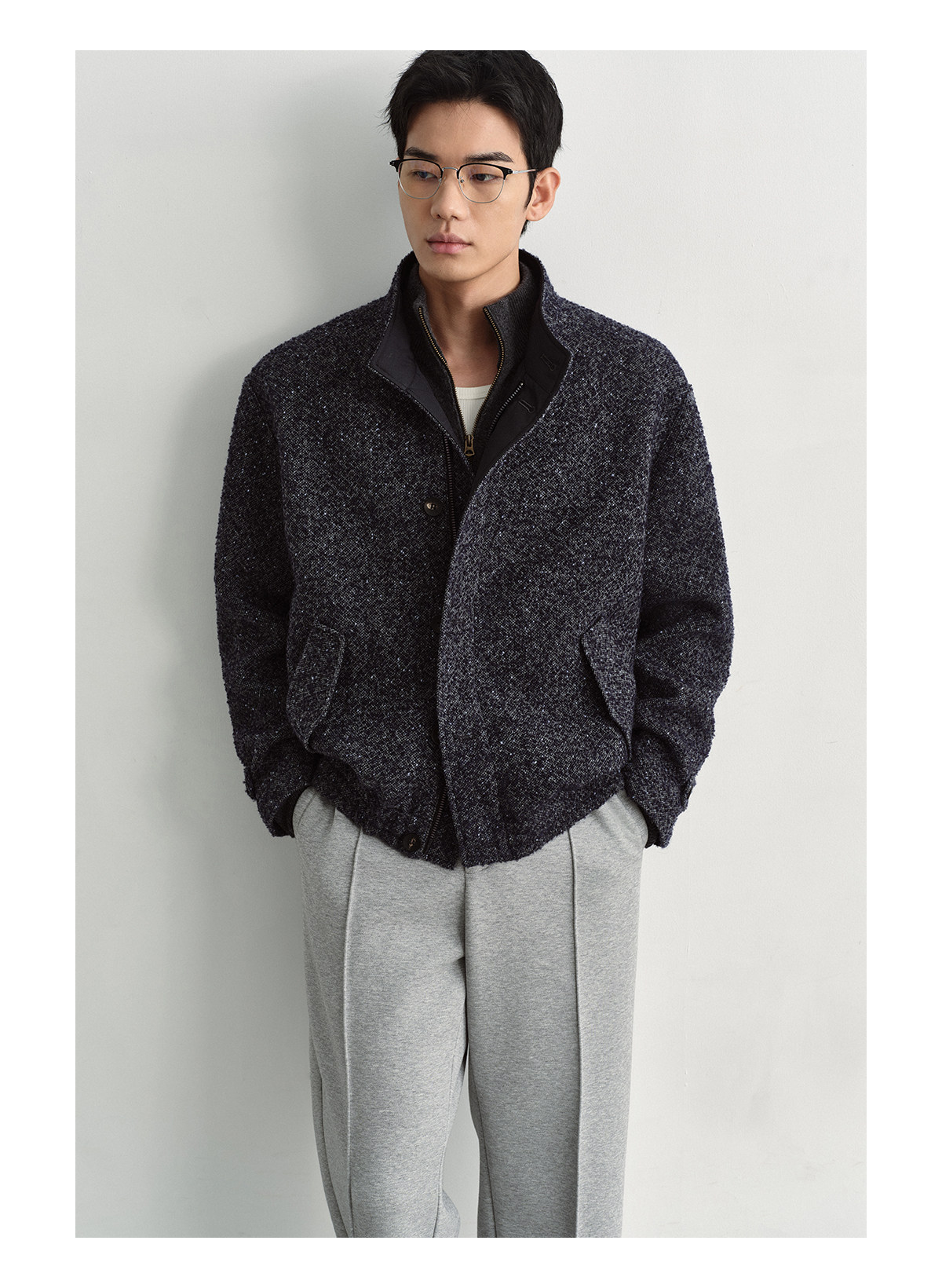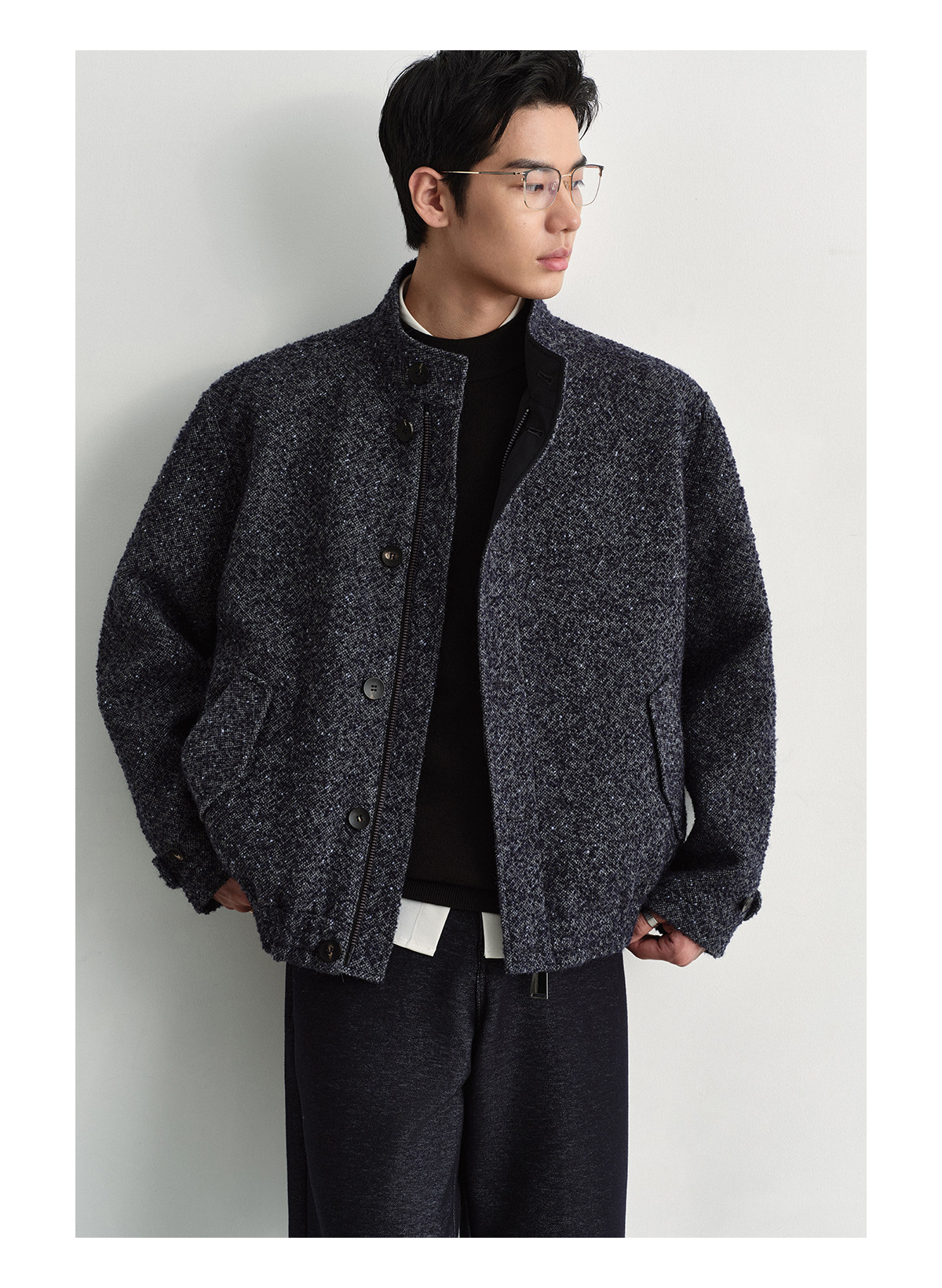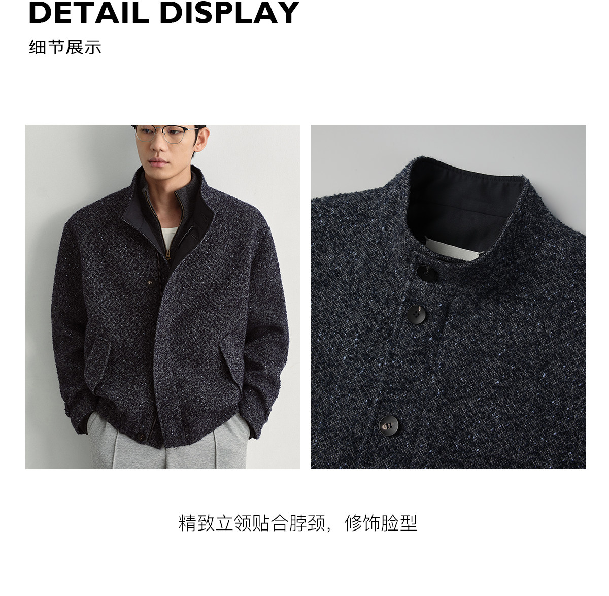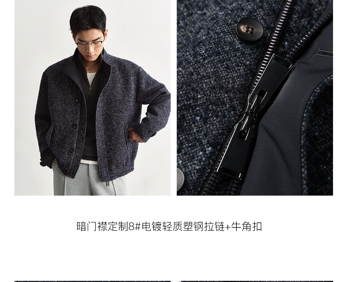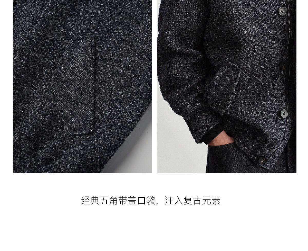 Osens Men's Clothing Wool Polka Dot Tweed Texture Stand Collar Wool Coat Retro Harrington Drop Shoulder Jacket