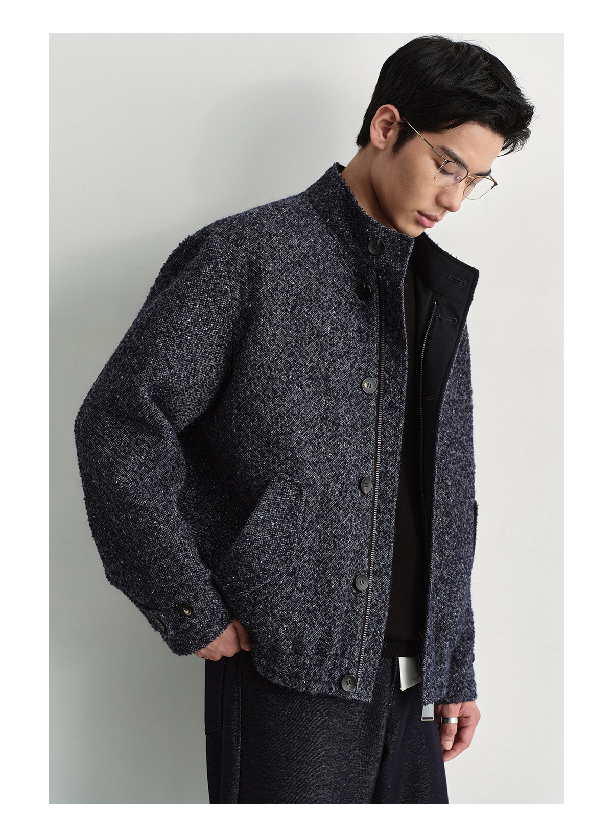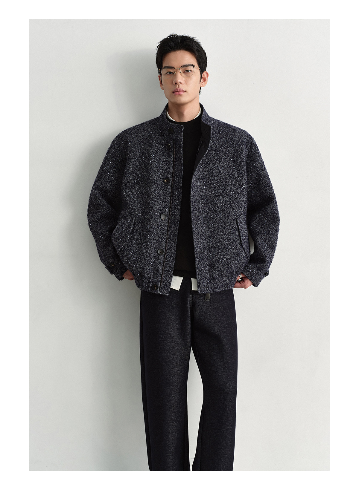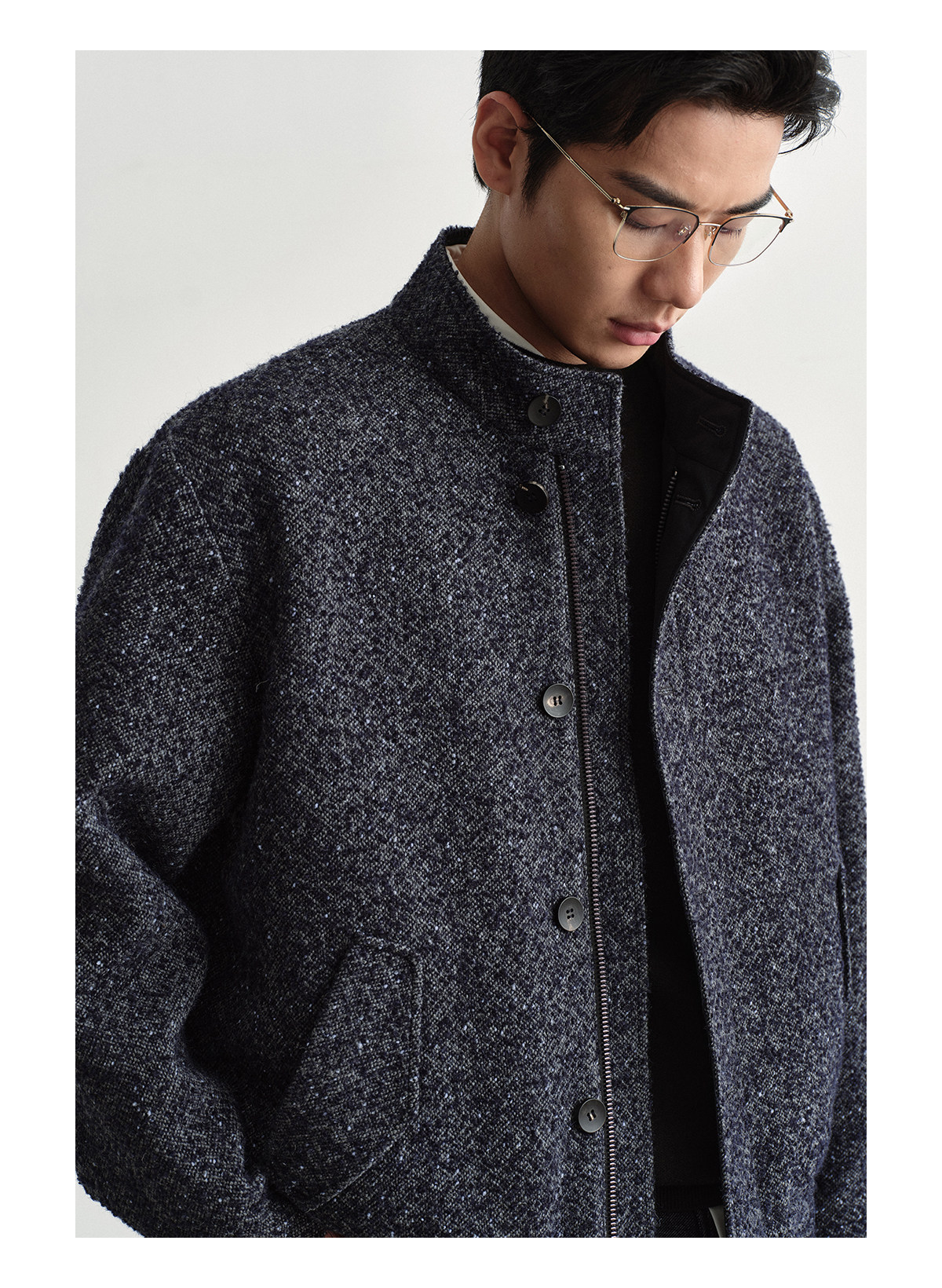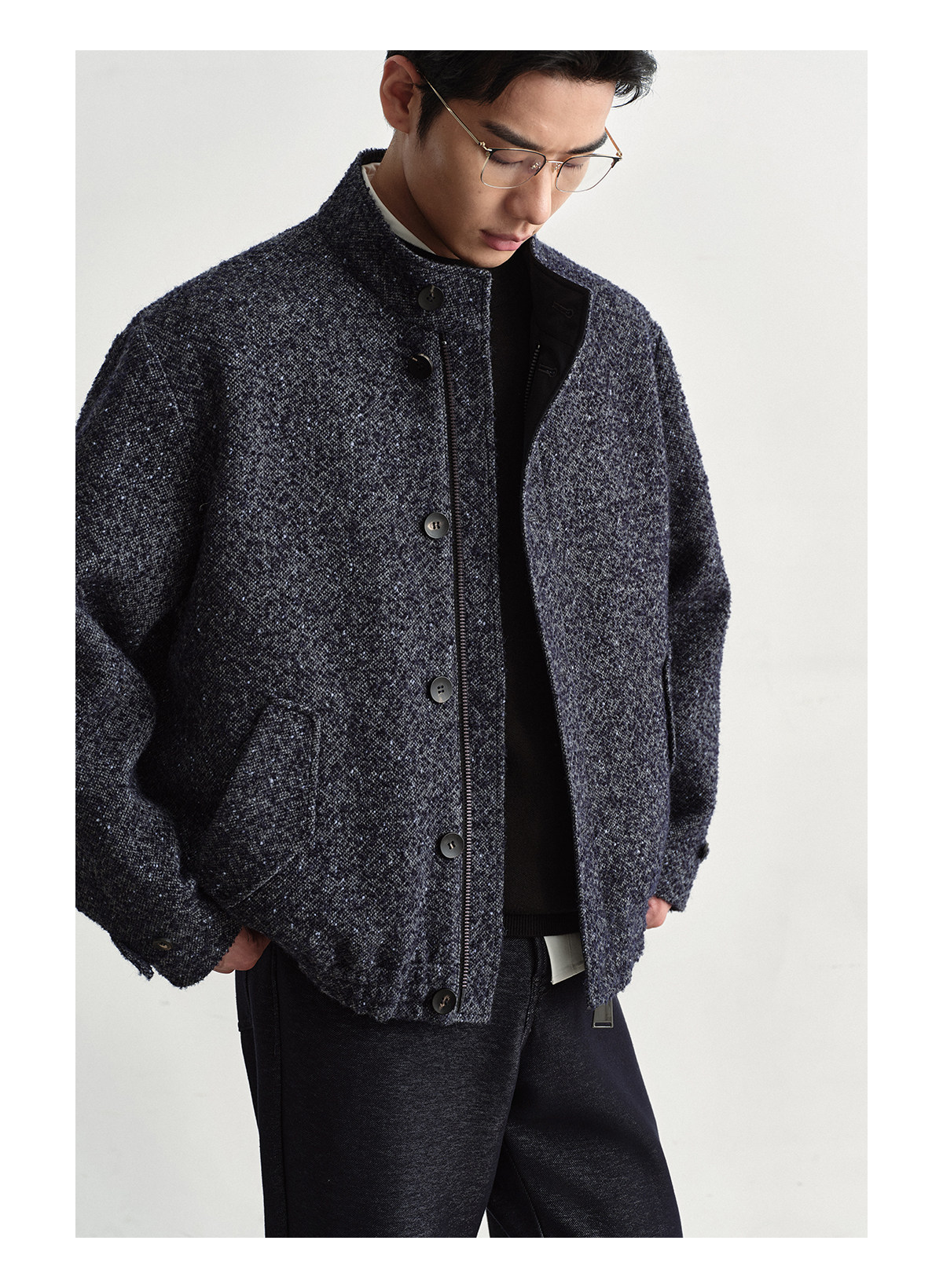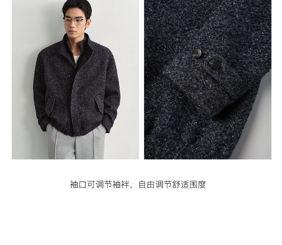 Osens Men's Clothing Wool Polka Dot Tweed Texture Stand Collar Wool Coat Retro Harrington Drop Shoulder Jacket