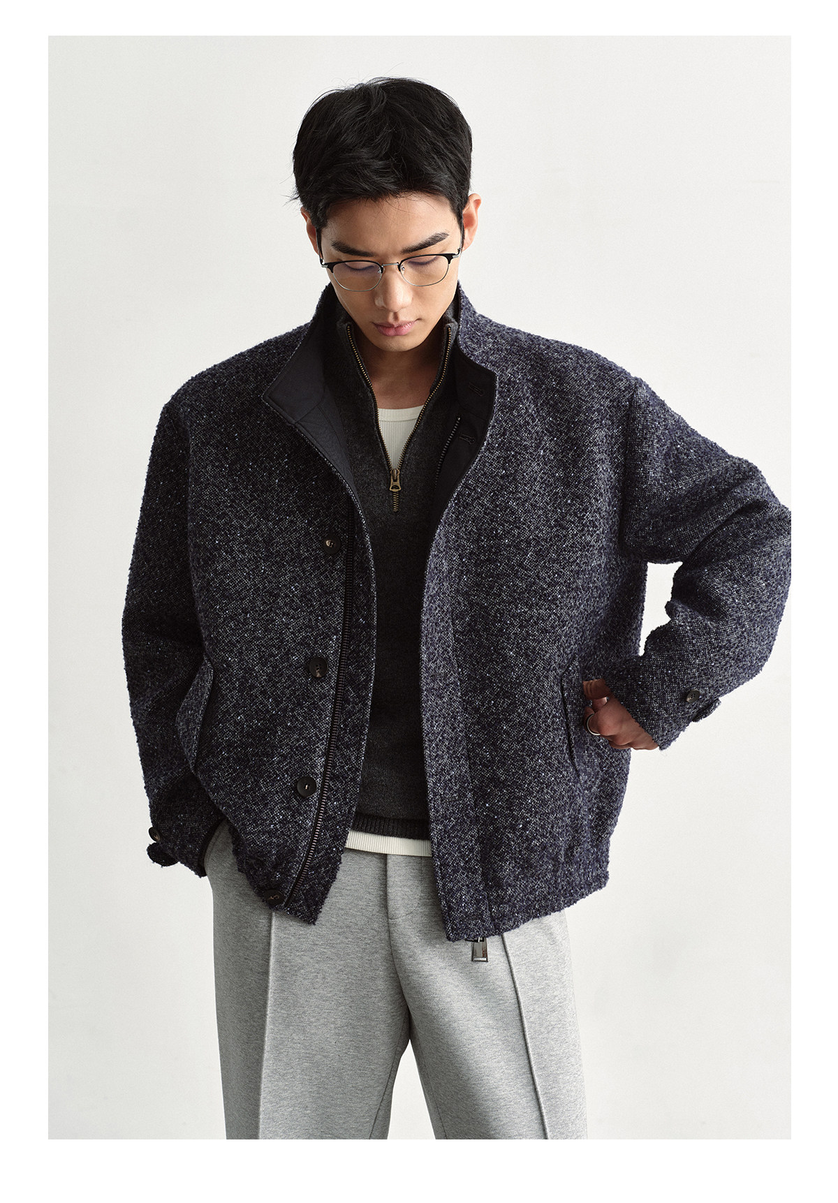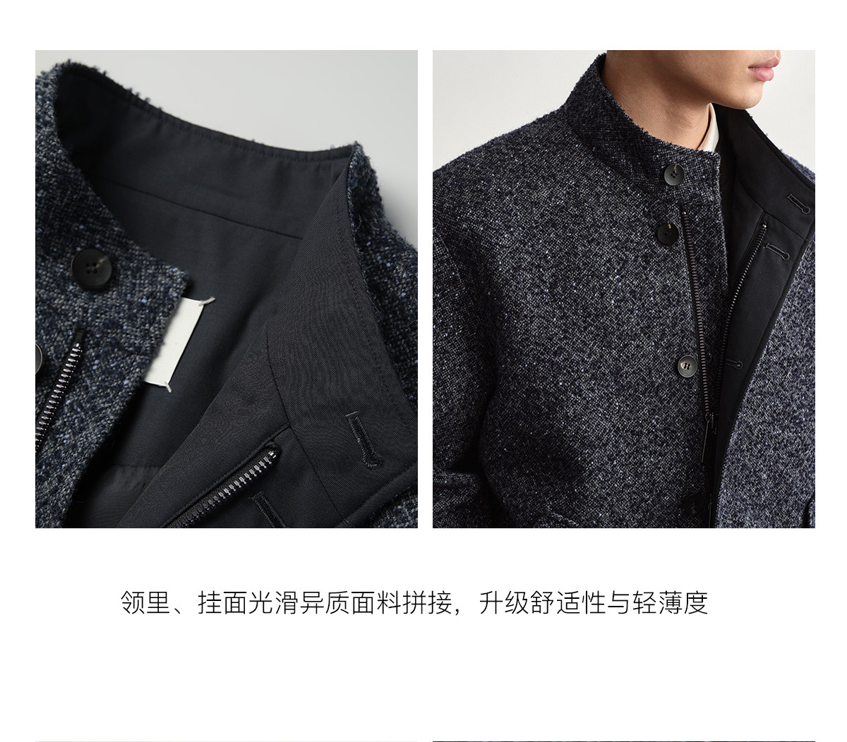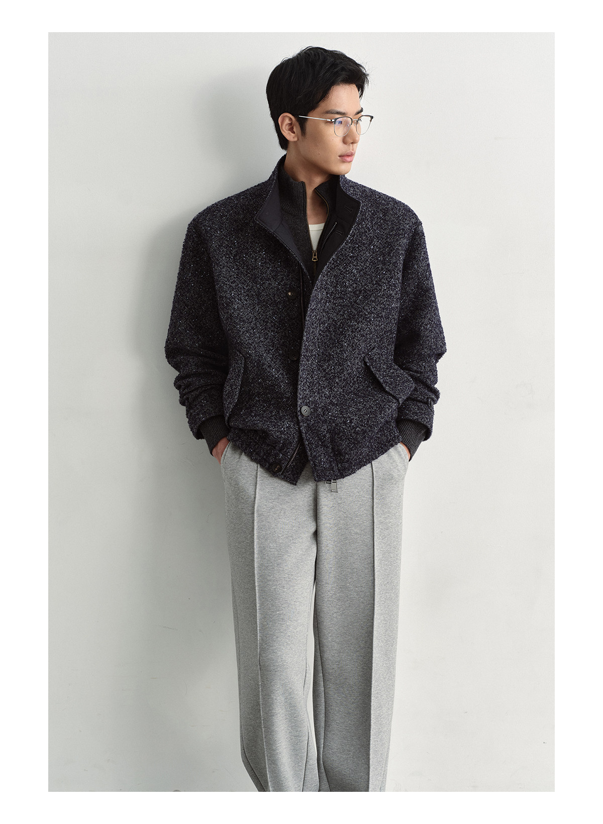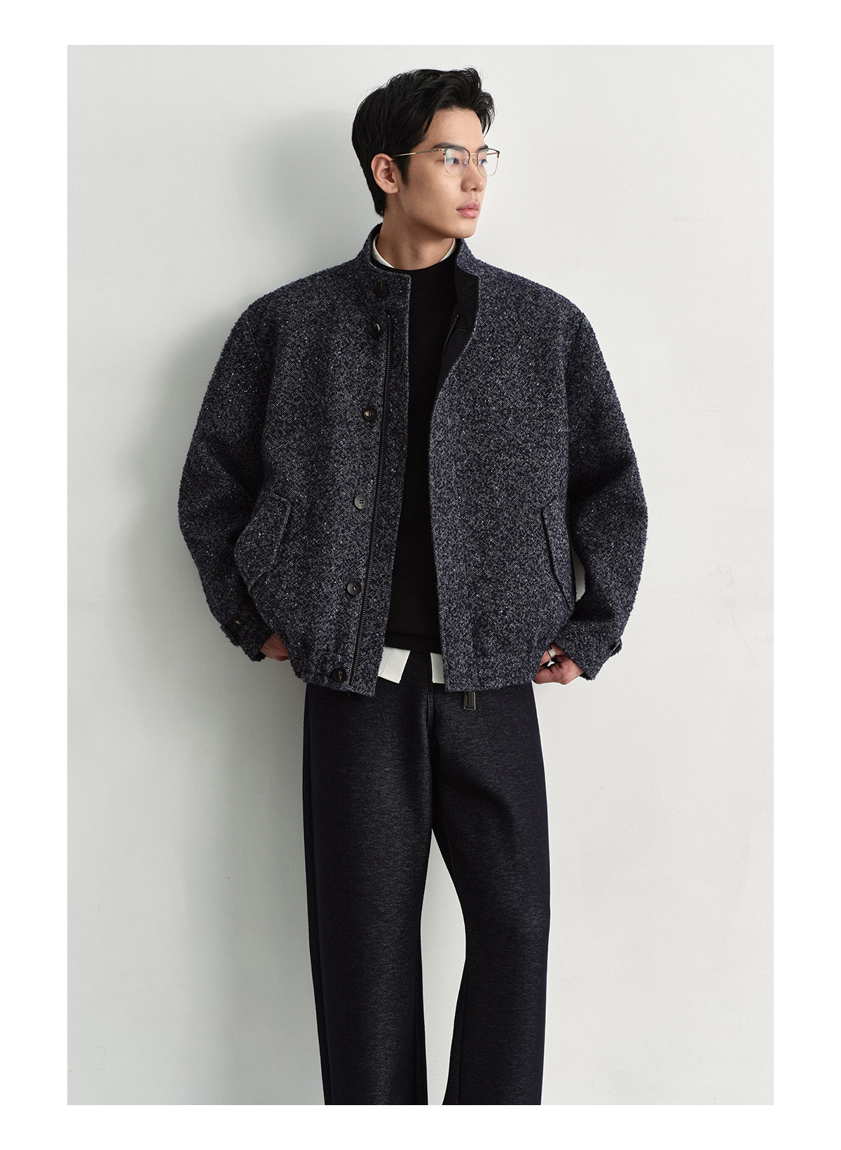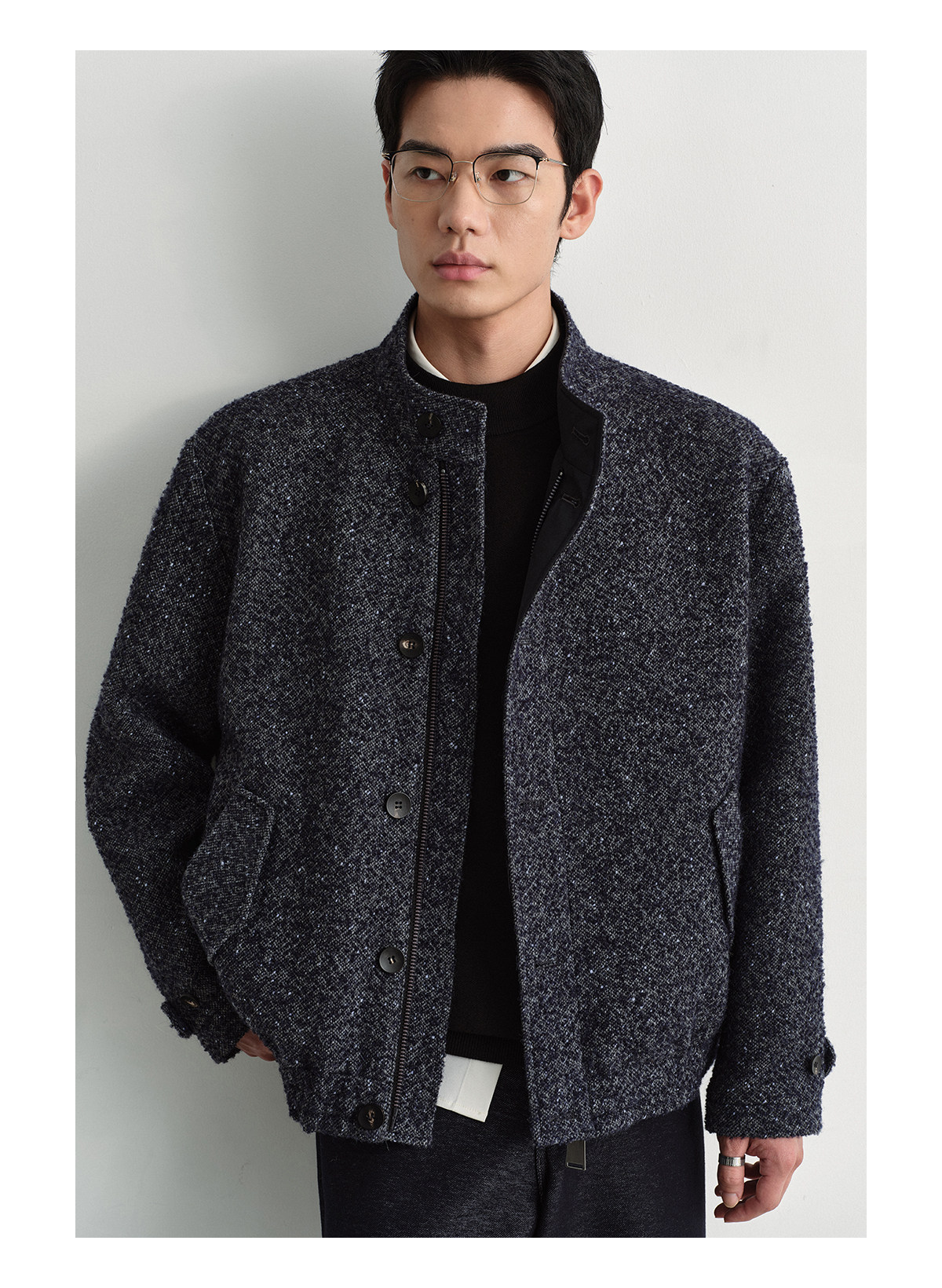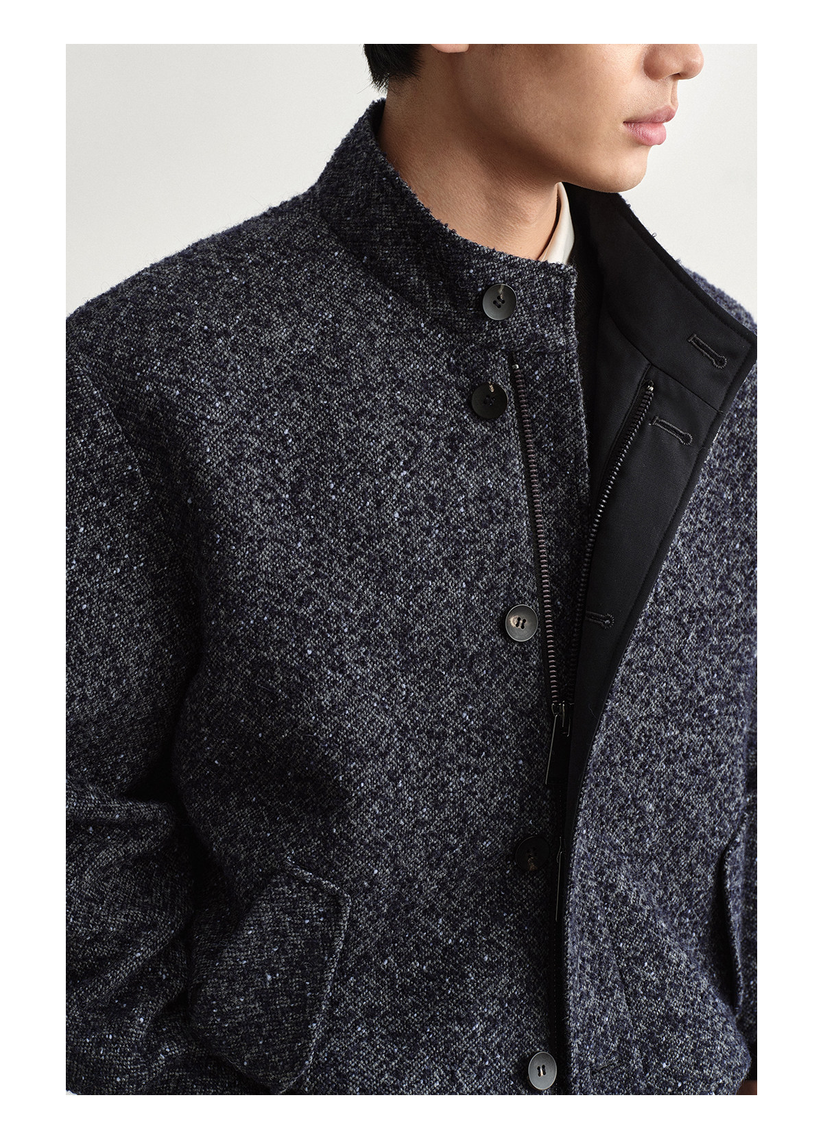 Osens Men's Clothing Wool Polka Dot Tweed Texture Stand Collar Wool Coat Retro Harrington Drop Shoulder Jacket