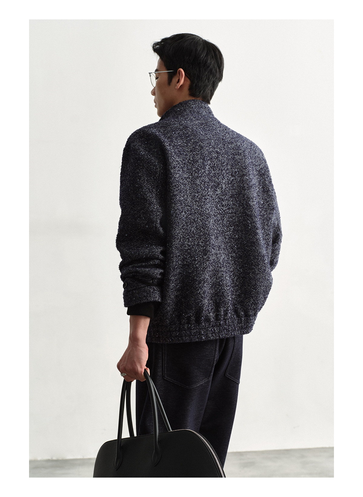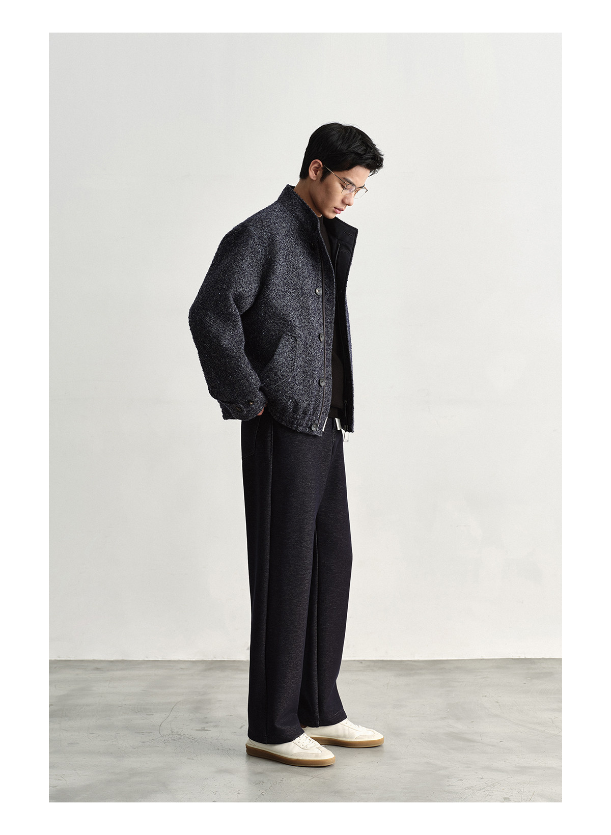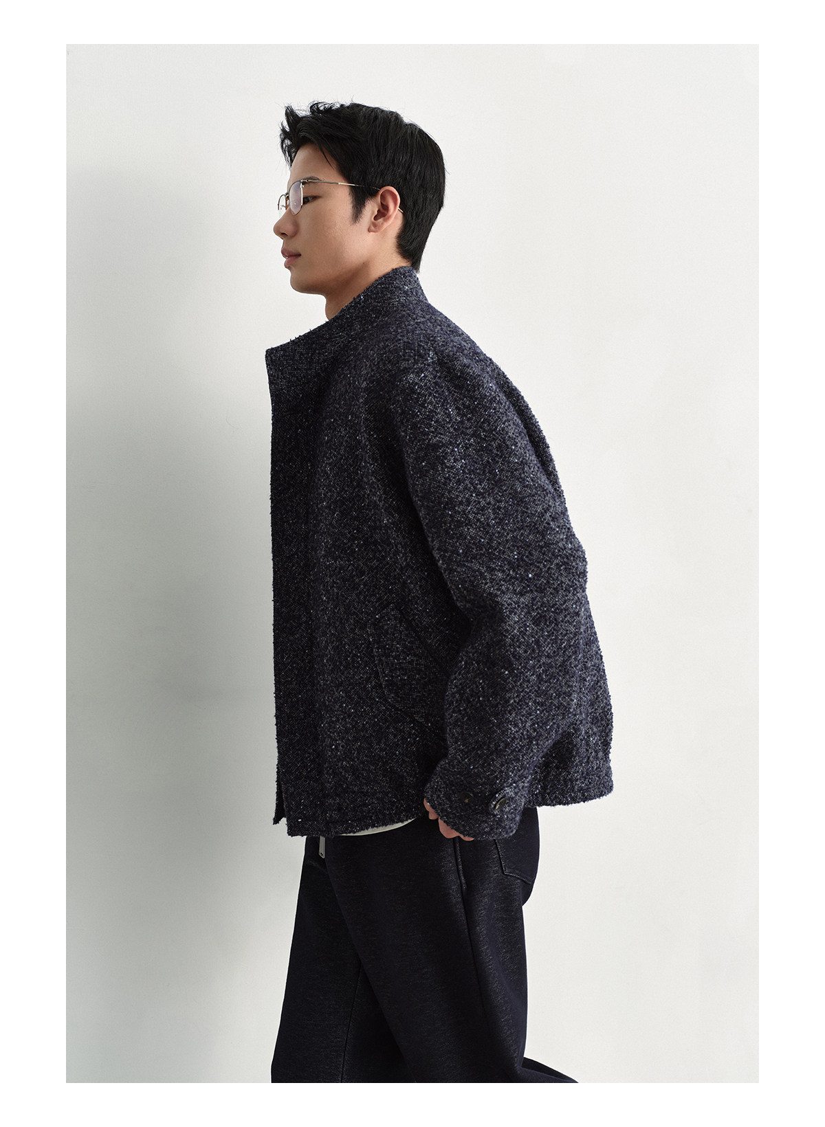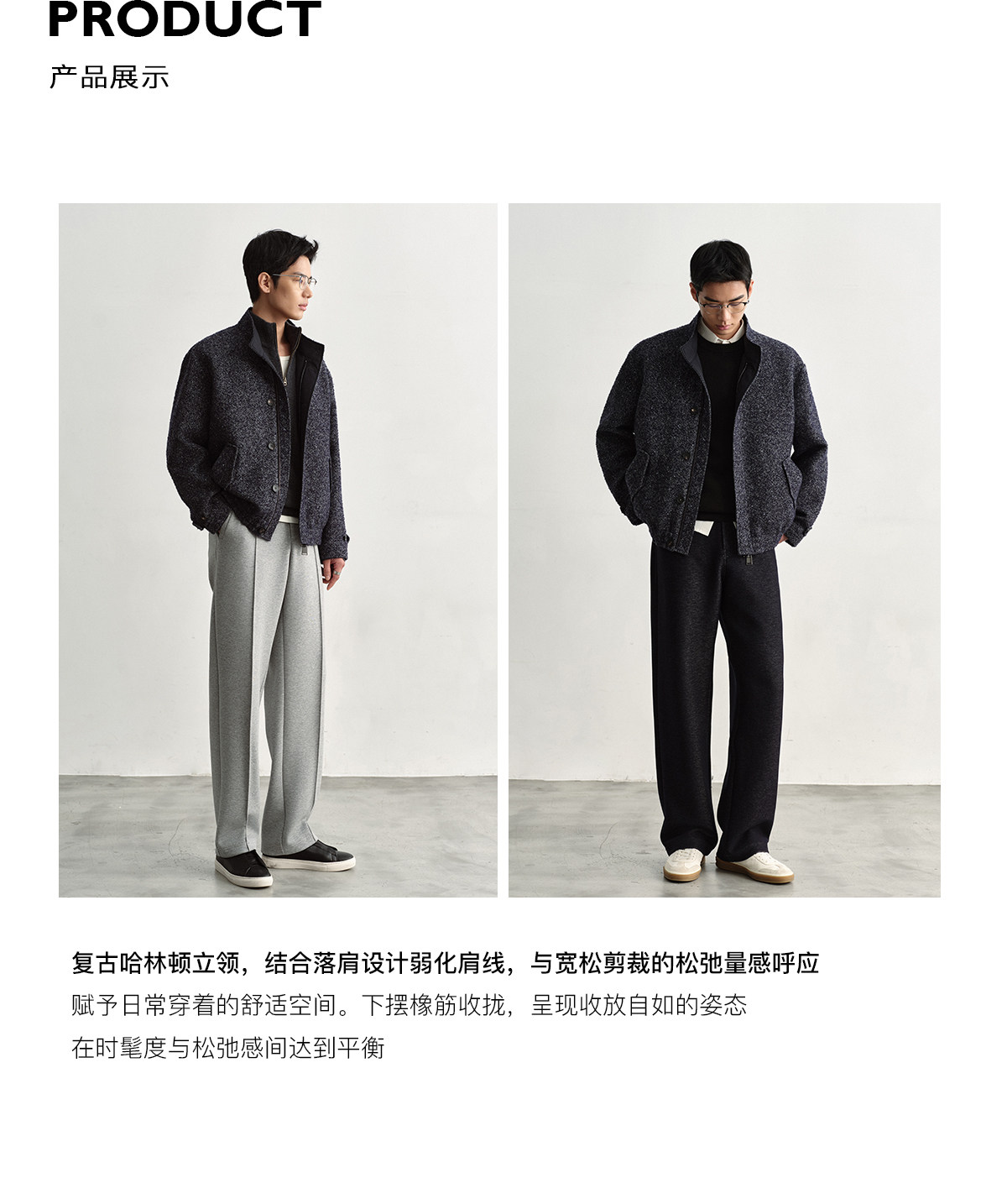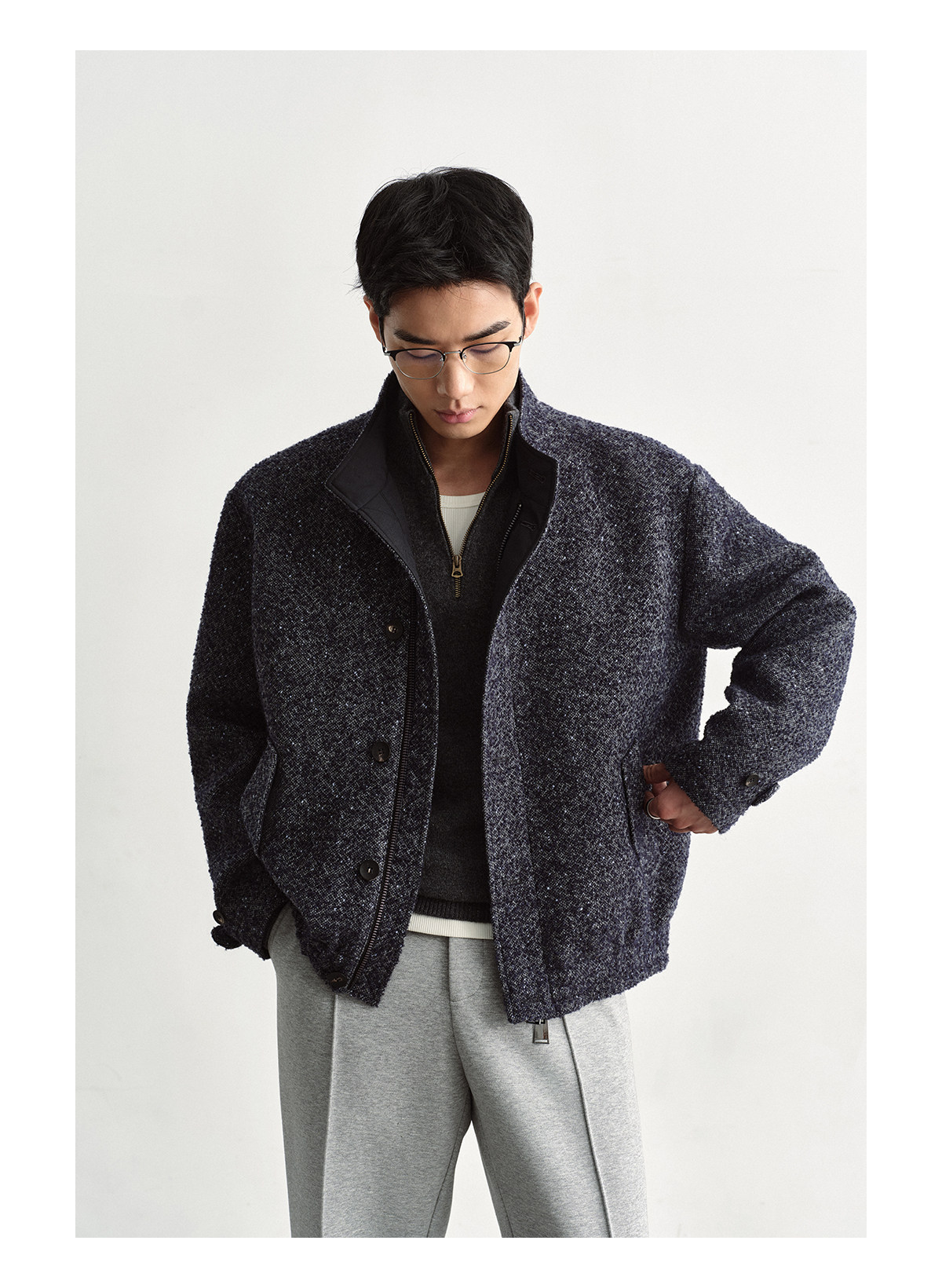 Osens Men's Clothing Wool Polka Dot Tweed Texture Stand Collar Wool Coat Retro Harrington Drop Shoulder Jacket