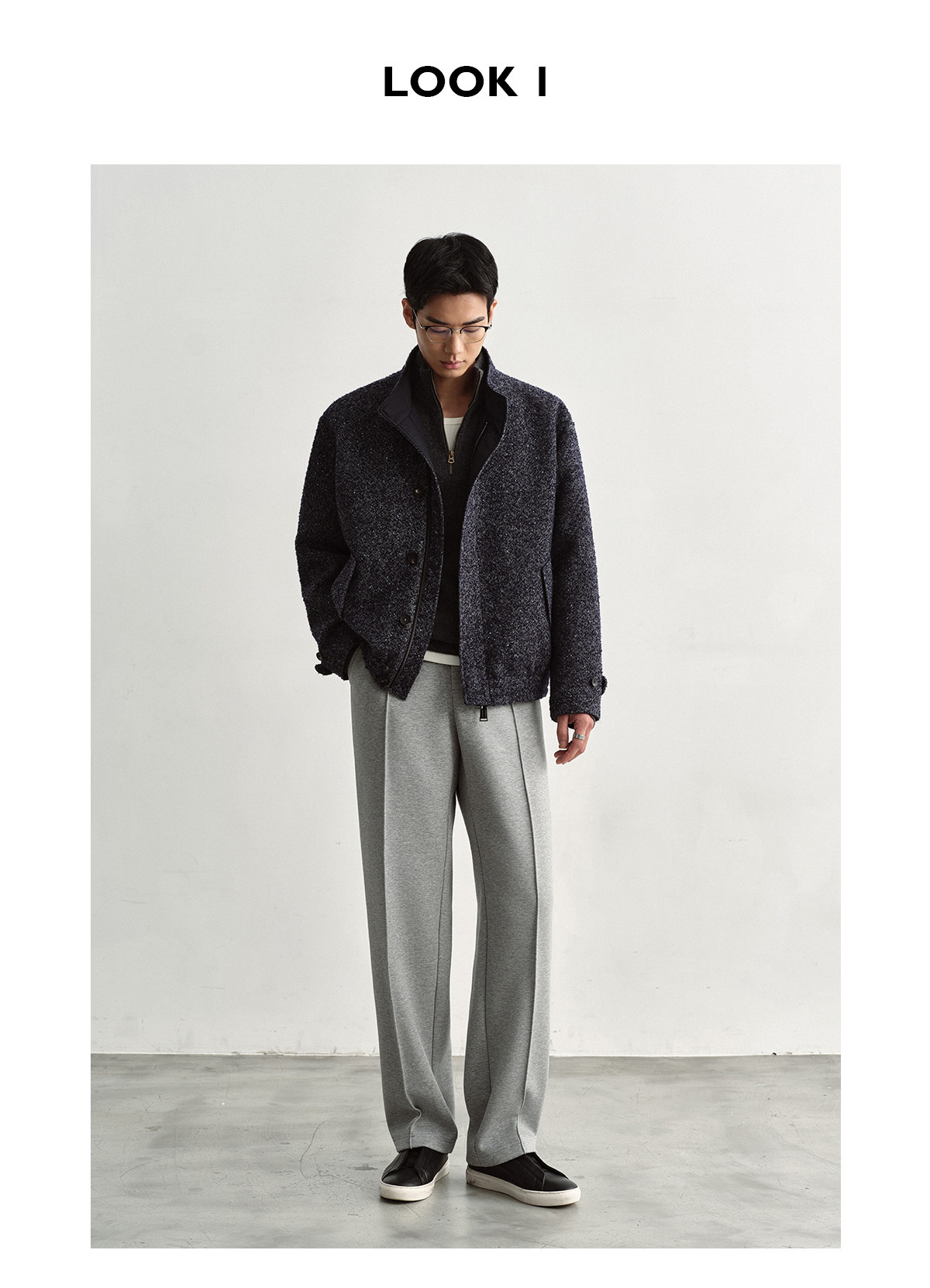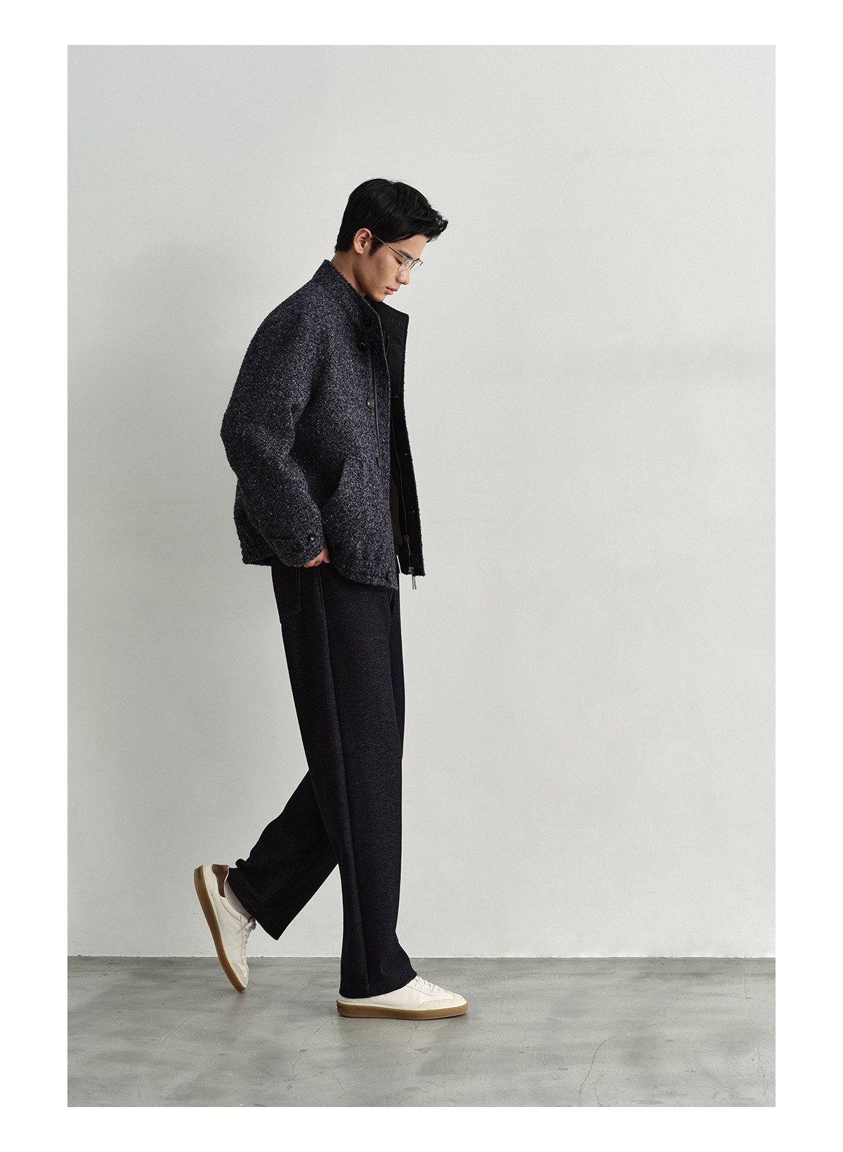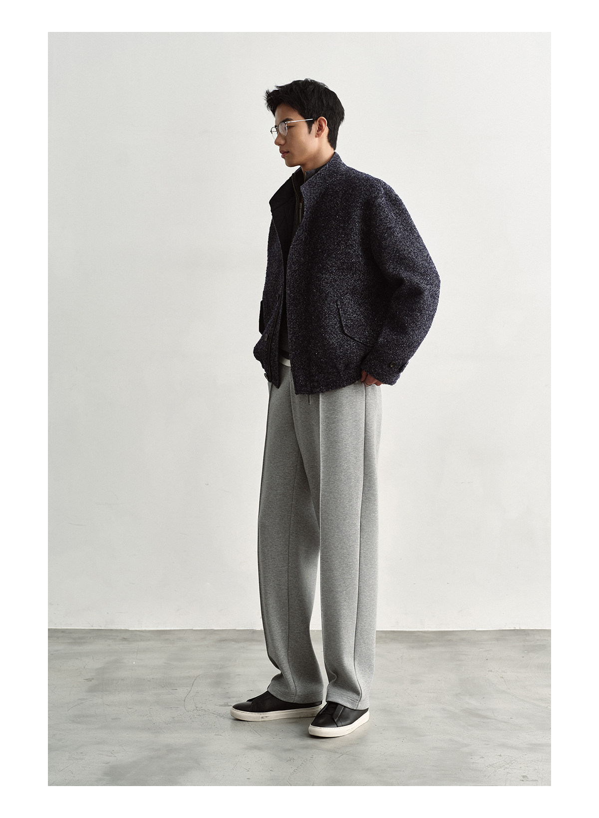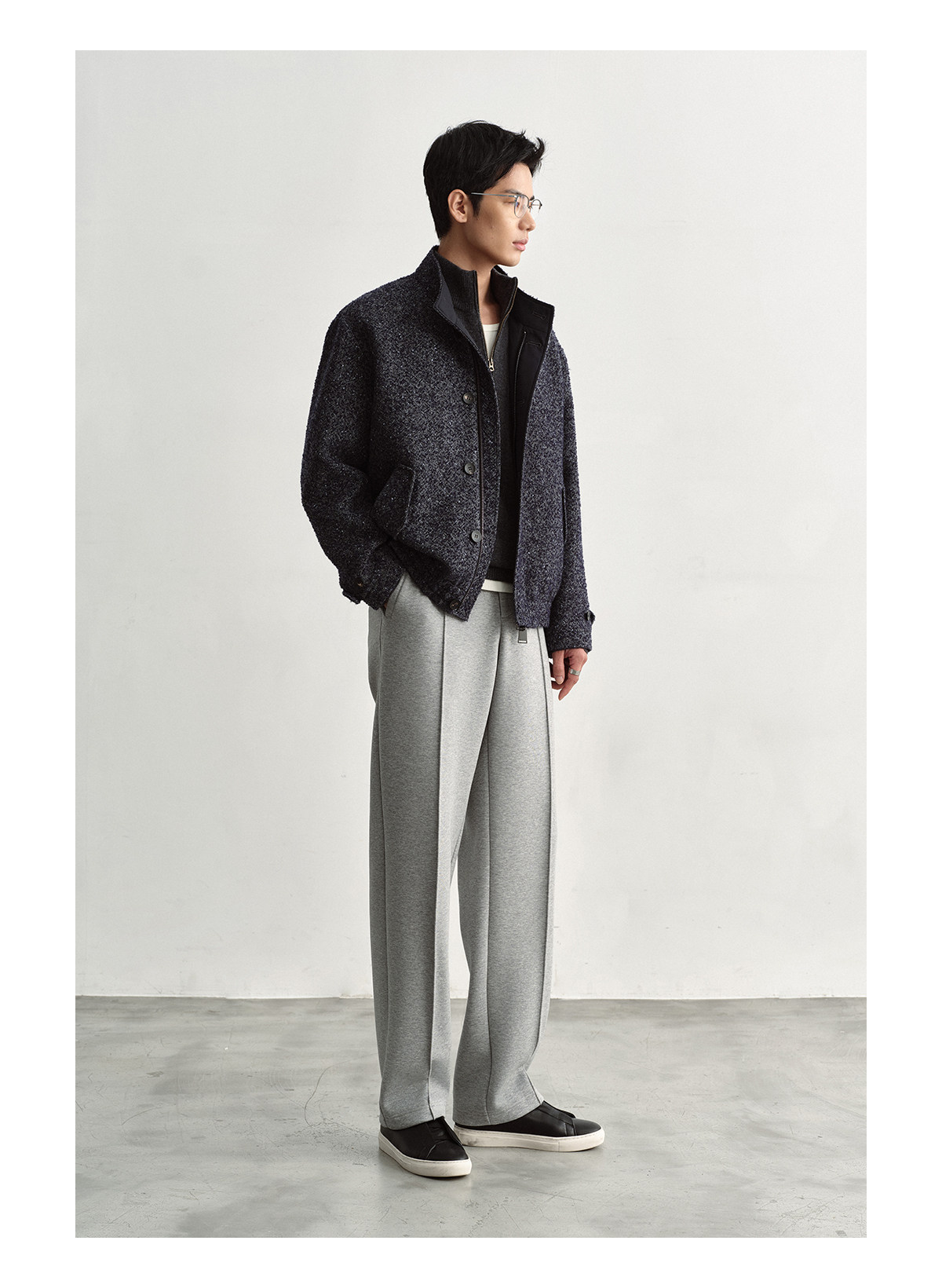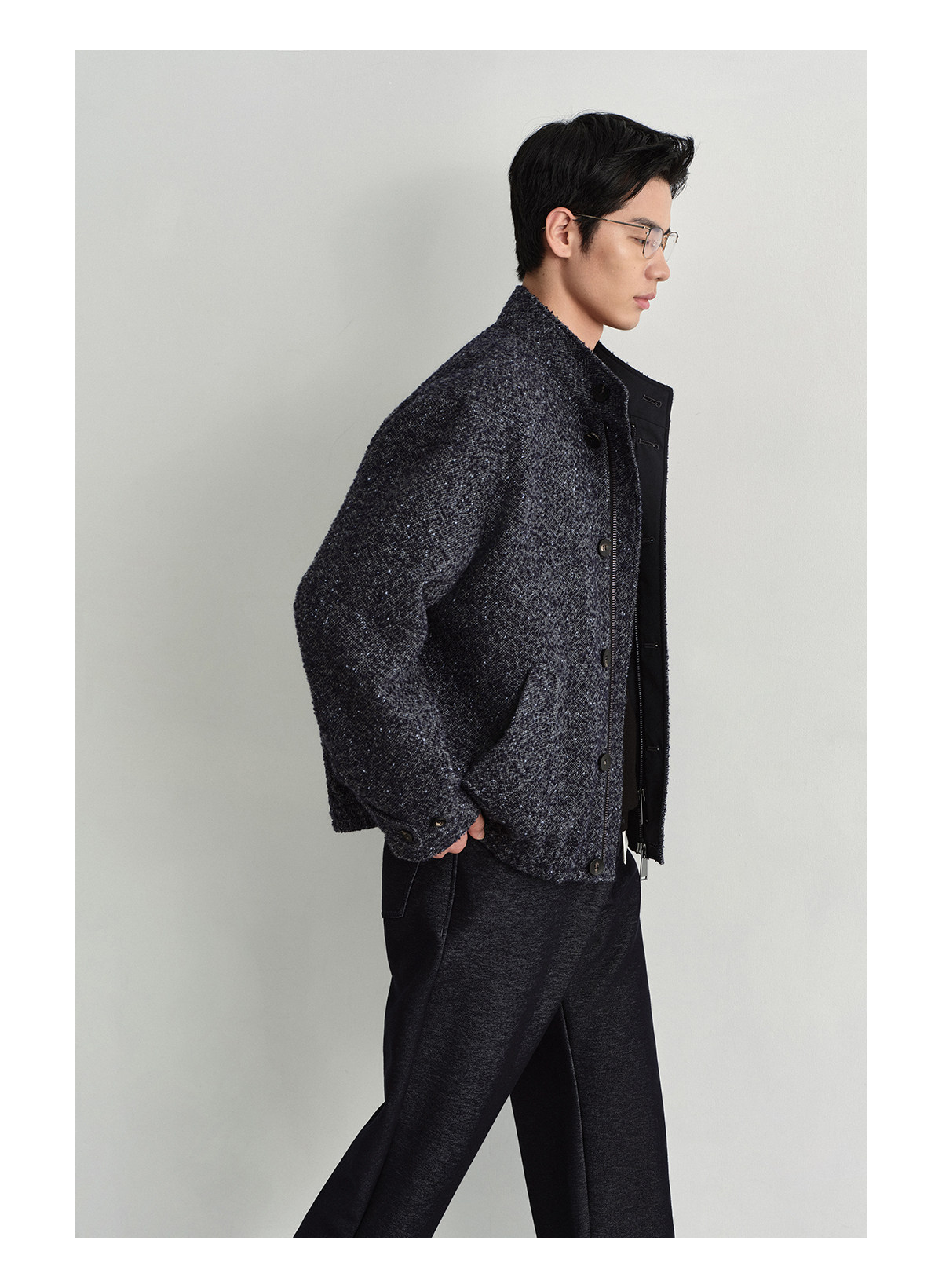 Osens Men's Clothing Wool Polka Dot Tweed Texture Stand Collar Wool Coat Retro Harrington Drop Shoulder Jacket