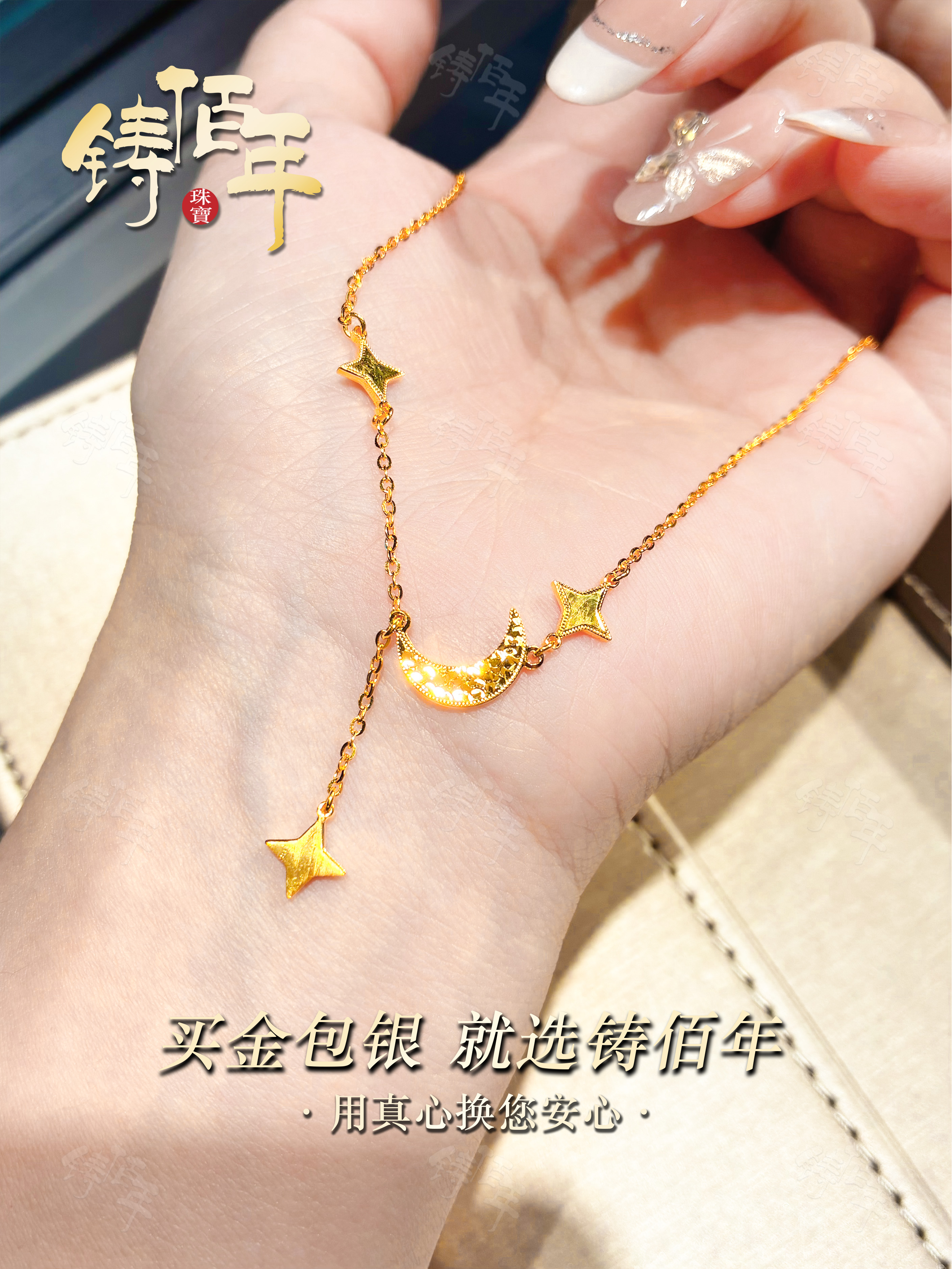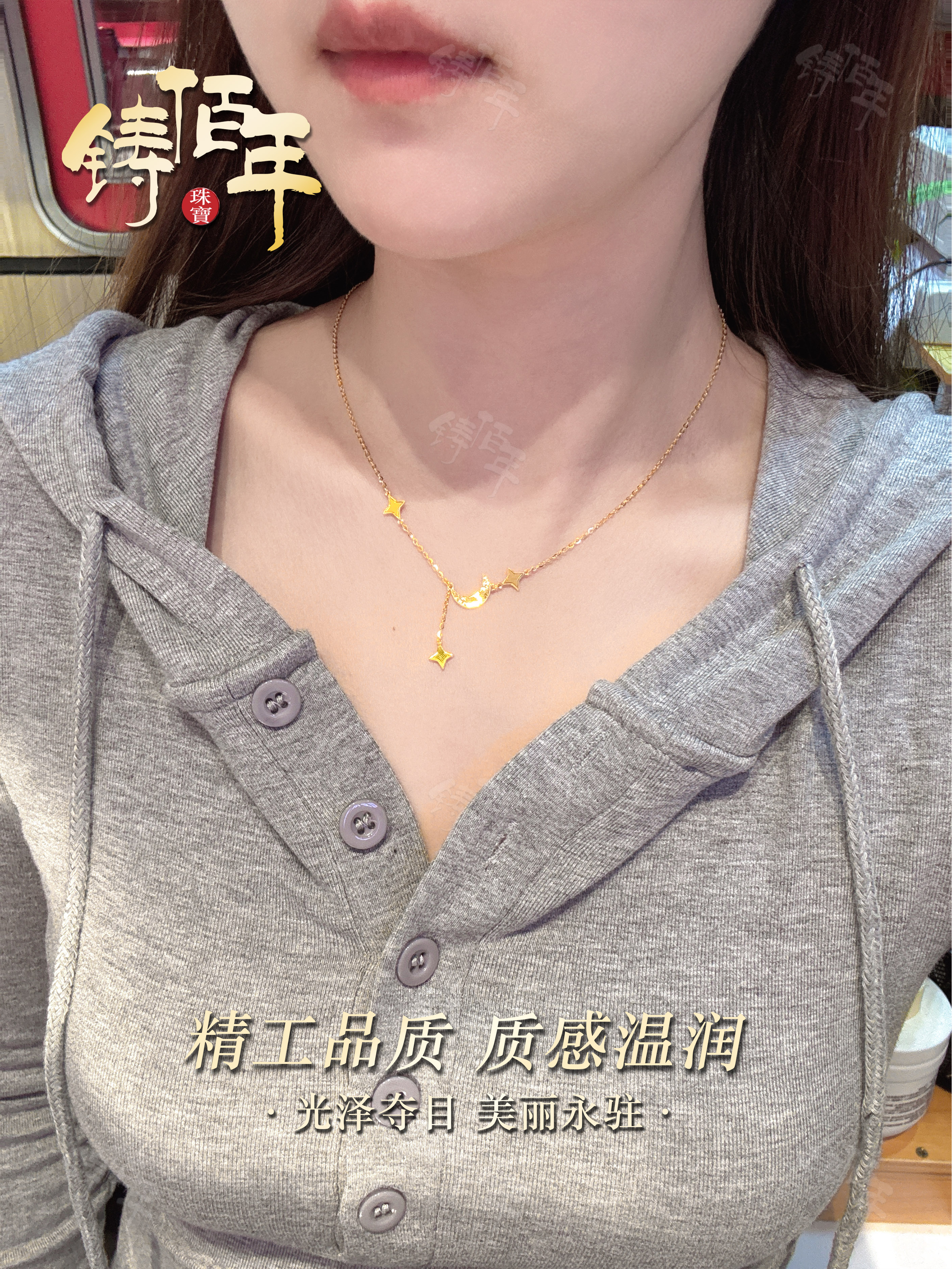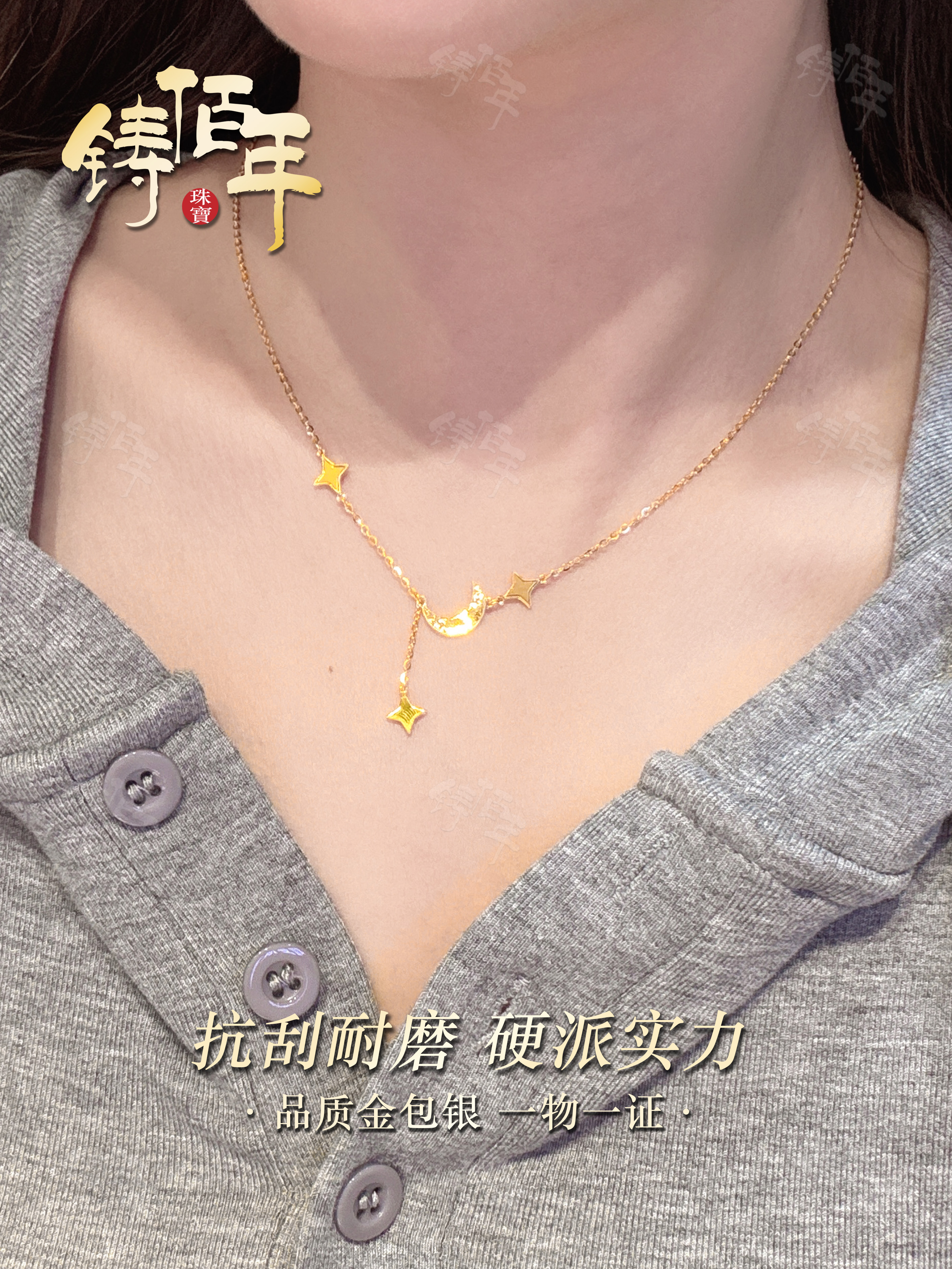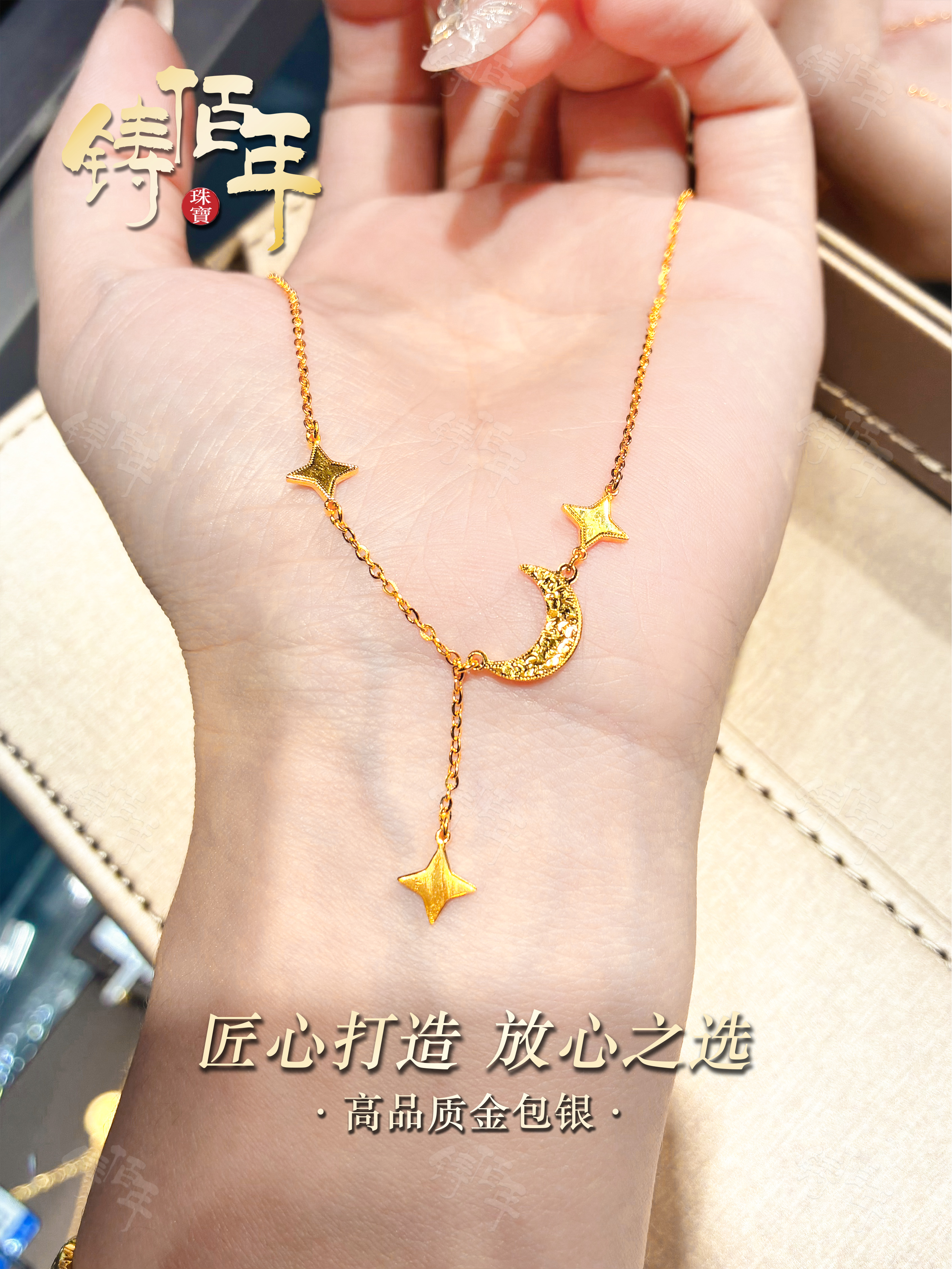 Gold-Plated Silver Crushed Ice Star and Moon Necklace, New Chinese Style Exquisite Four-Pointed Star Tassel Clavicle Chain, High-End Versatile Women's Accessory