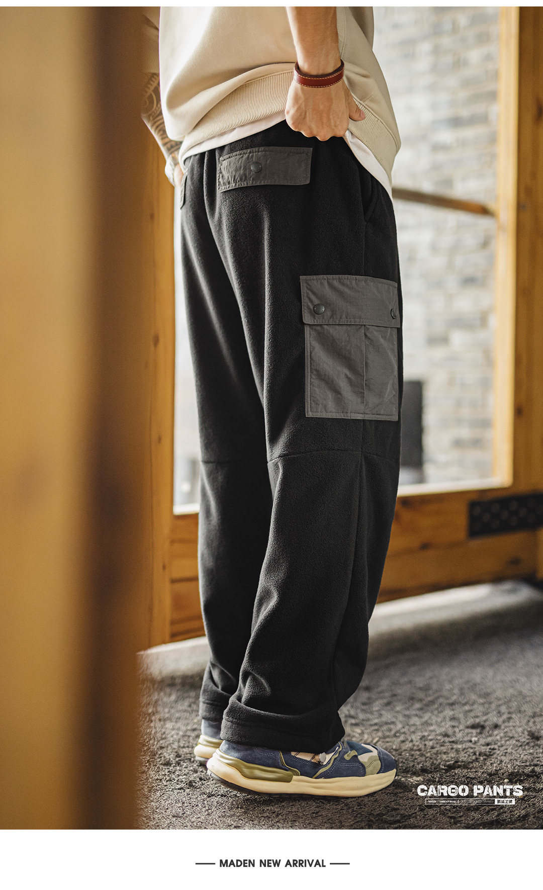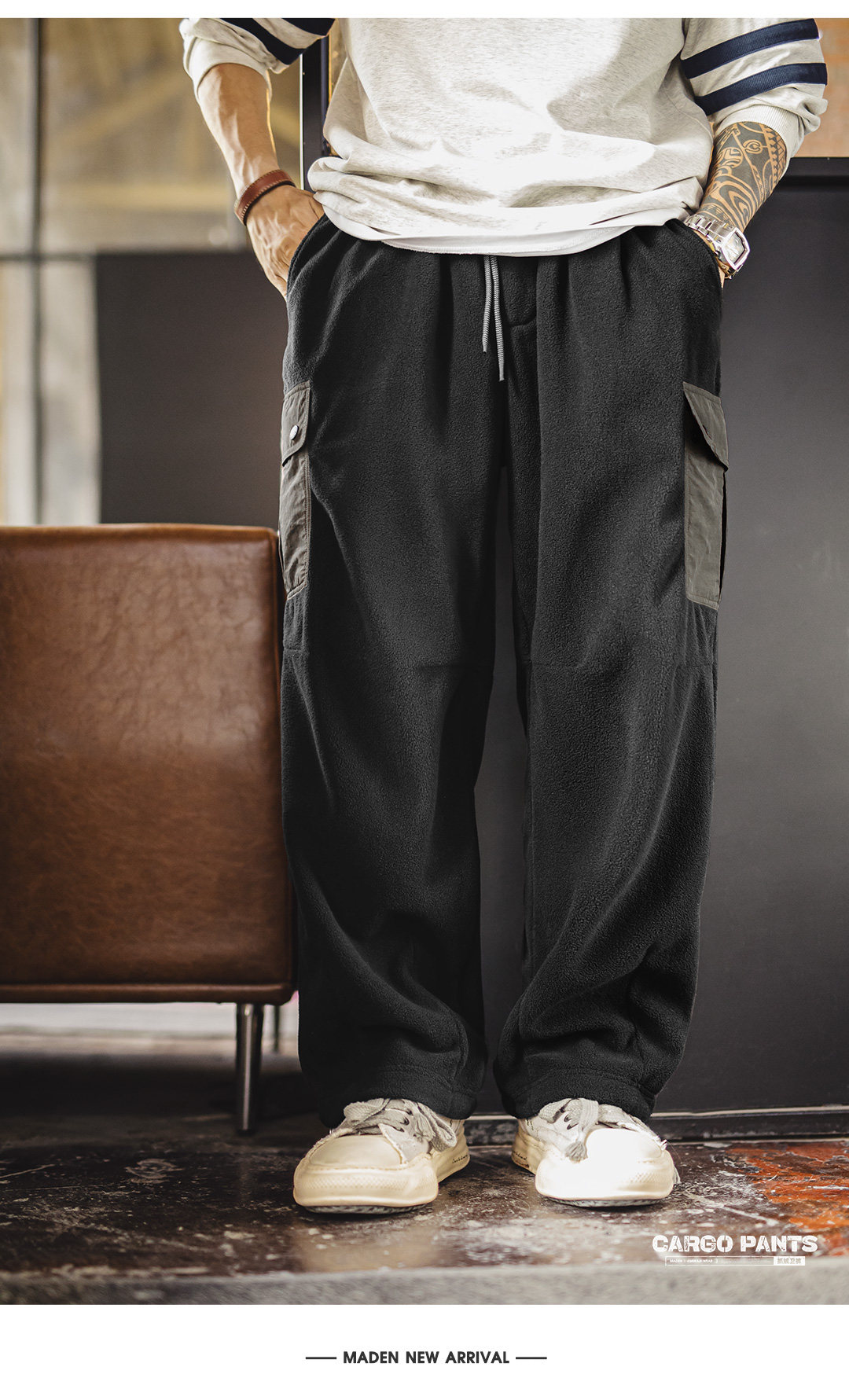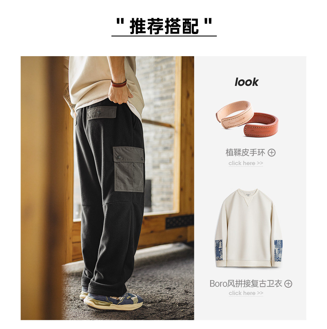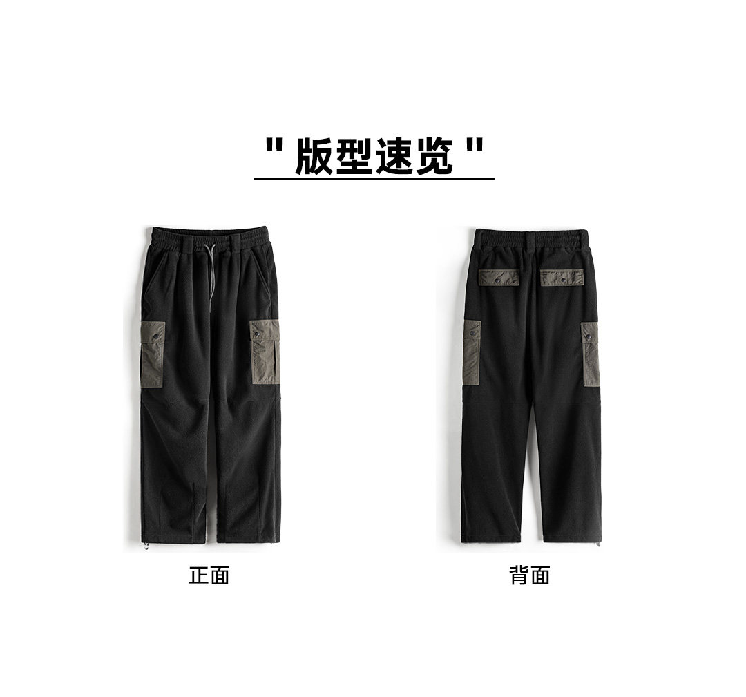 Madden Workwear American Retro Double-Sided Fleece Sweatpants with Cuffs, Warm Black Multi-Pocket Casual Pants for Men in Winter