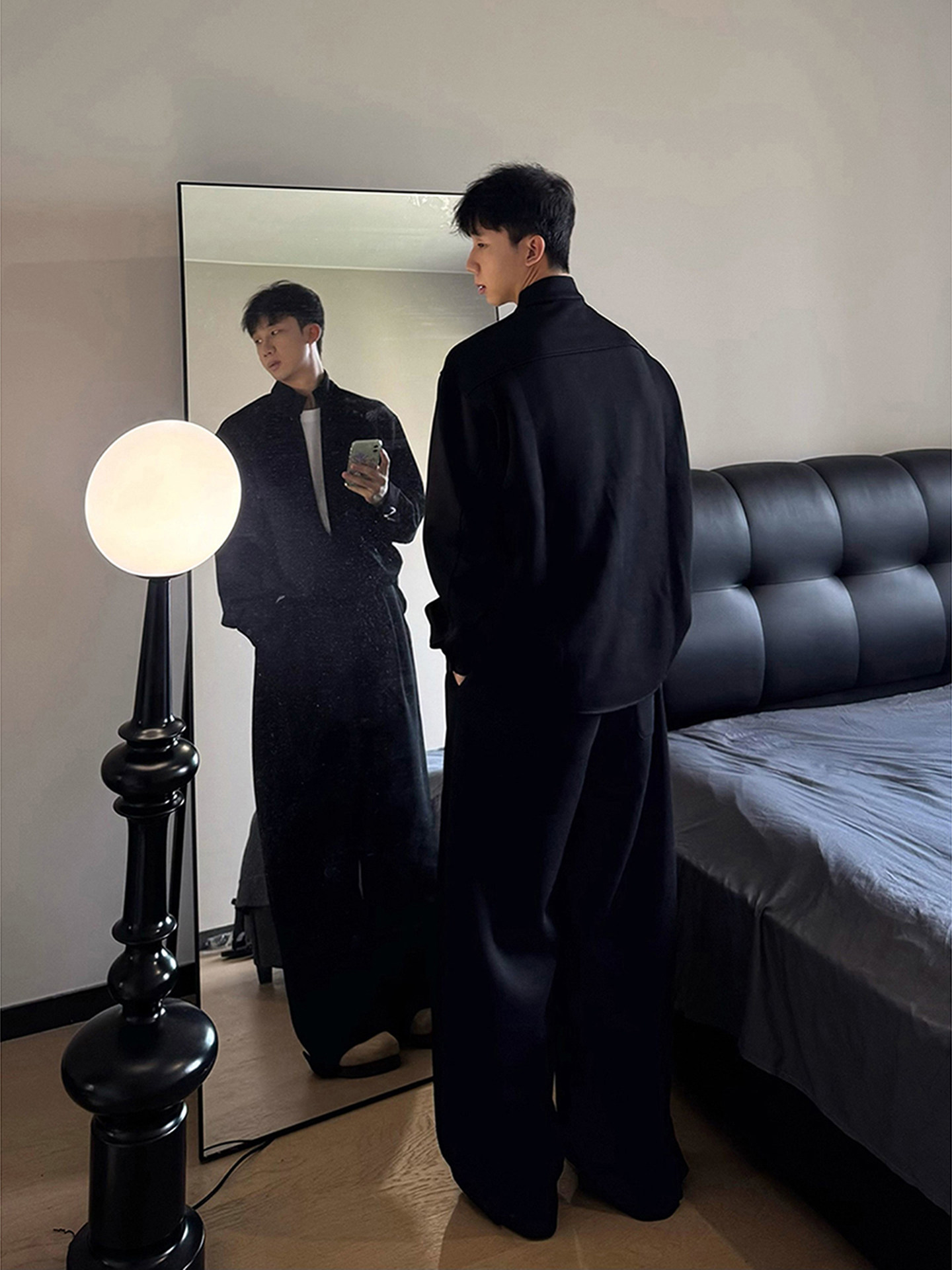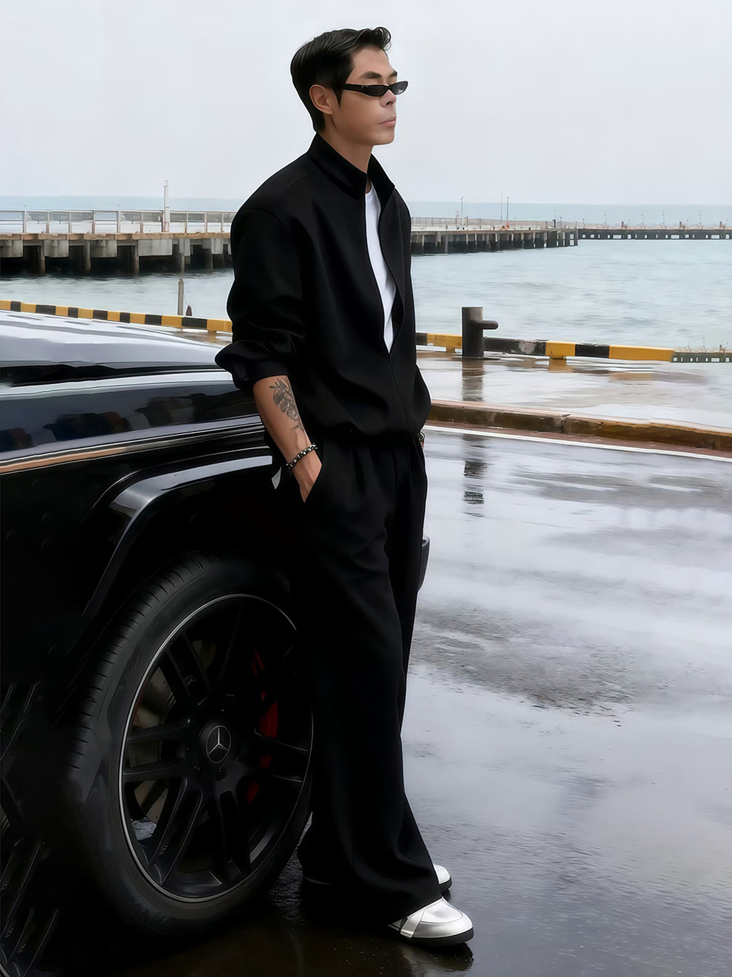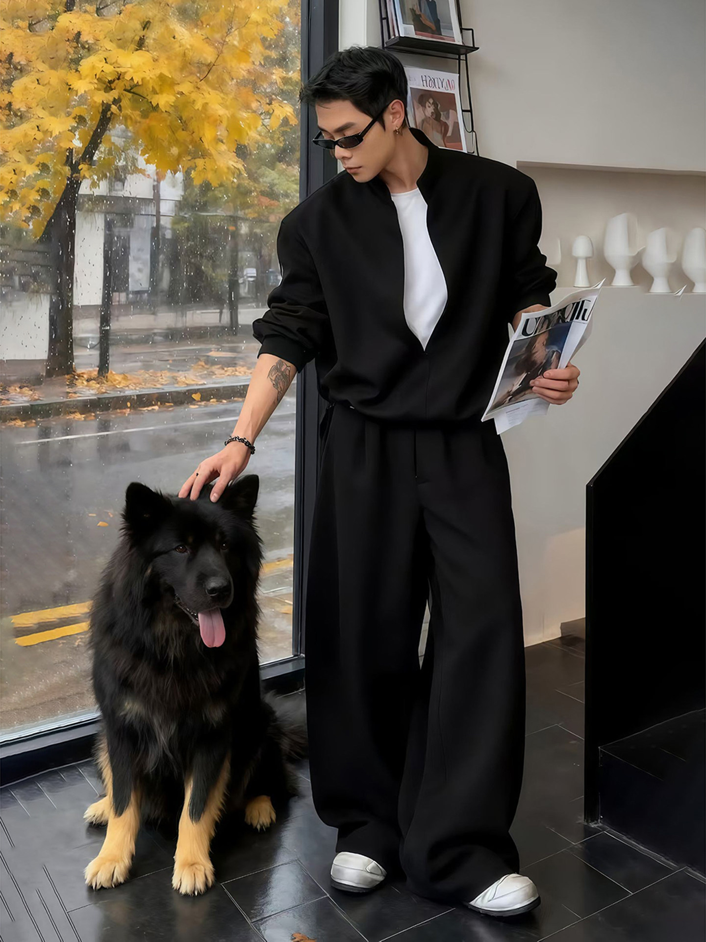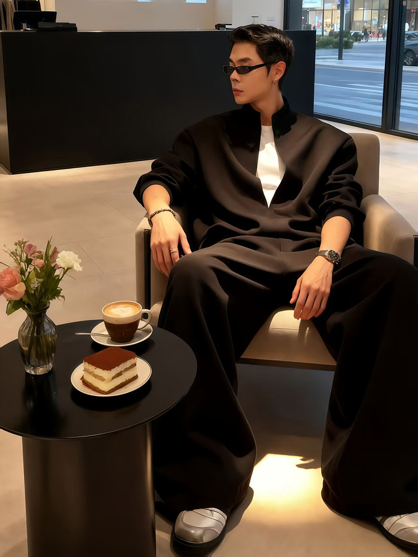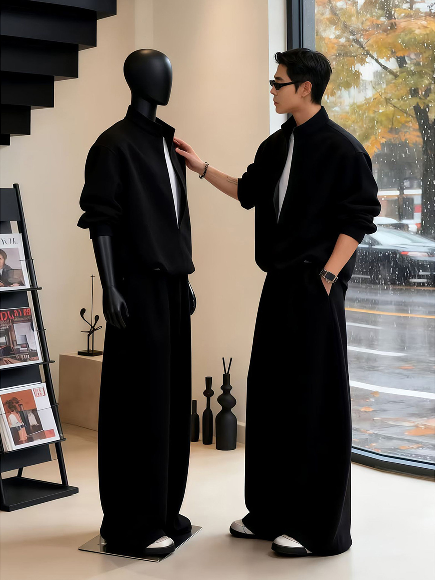 Black Faux Two-Piece V-Neck Sweatshirt for Men, High-End Style Outfit, Complete Set with Korean-Style Old Money Style Heavyweight Wide-Leg Sweatpants