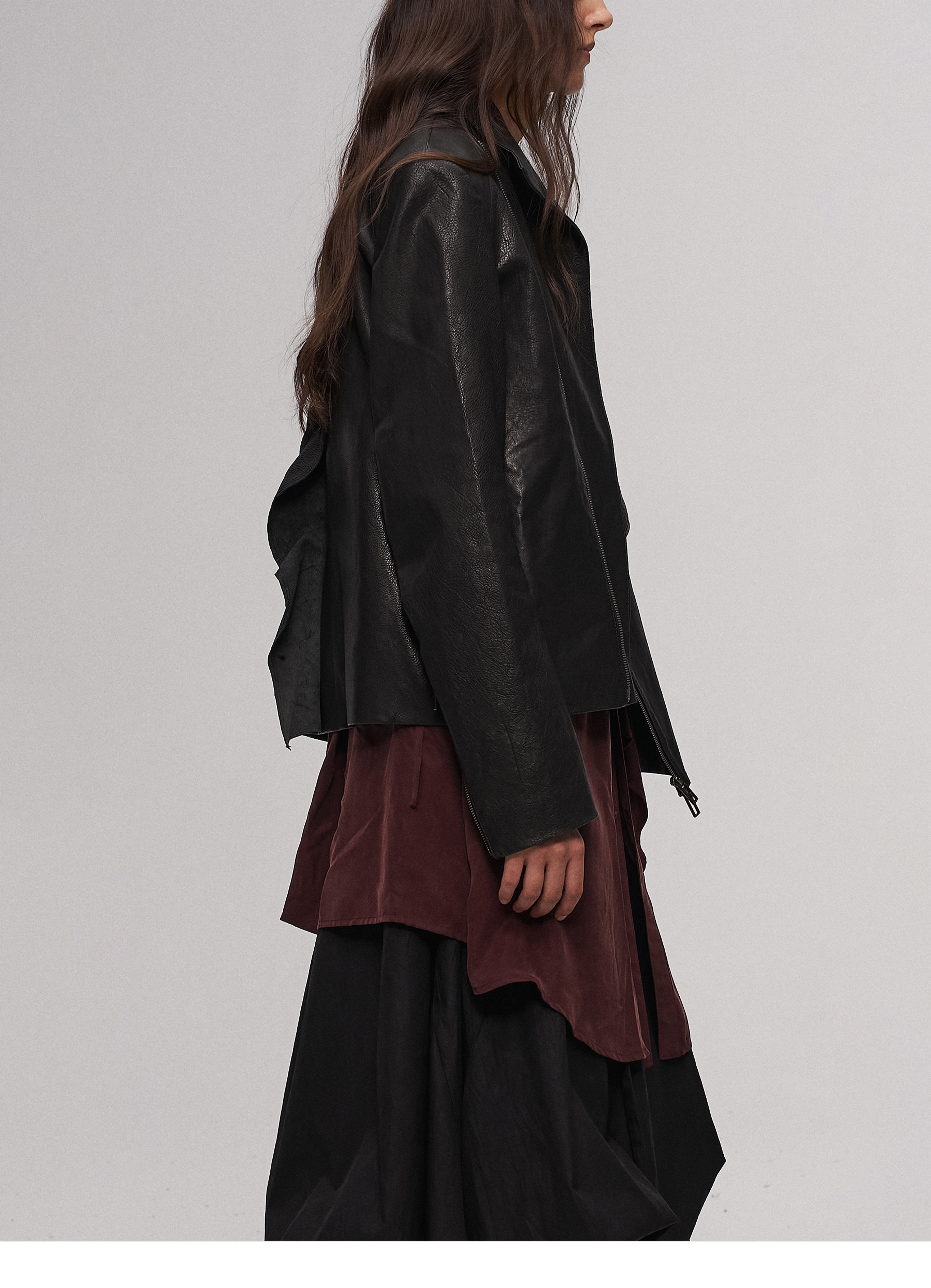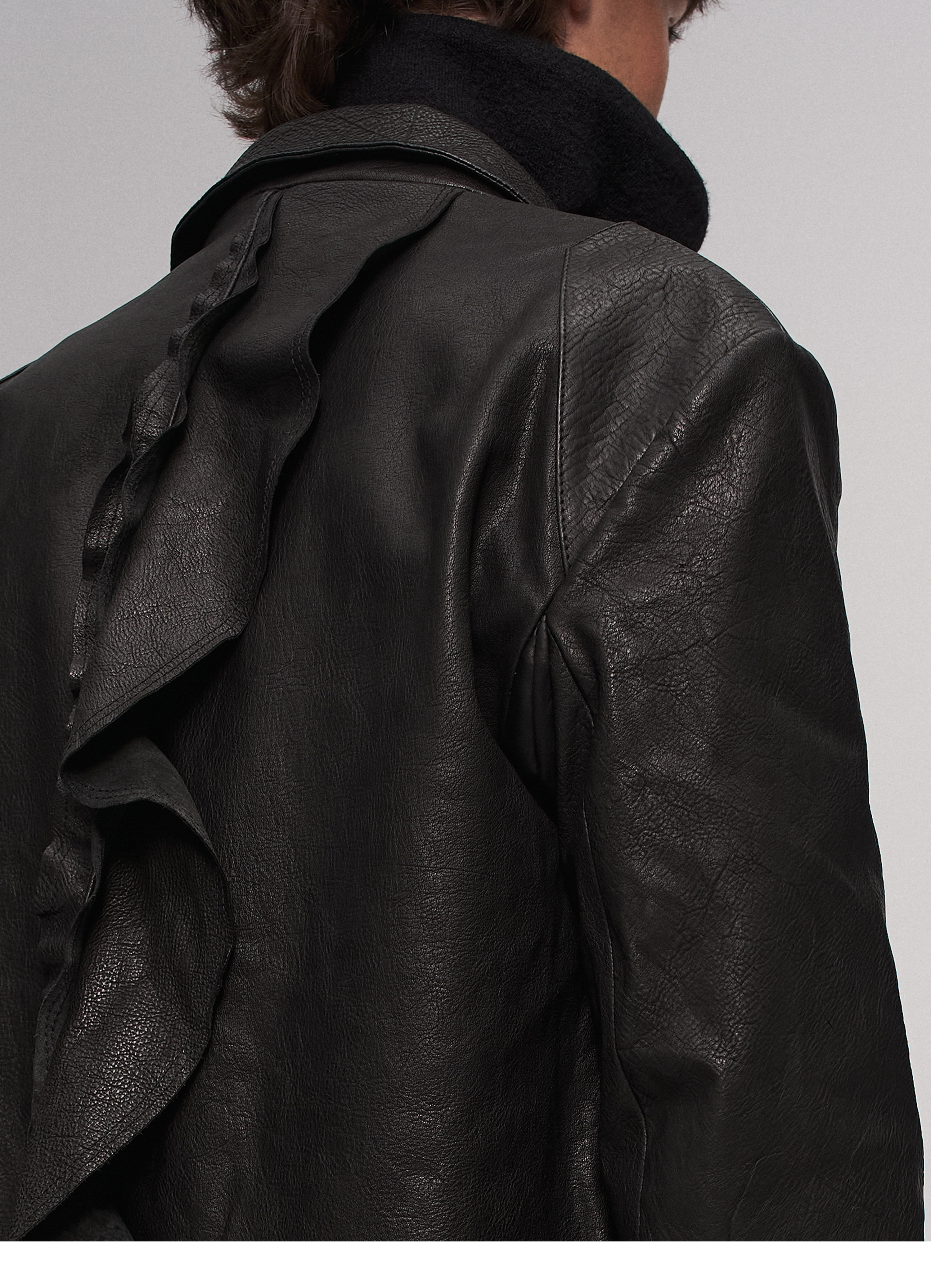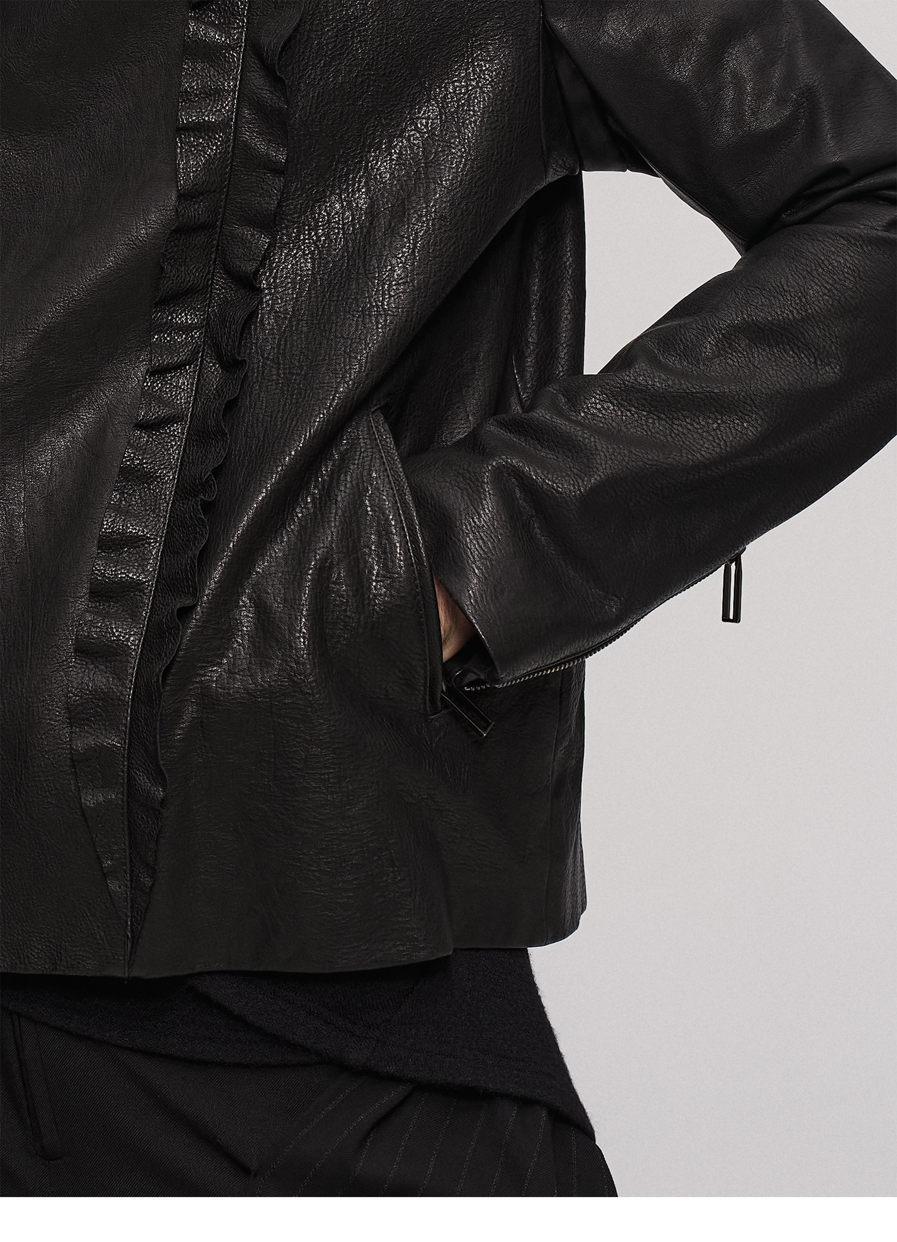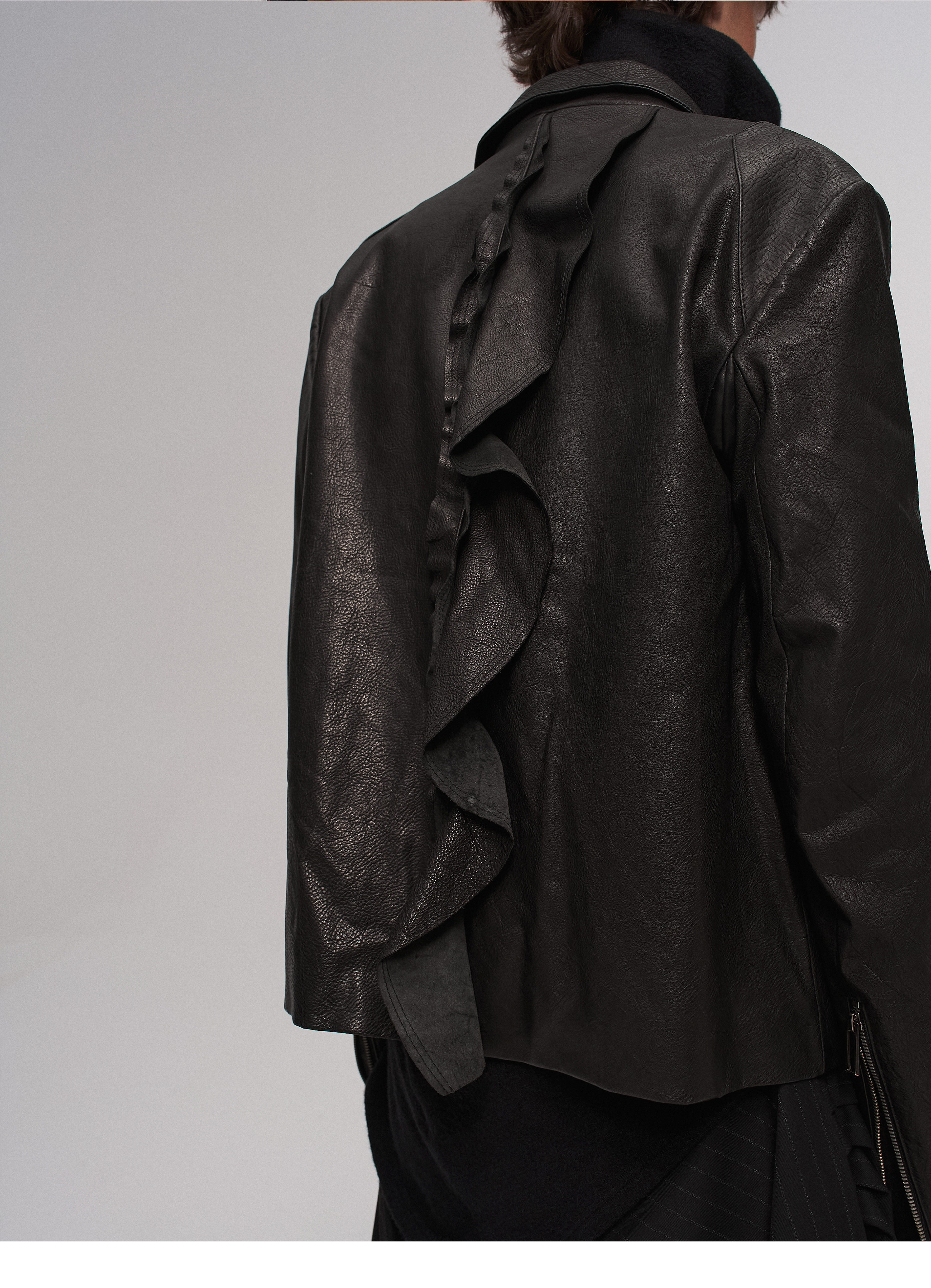 "Ilnya" Black Lace Jacket, Washed Horsehide Leather Jacket with Lace Trim