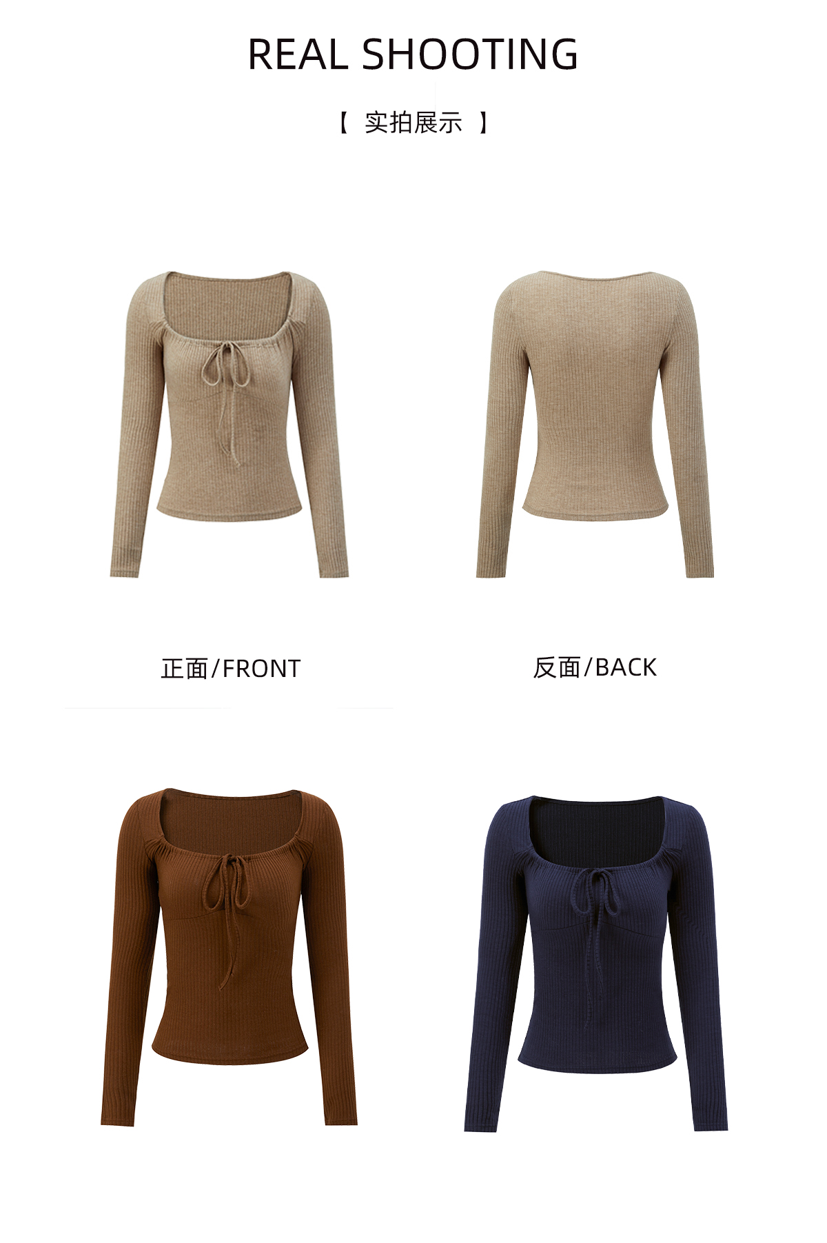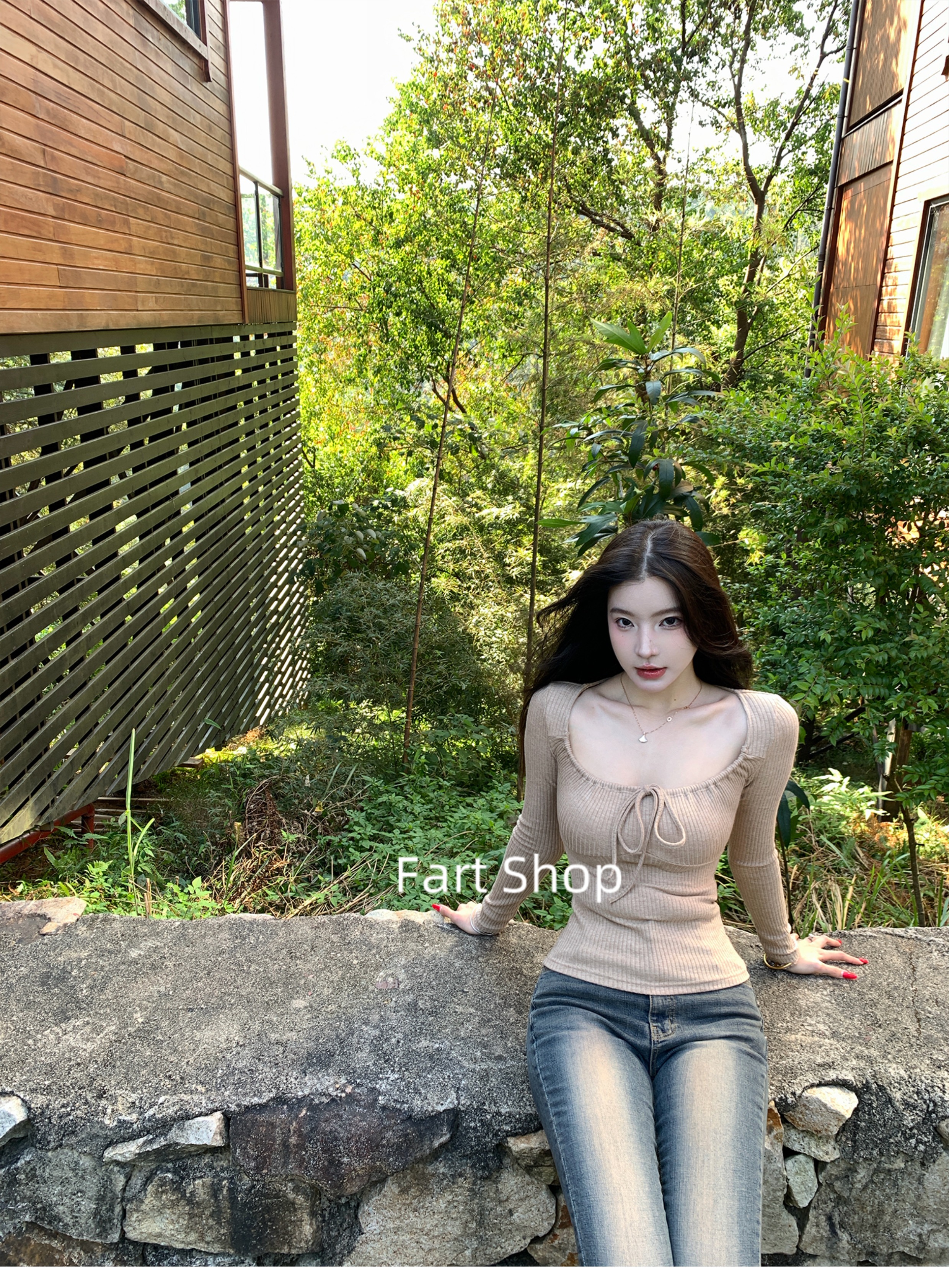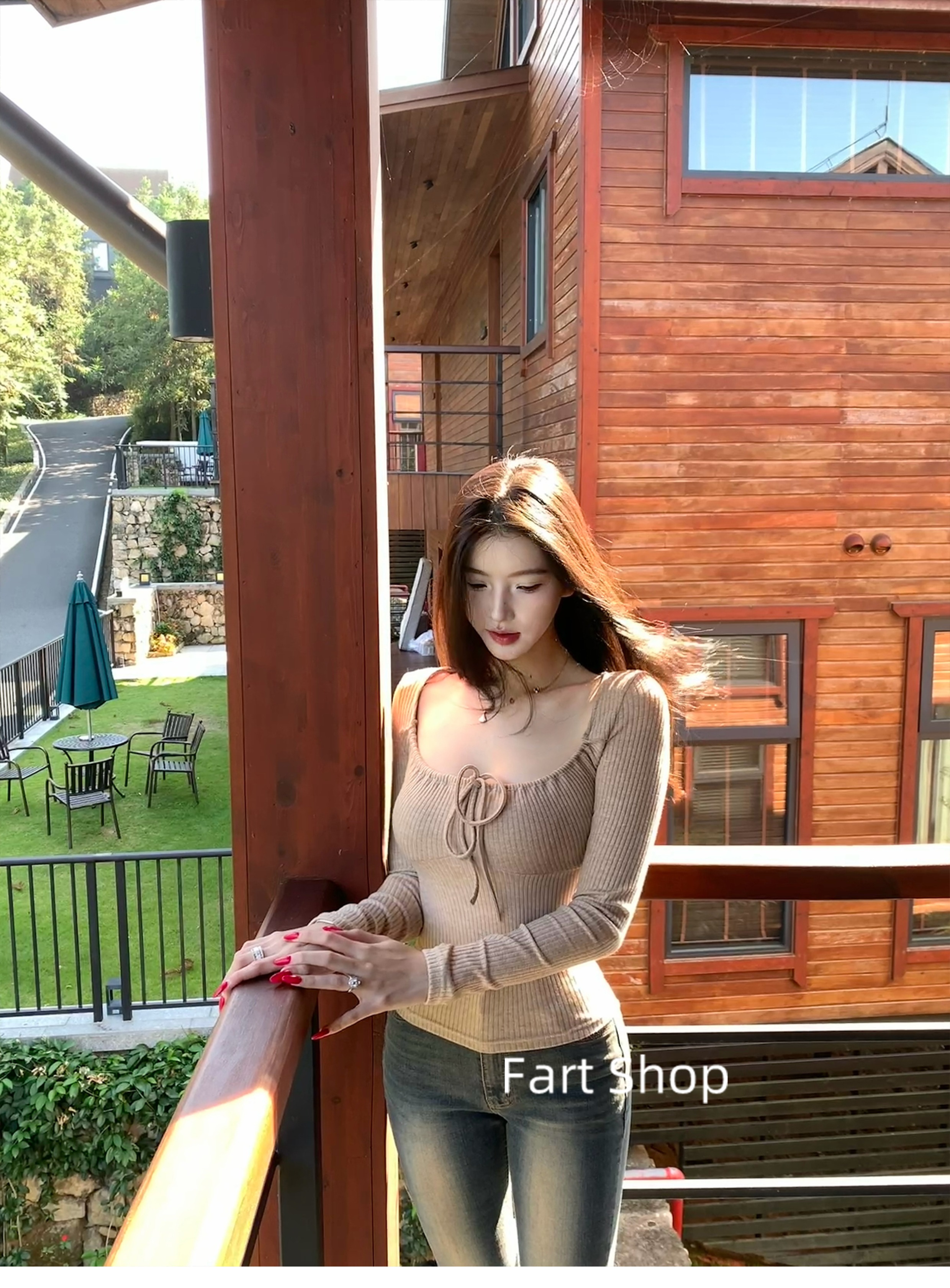 【Fart Shop】Pure and Desirable Three-Color Tie Long-Sleeve Women's Autumn Ribbed Square Neck White-Enhancing Base Shirt Top