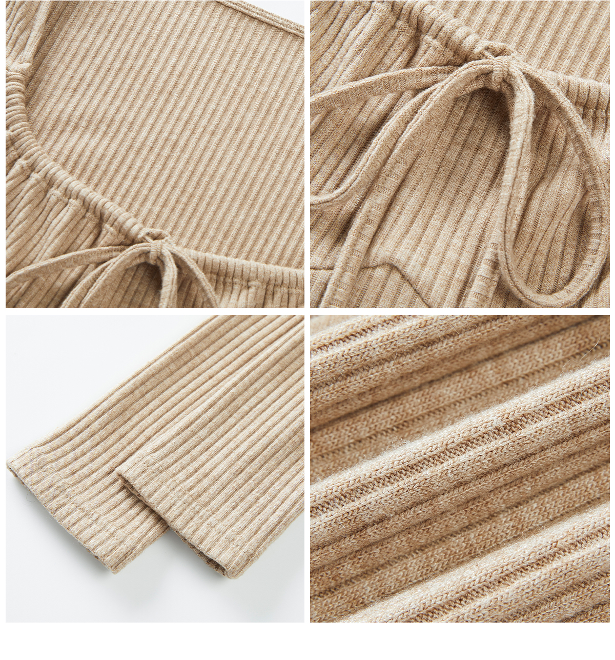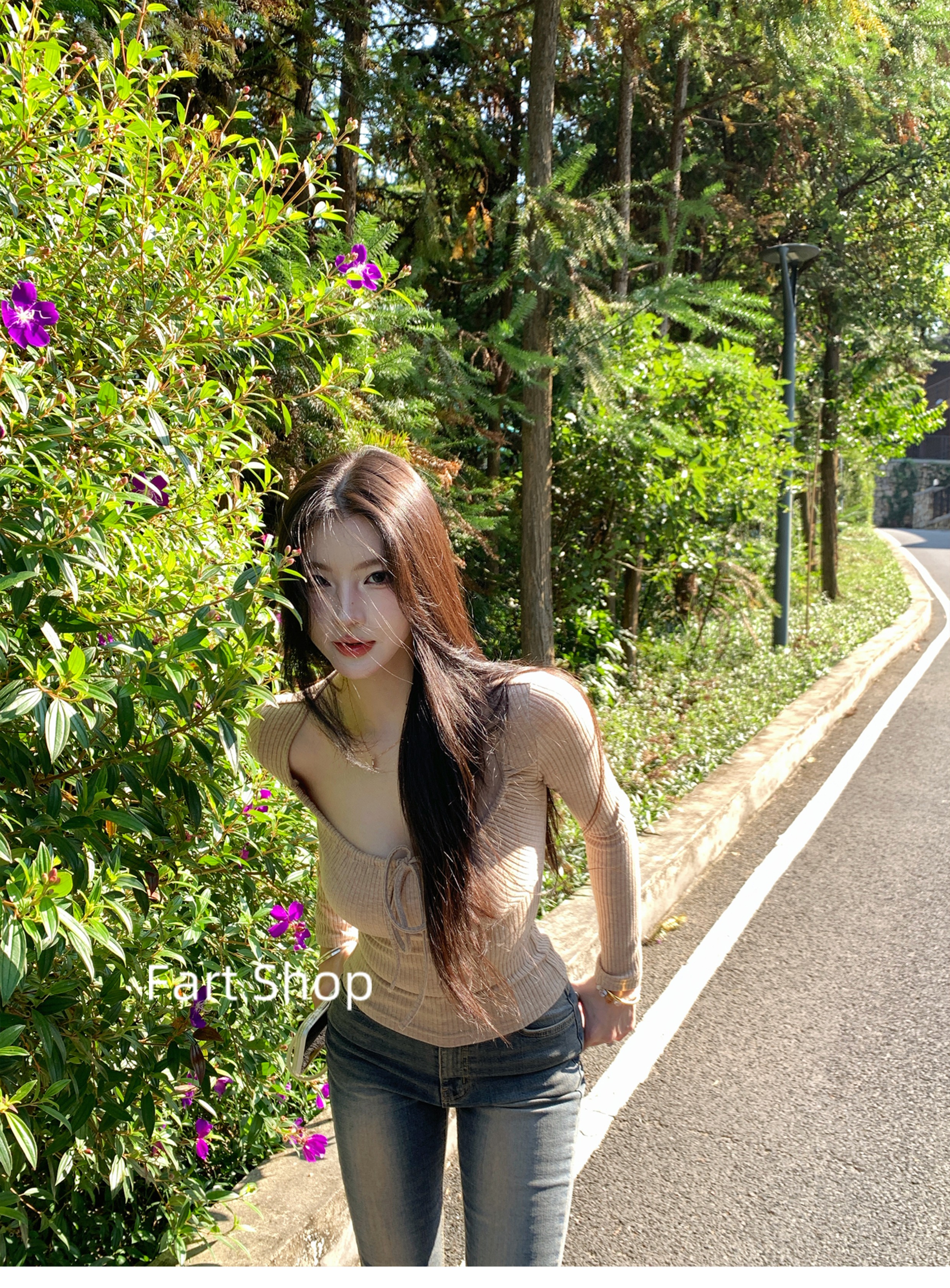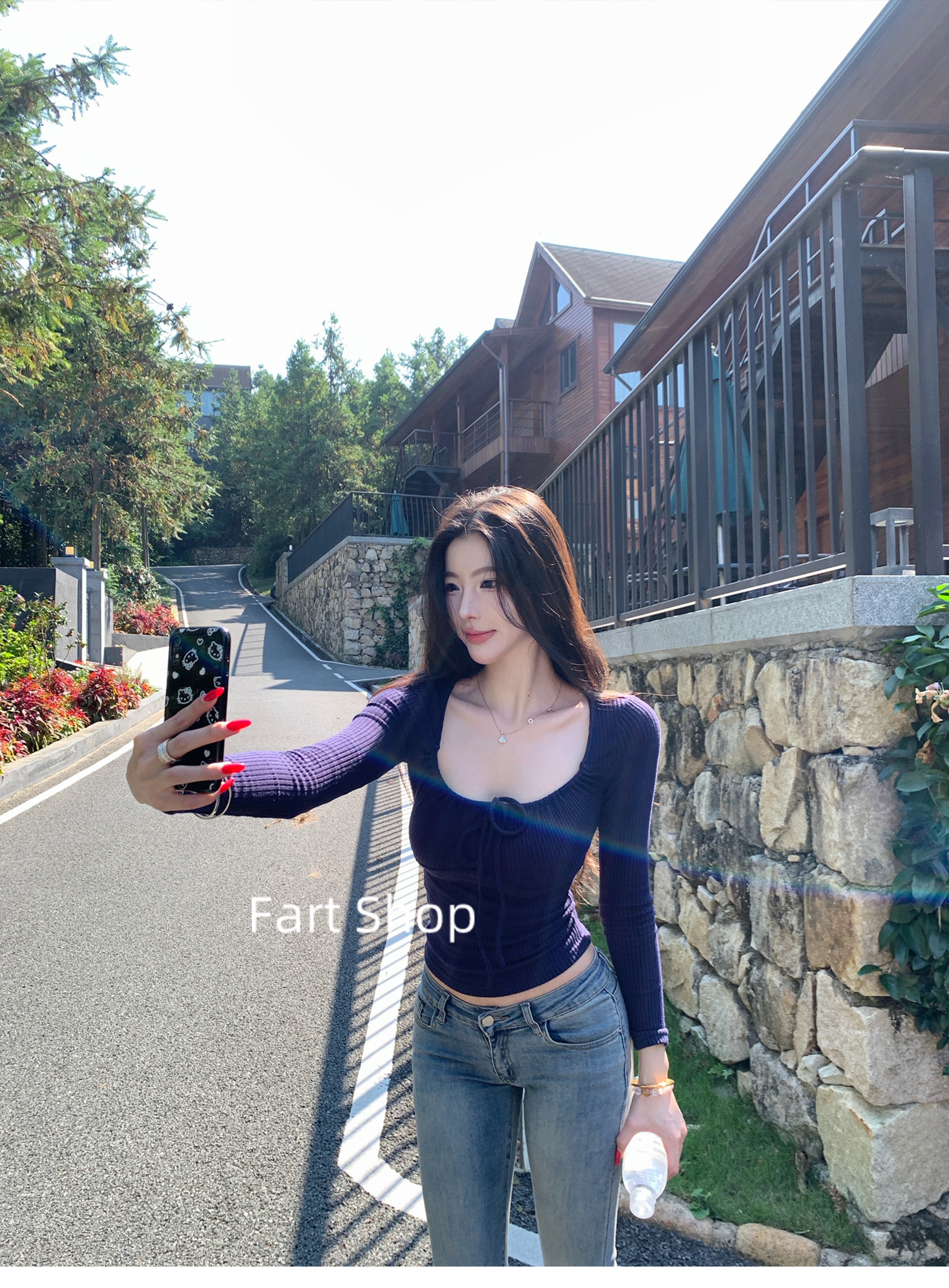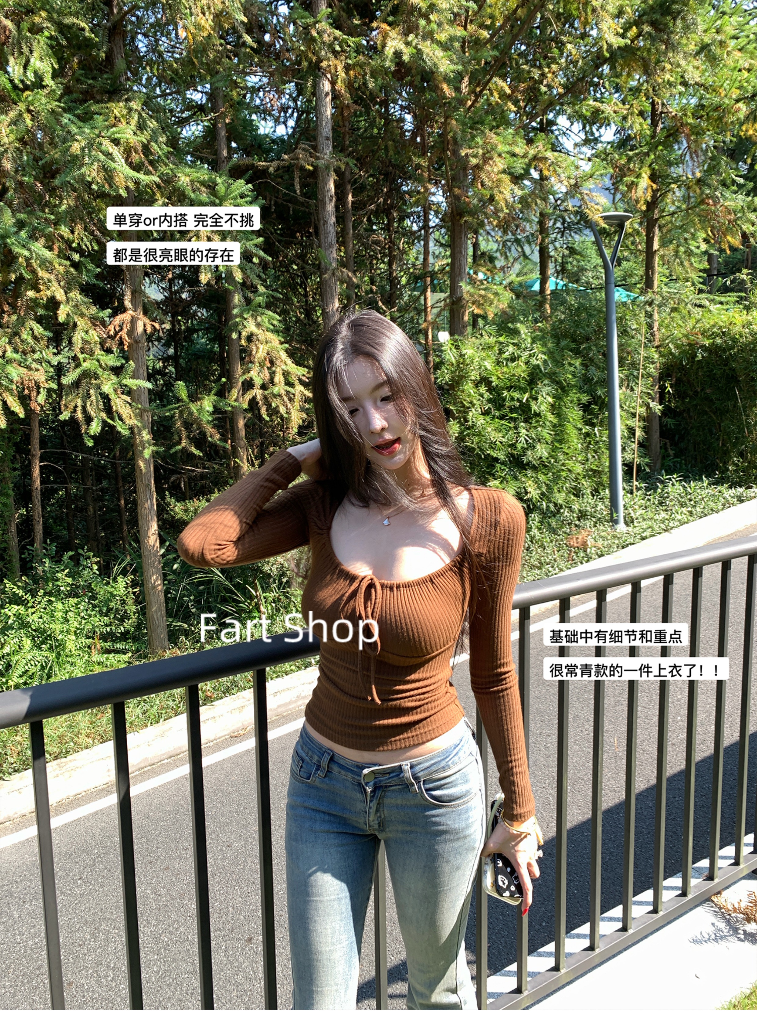 【Fart Shop】Pure and Desirable Three-Color Tie Long-Sleeve Women's Autumn Ribbed Square Neck White-Enhancing Base Shirt Top