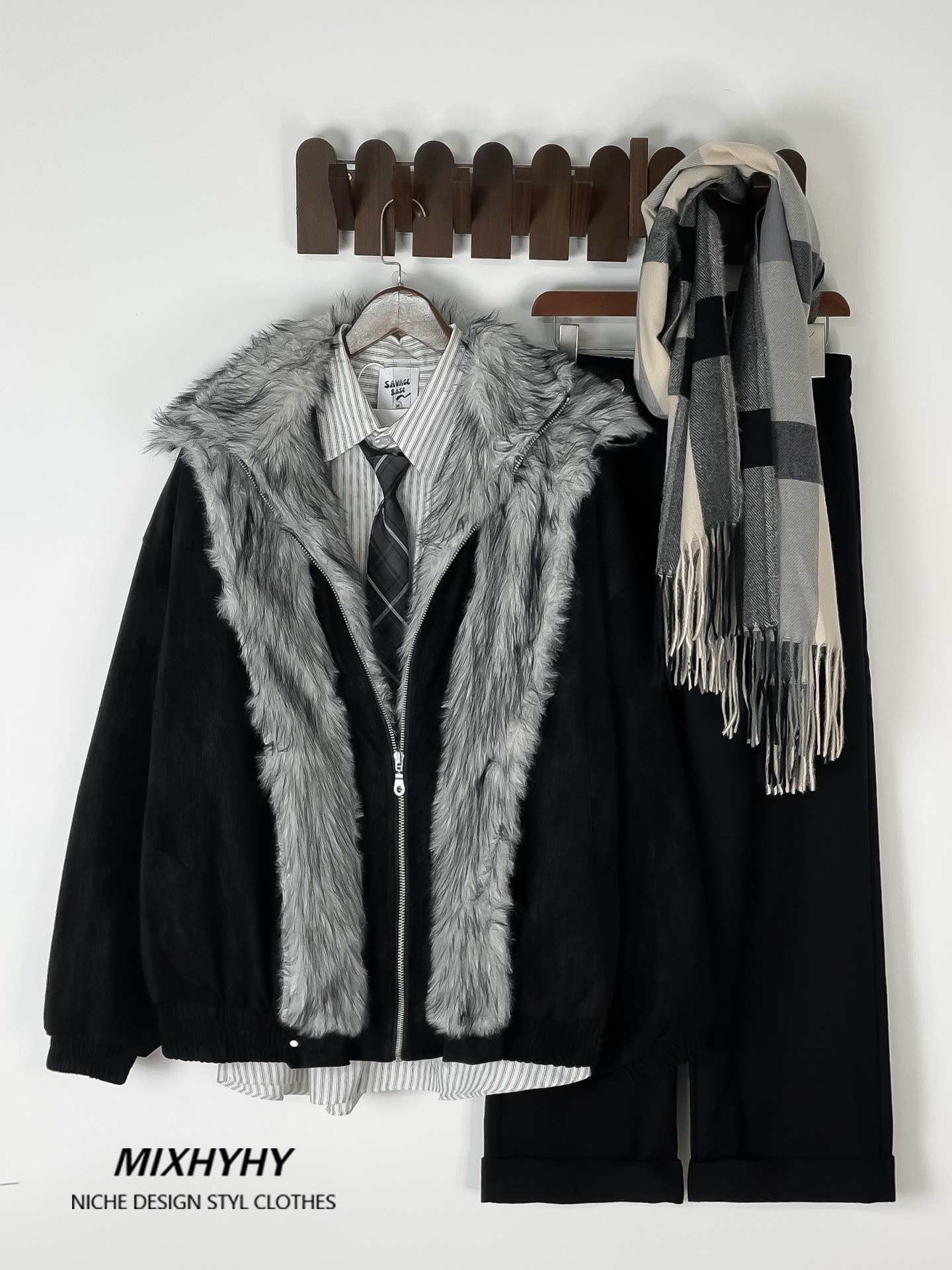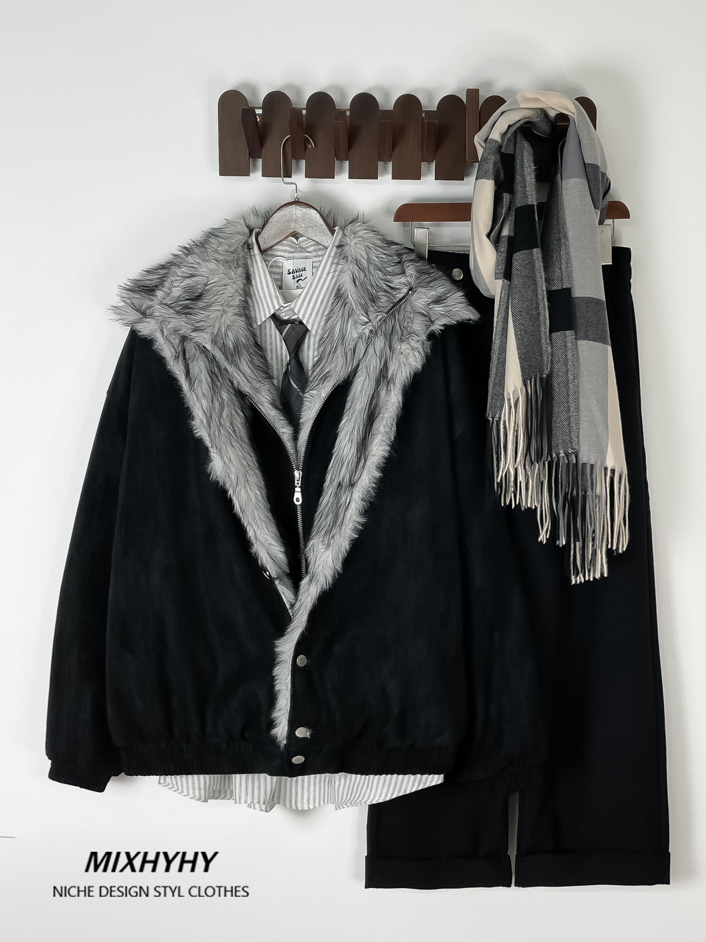Mixhyhy American Retro Double-Layer Fur Collar Faux Two-Piece Cotton Coat for Men, Thickened and Warm Short Jacket for Winter