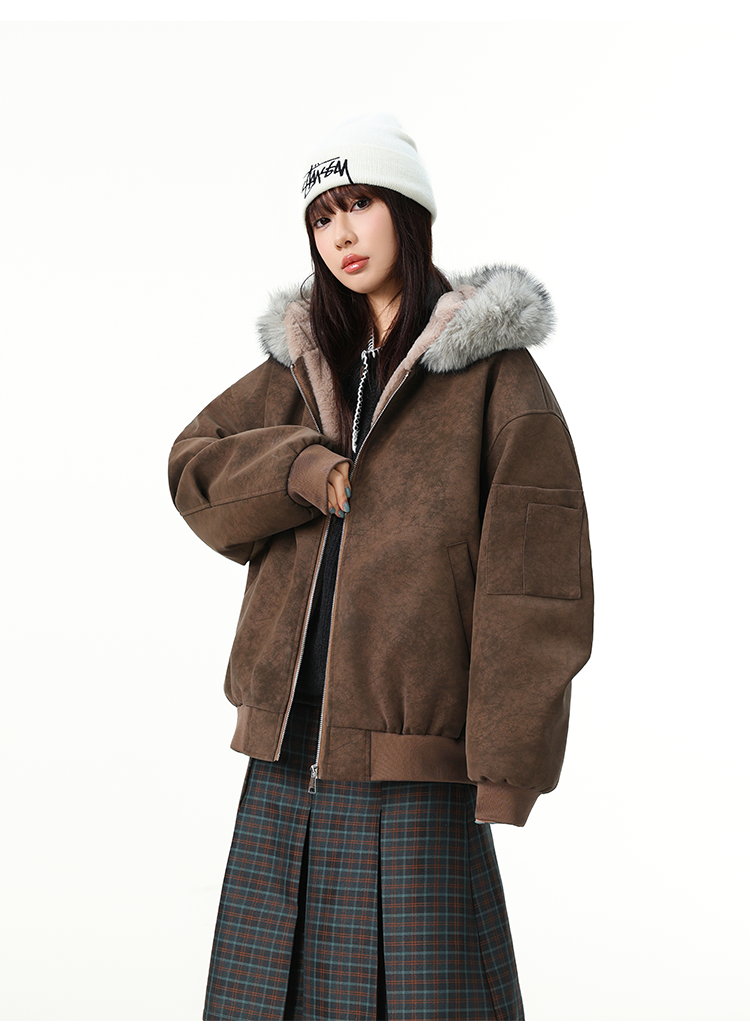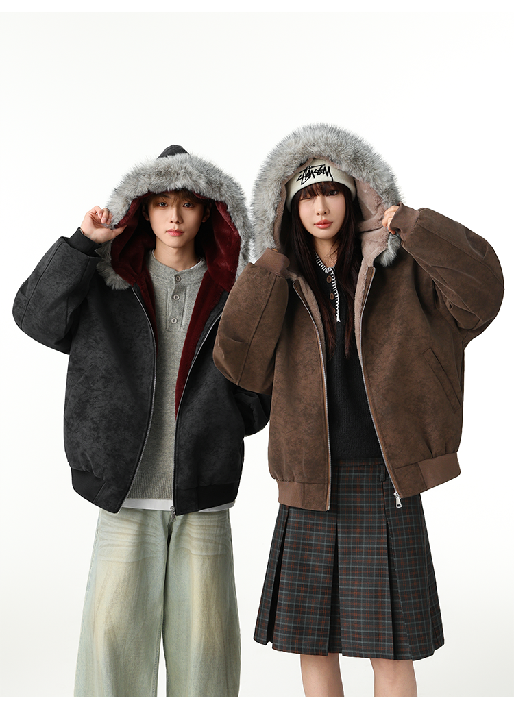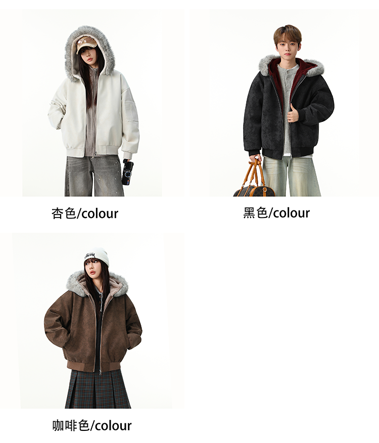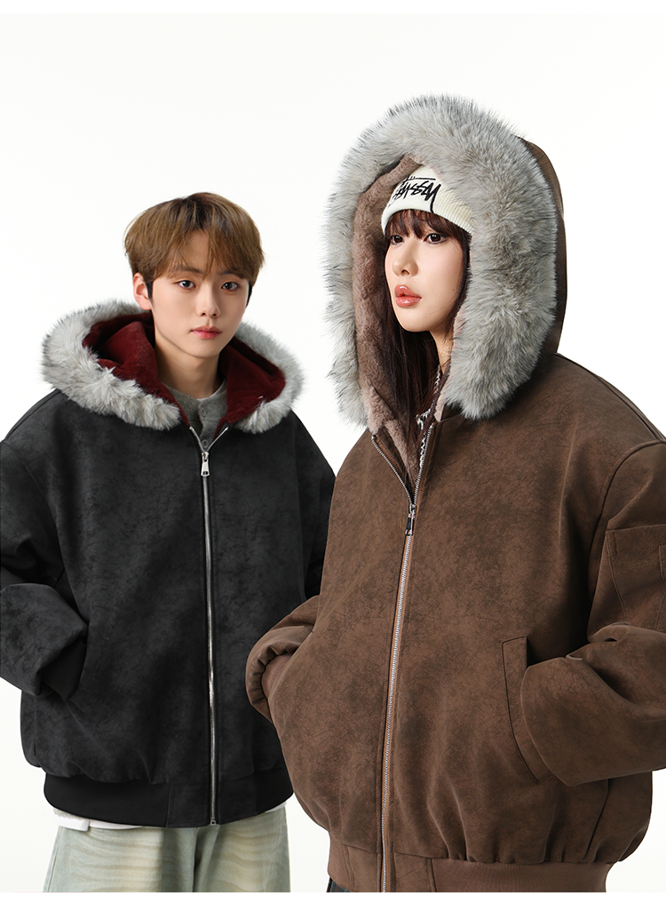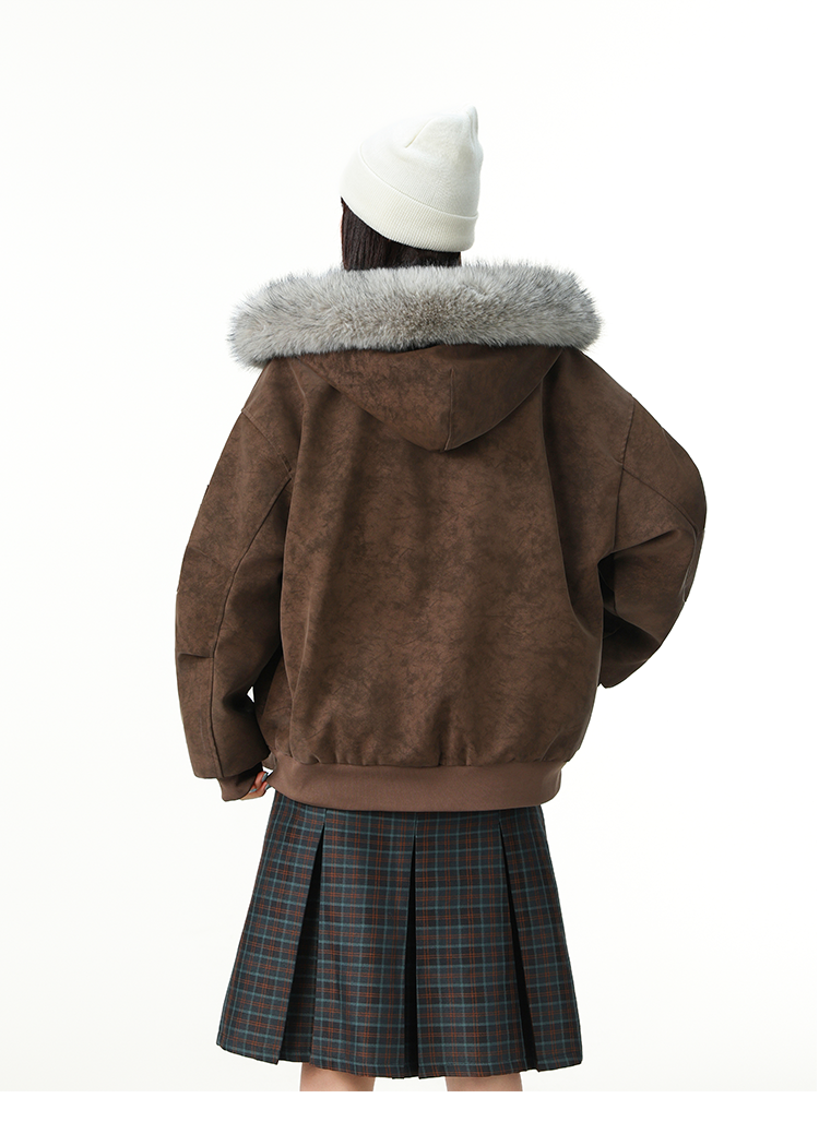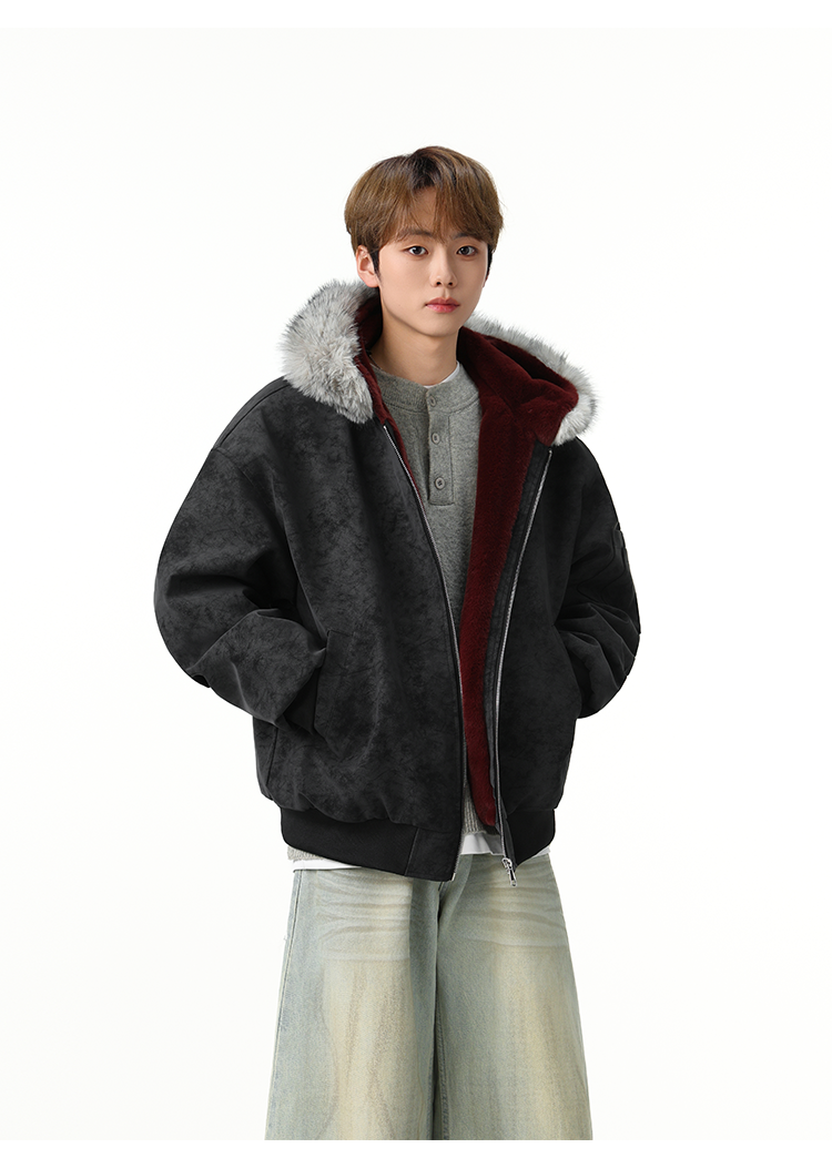 Manreshow Fur Collar Hooded Fleece Jacket with Detachable Fur Collar