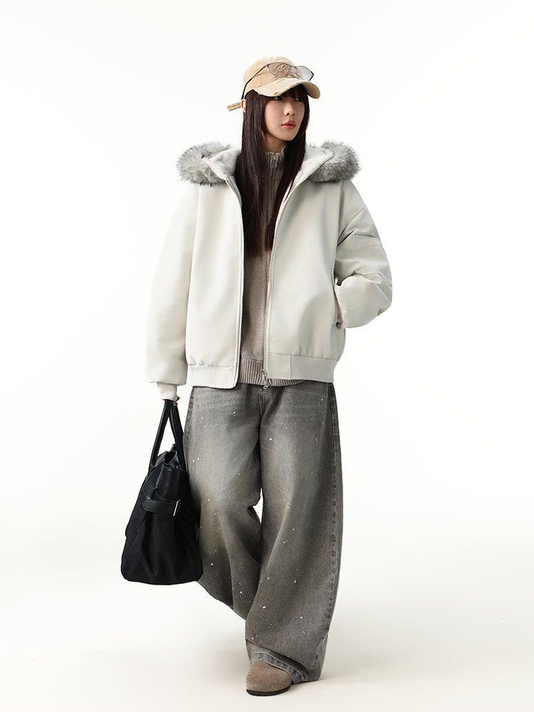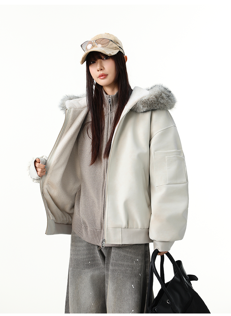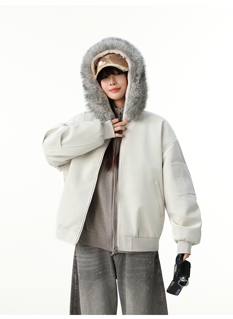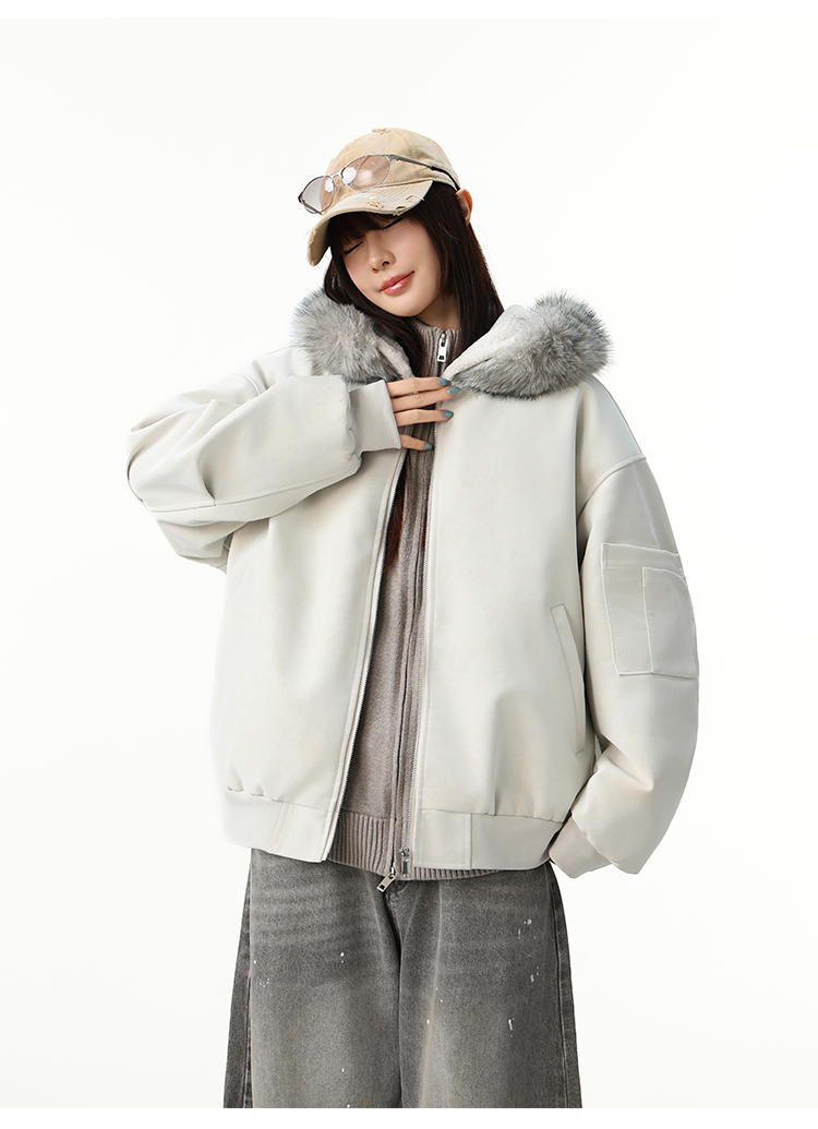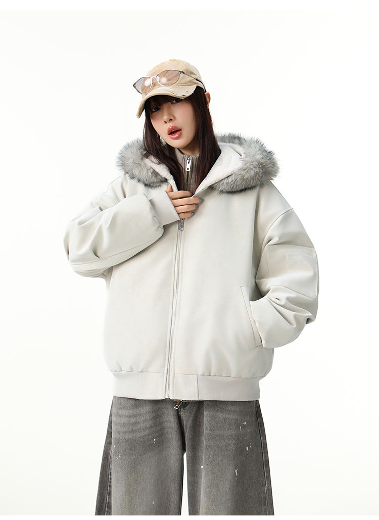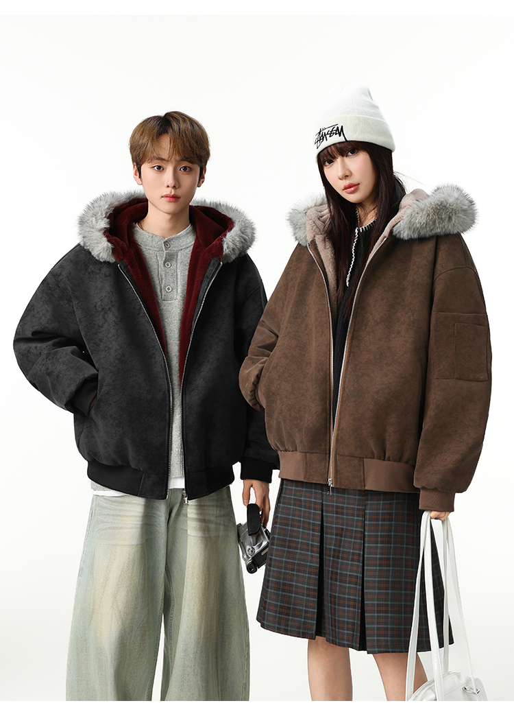 Manreshow Fur Collar Hooded Fleece Jacket with Detachable Fur Collar