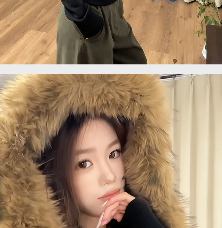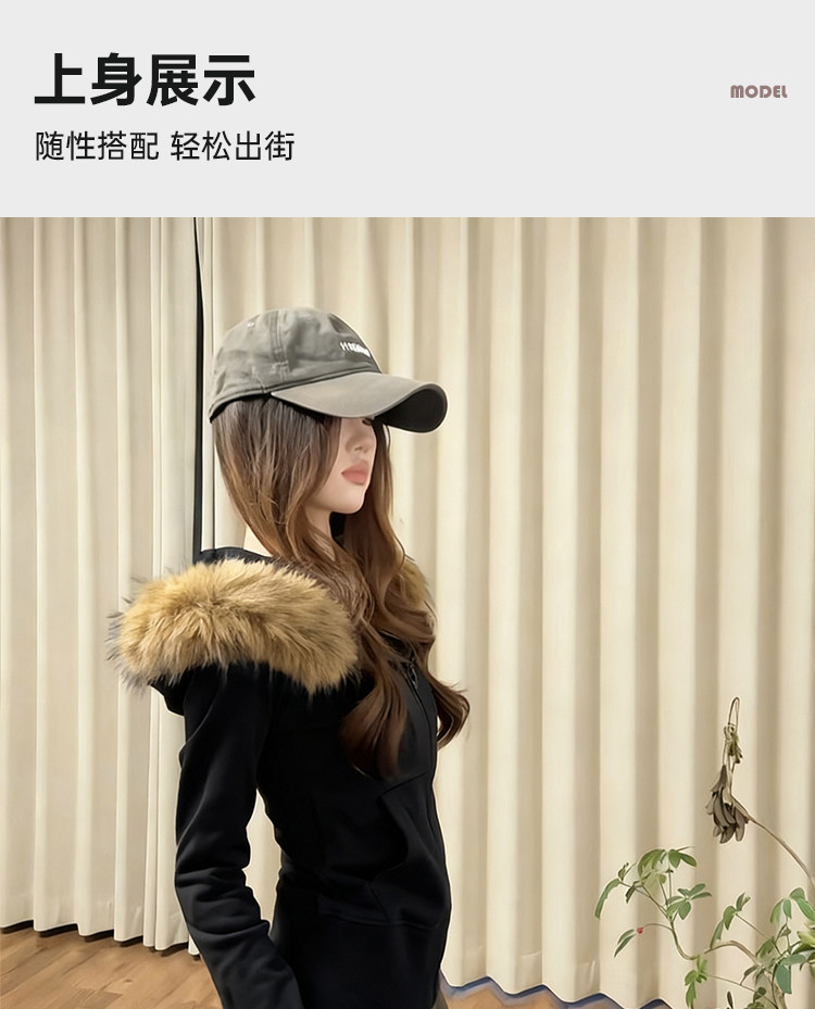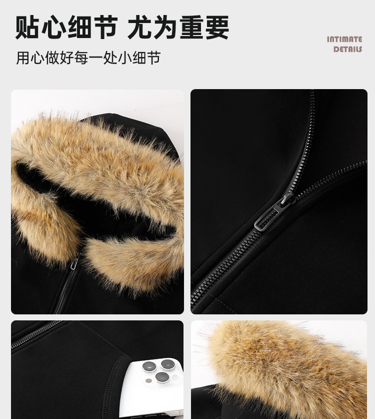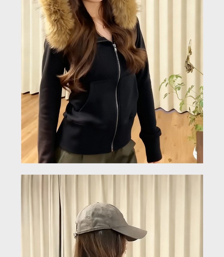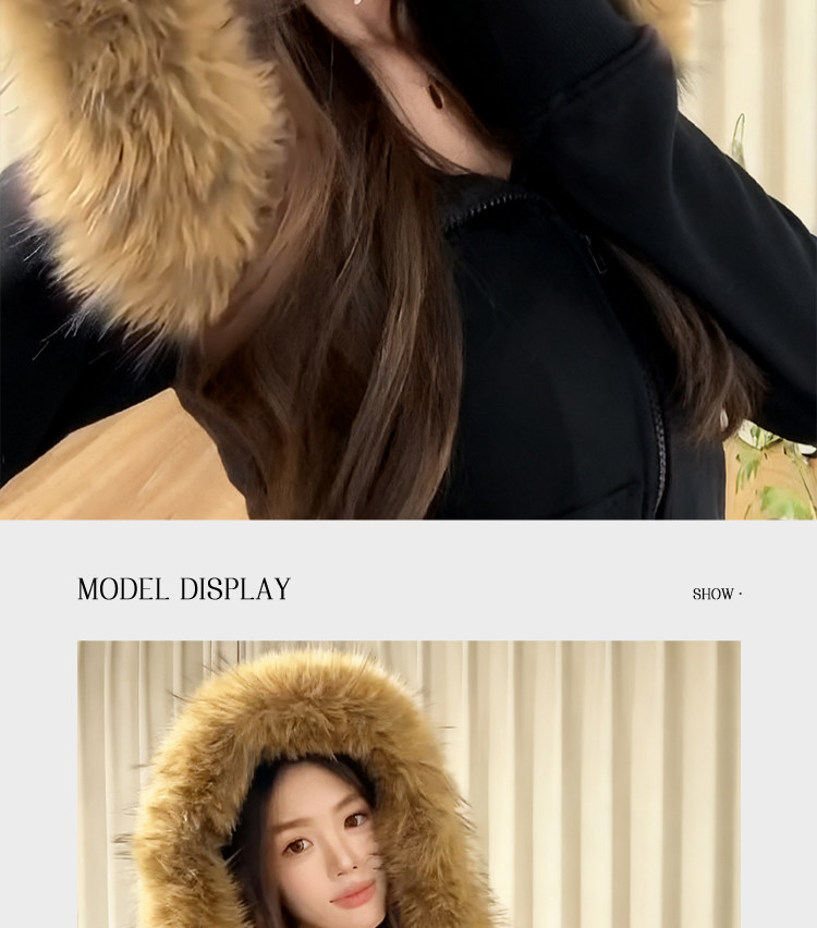 American-Style Black Fur Collar Hooded Sweatshirt for Women, Autumn and Winter Slim-Fit Waist-Cinching Korean-Style Fleece-Lined Thick Short Jacket Outfit