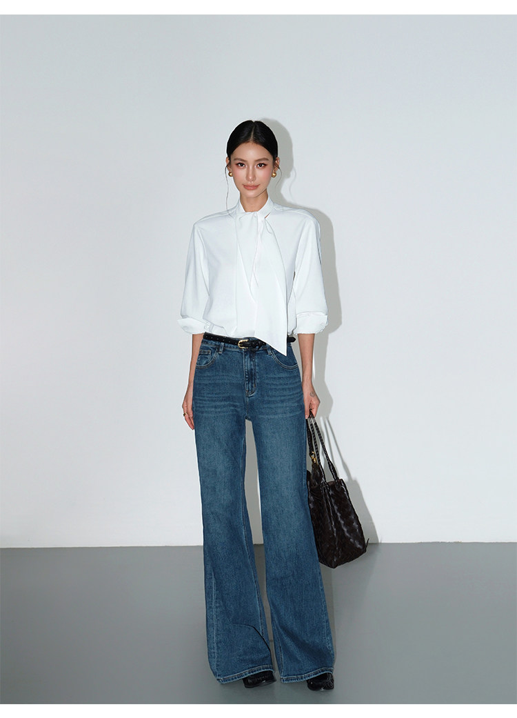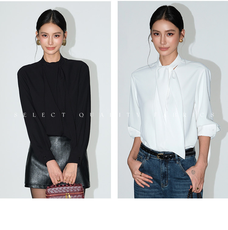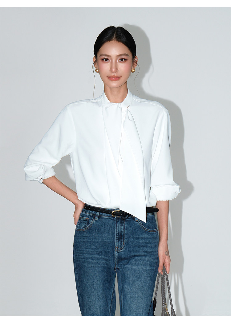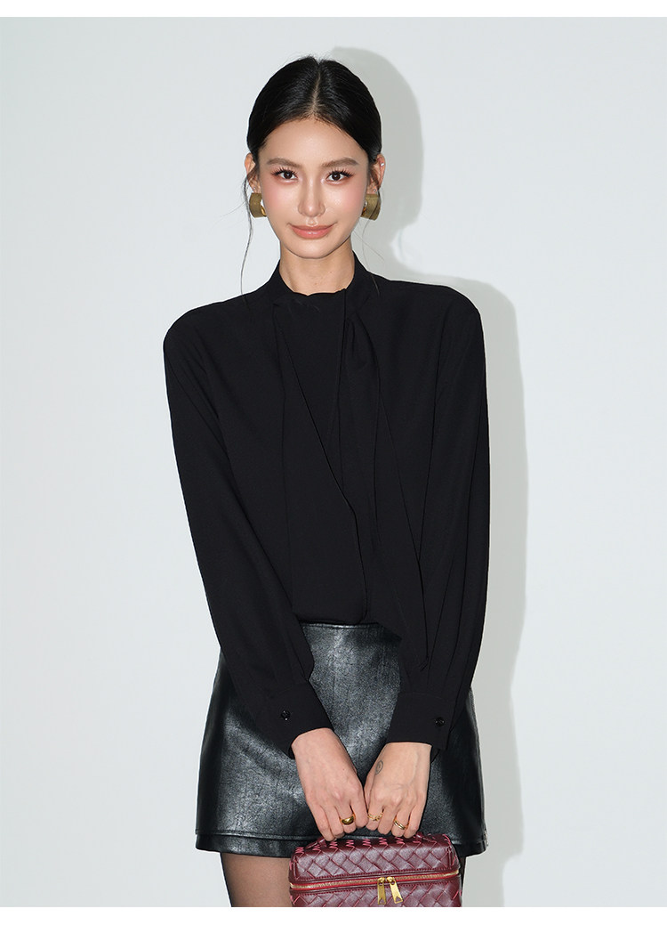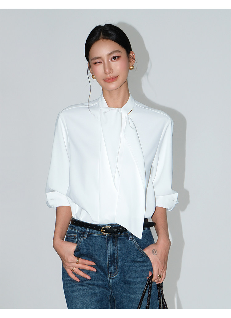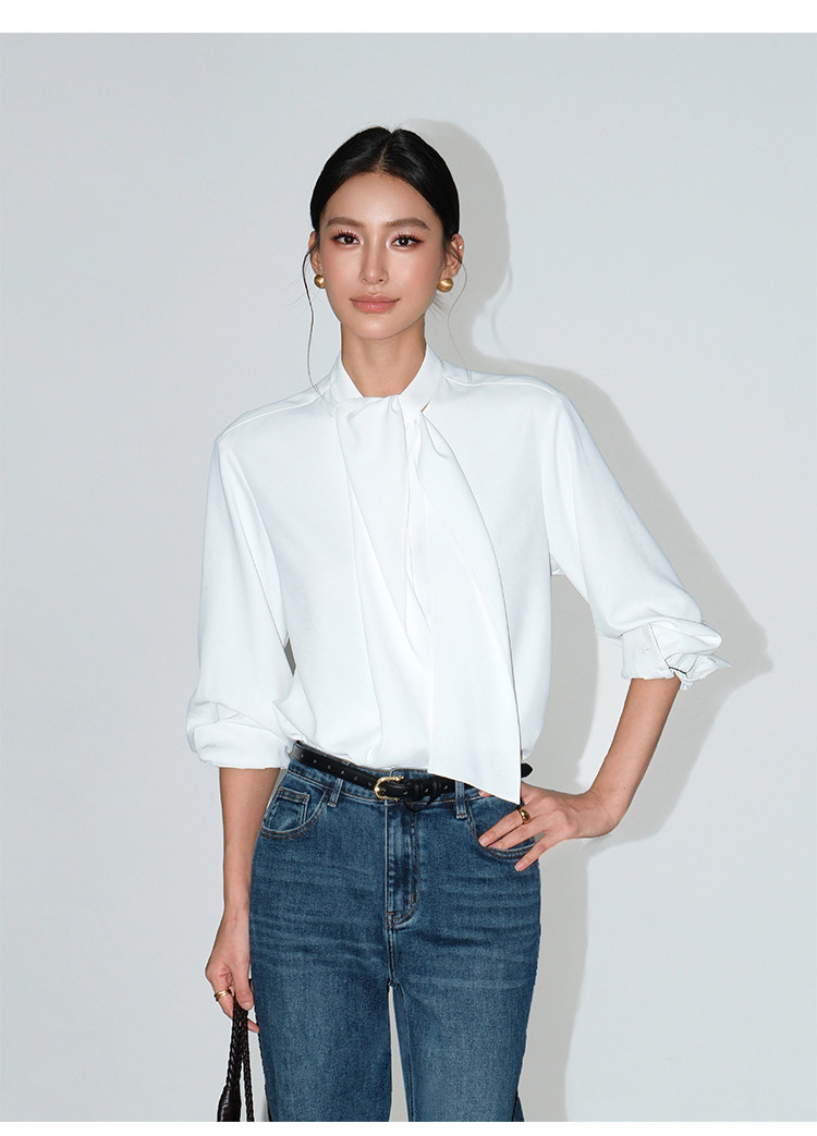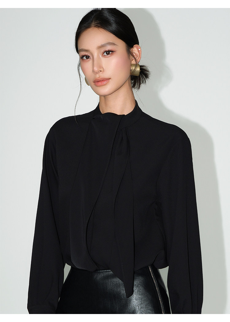 Neva Hu Roman Illustrated High-End Ribbon Stand Collar Shirt for Women with Stylish Tie-Up Design and Elegant Long Sleeves