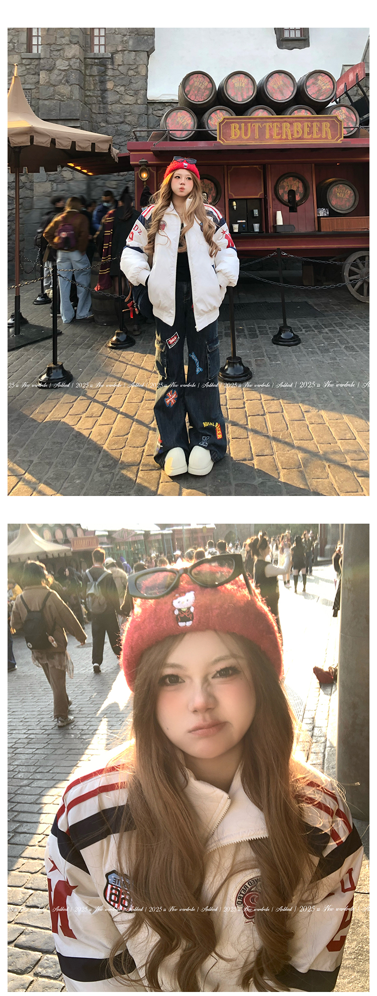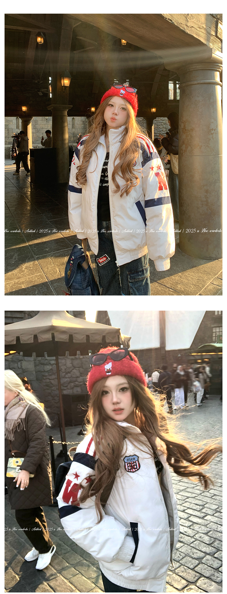Annie Is Not Popular. Retro Badge Color-Blocked Striped Stand-Up Collar Jacket Cotton Coat for Women, Slightly Plus Size, American Street Style Cotton Coat