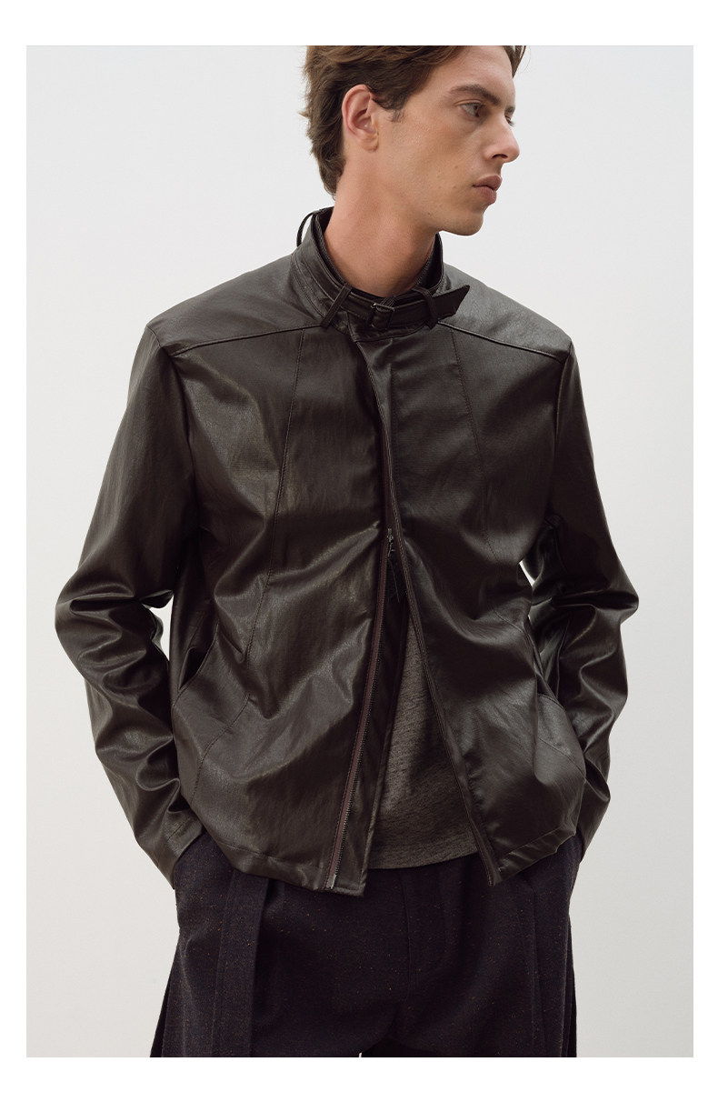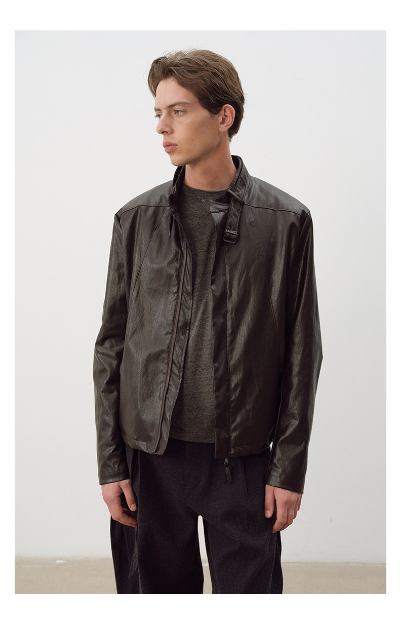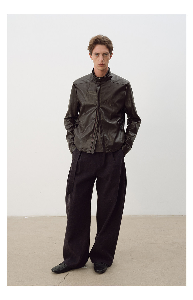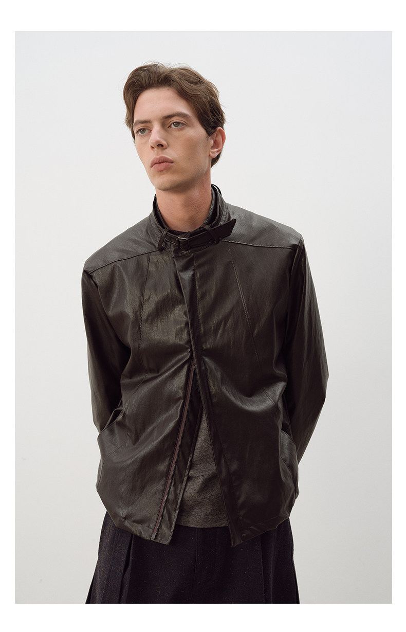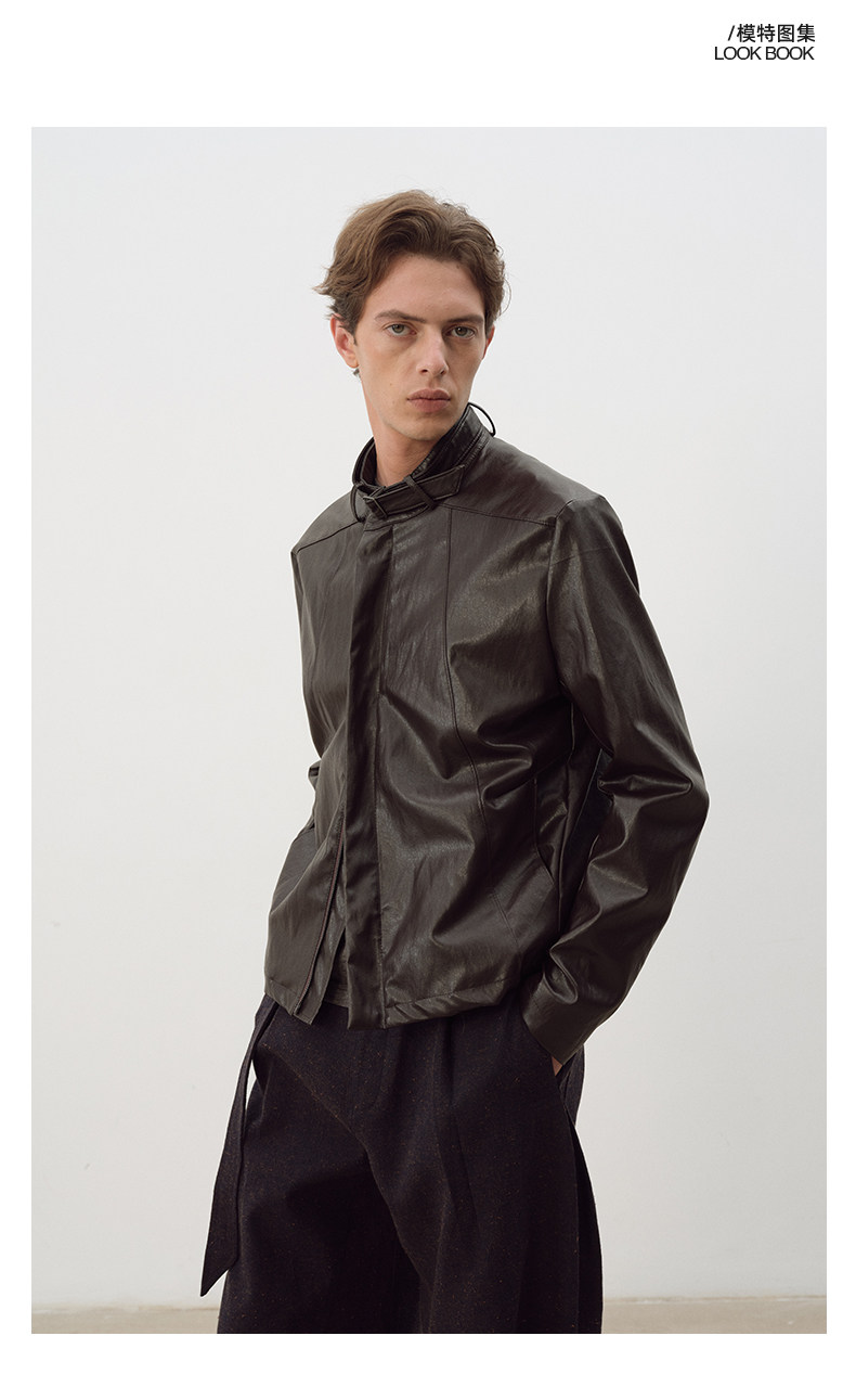 Not Ugly 25Aw Silver Ring Metal Wire Stand Collar Segmented Three-Dimensional Reddish Brown Leather Vintage Jacket