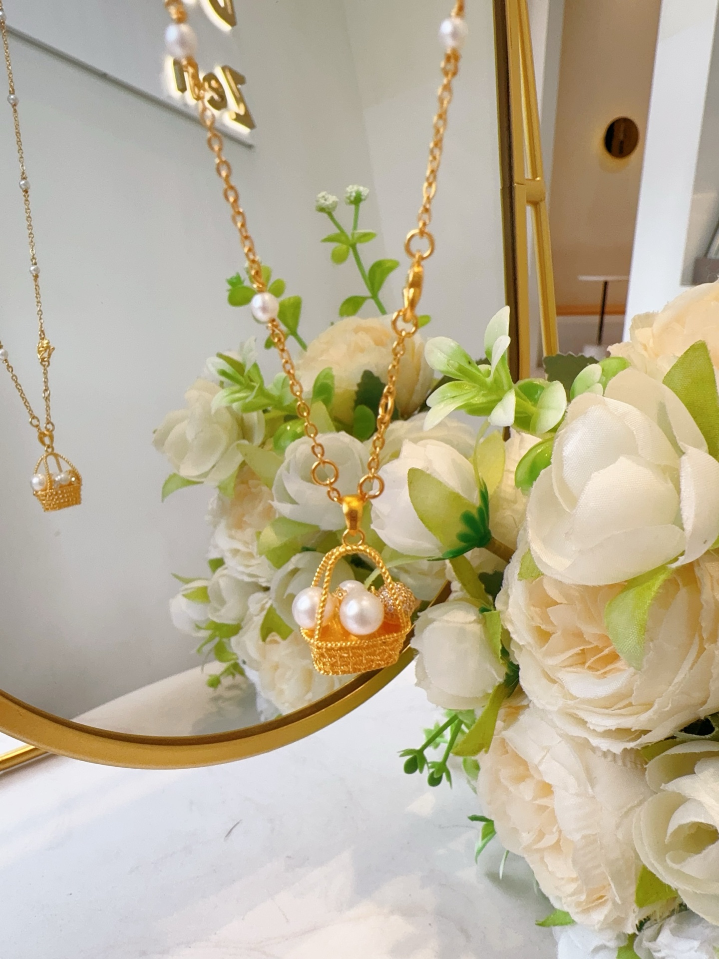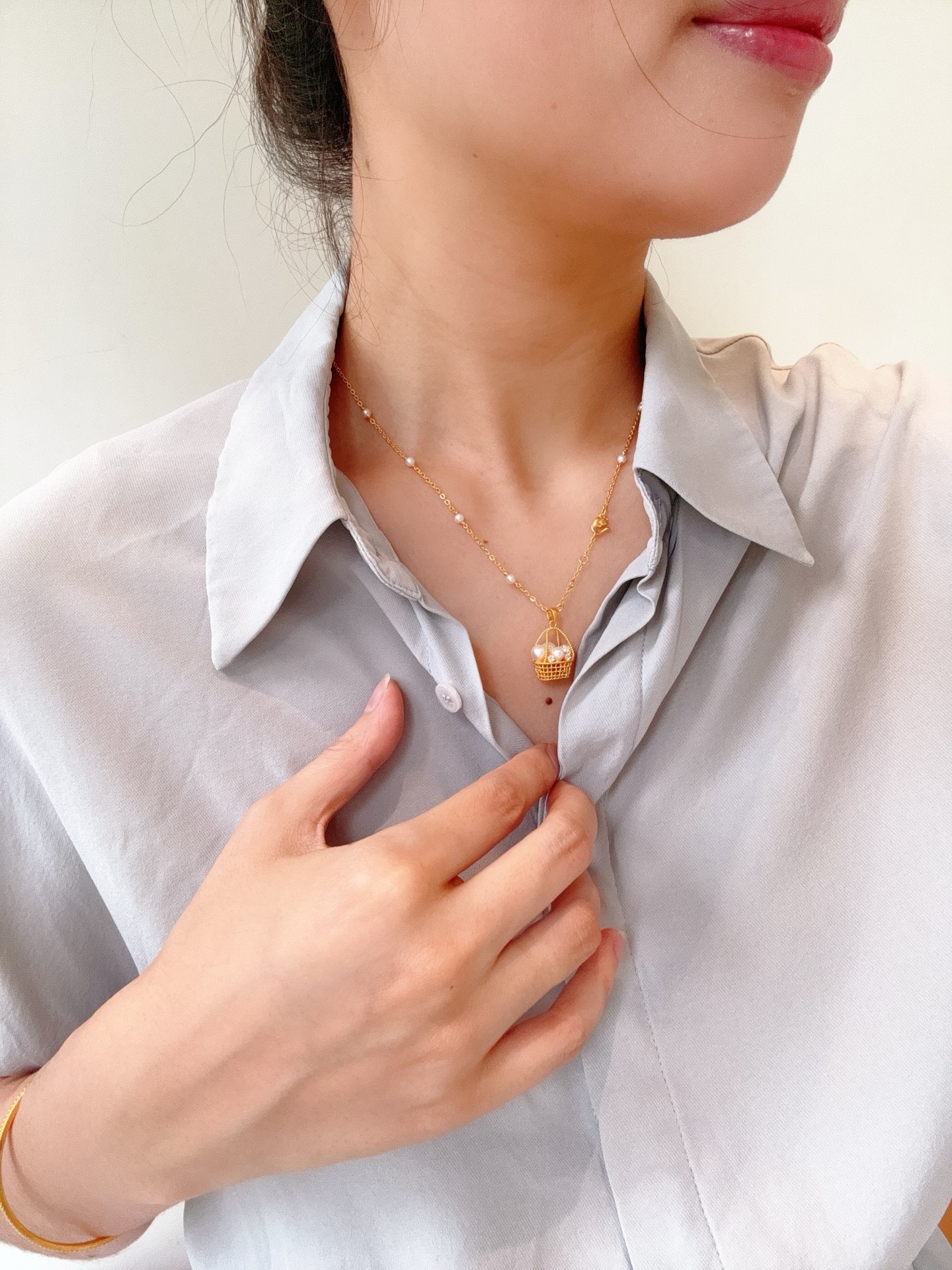 Golden Palace Ancient Method Pure Gold Inlaid Pearl Pendant Fashionable Light Luxury Small Flower Basket White Romantic Pendant