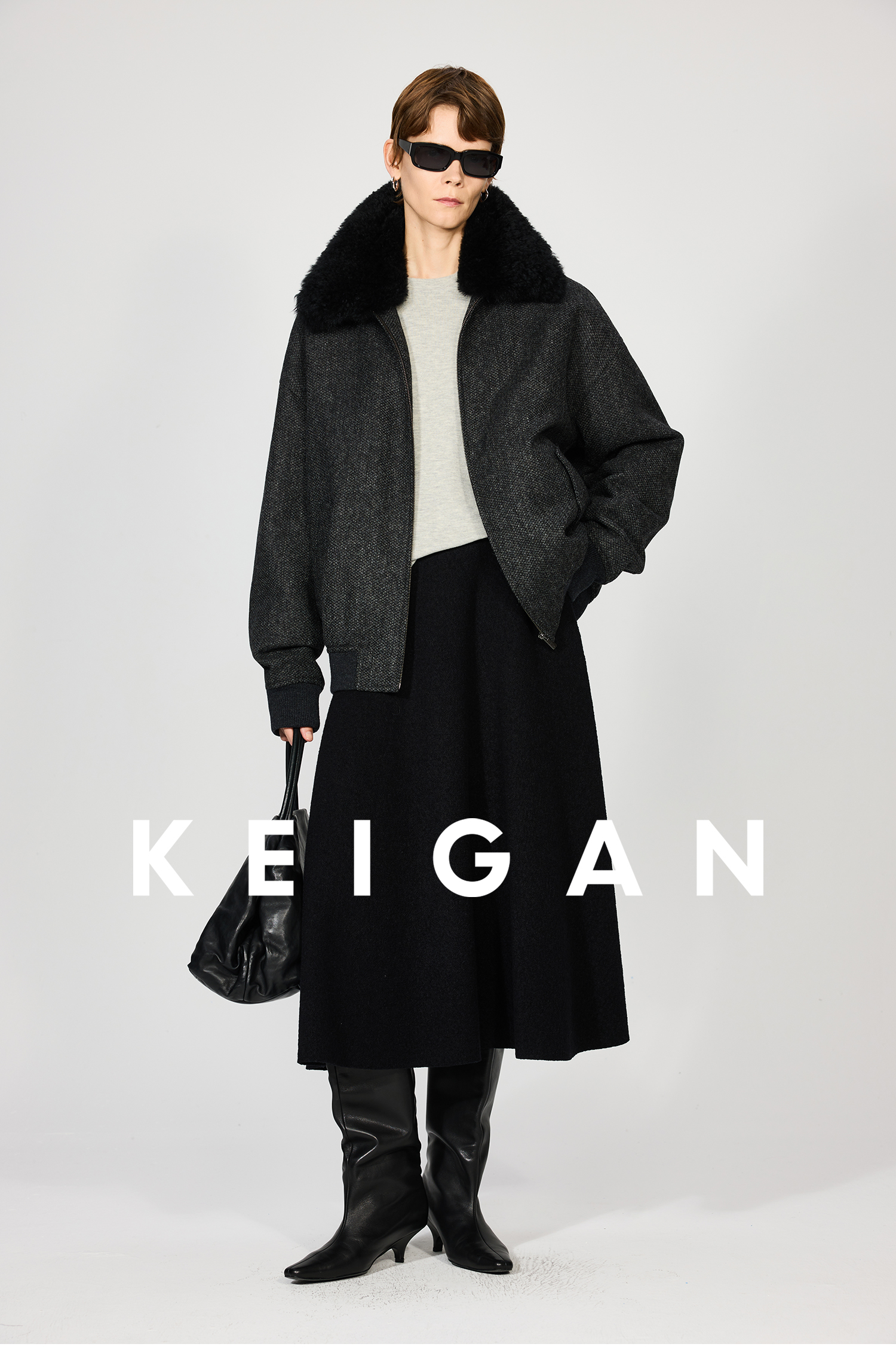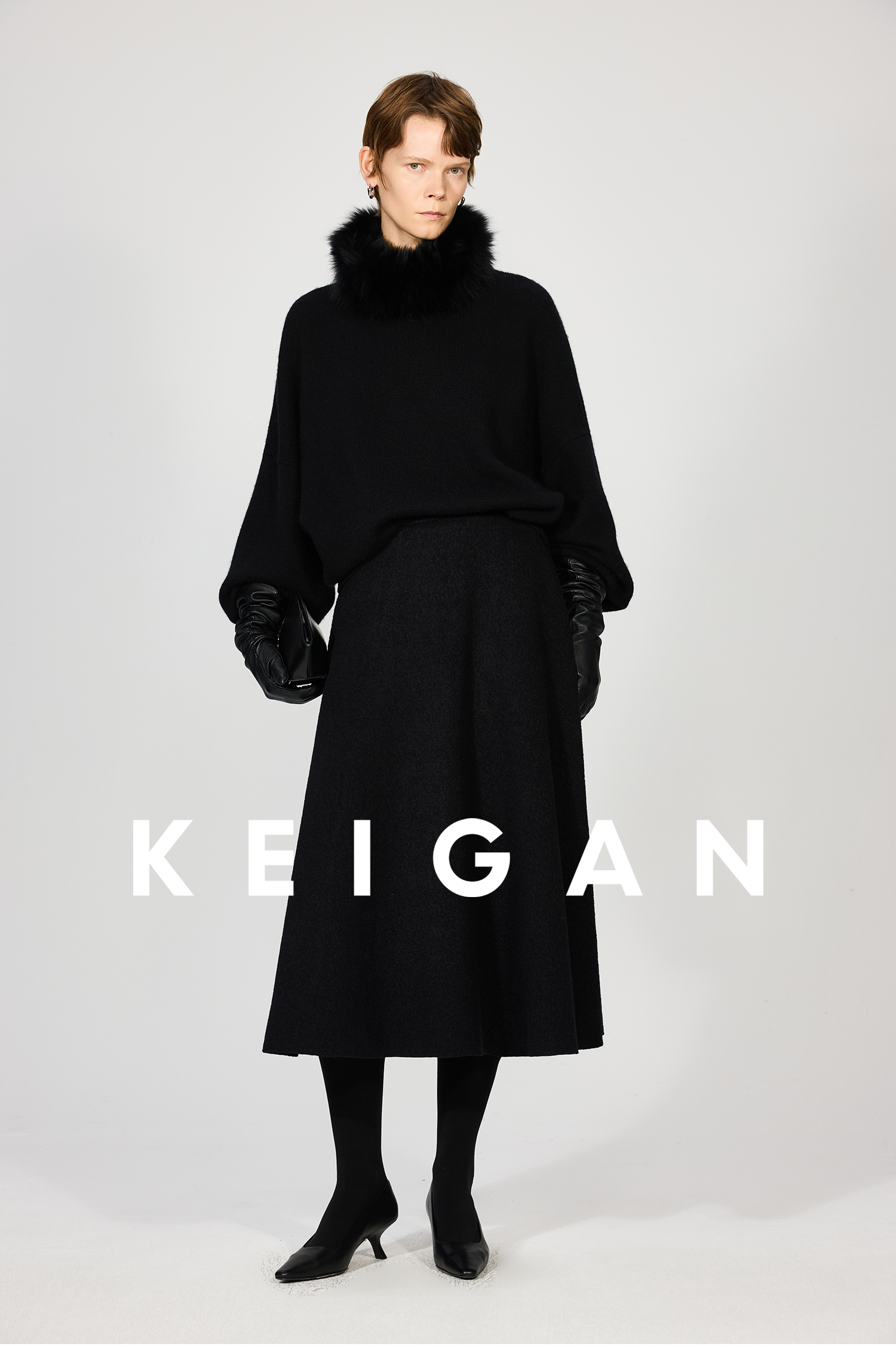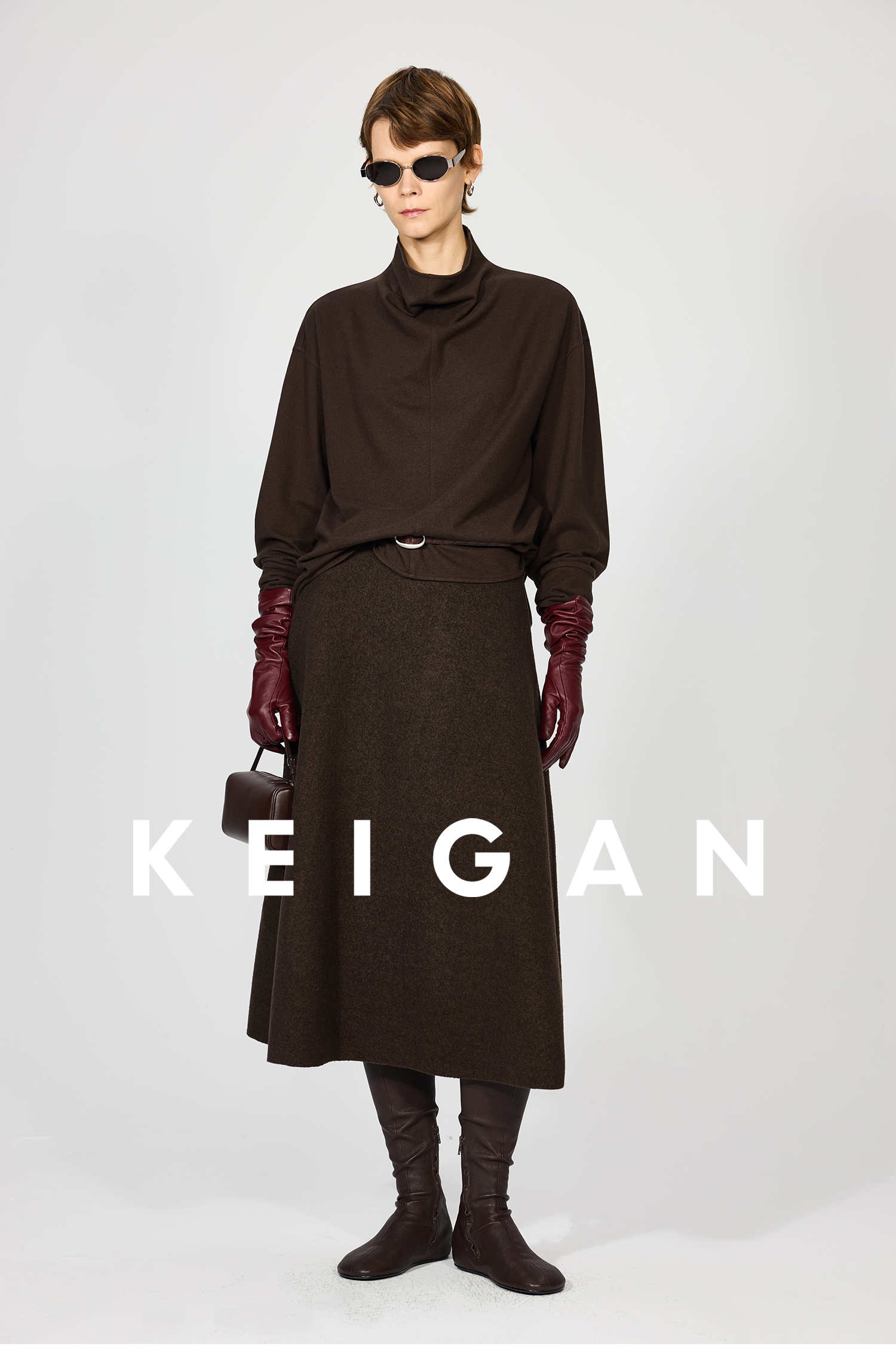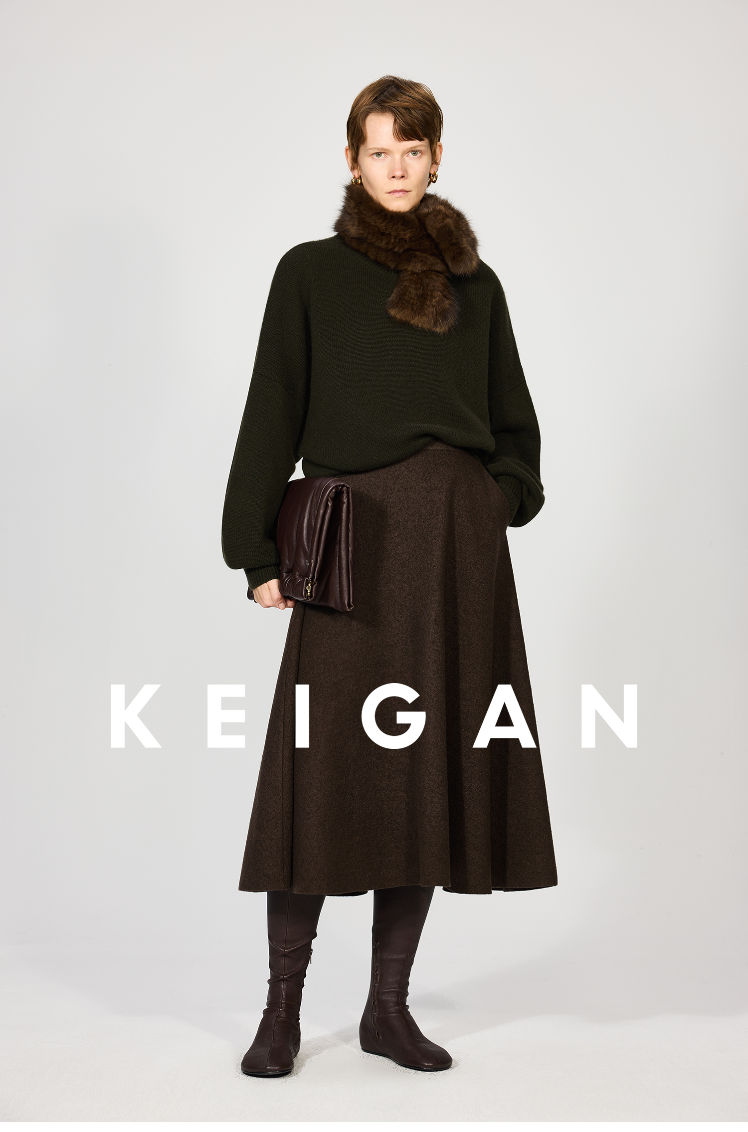 Open-Front/Australian Mixed-Color Looped Wool Merino Knit Wool Classic Elegant Silk Waist A-Line Skirt
