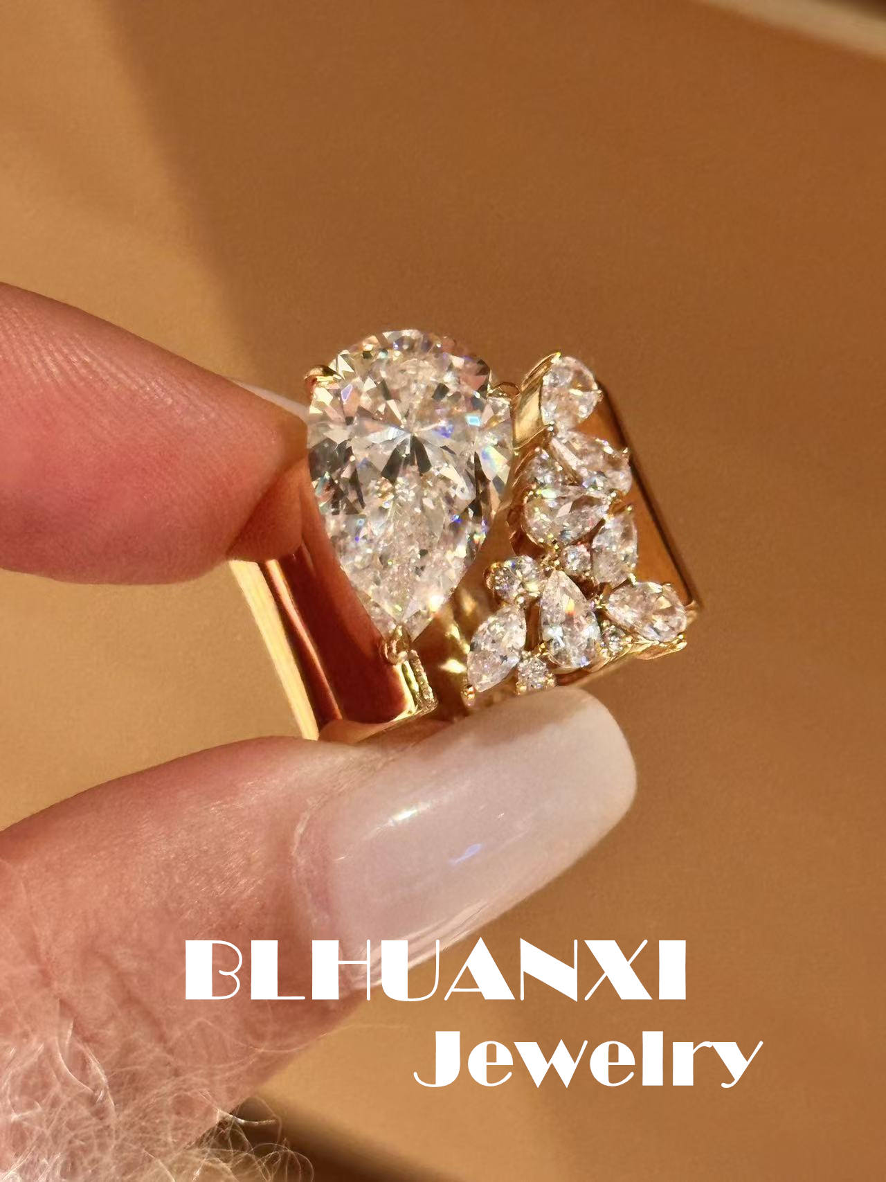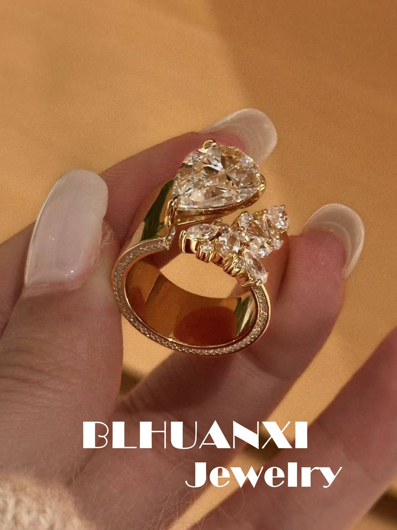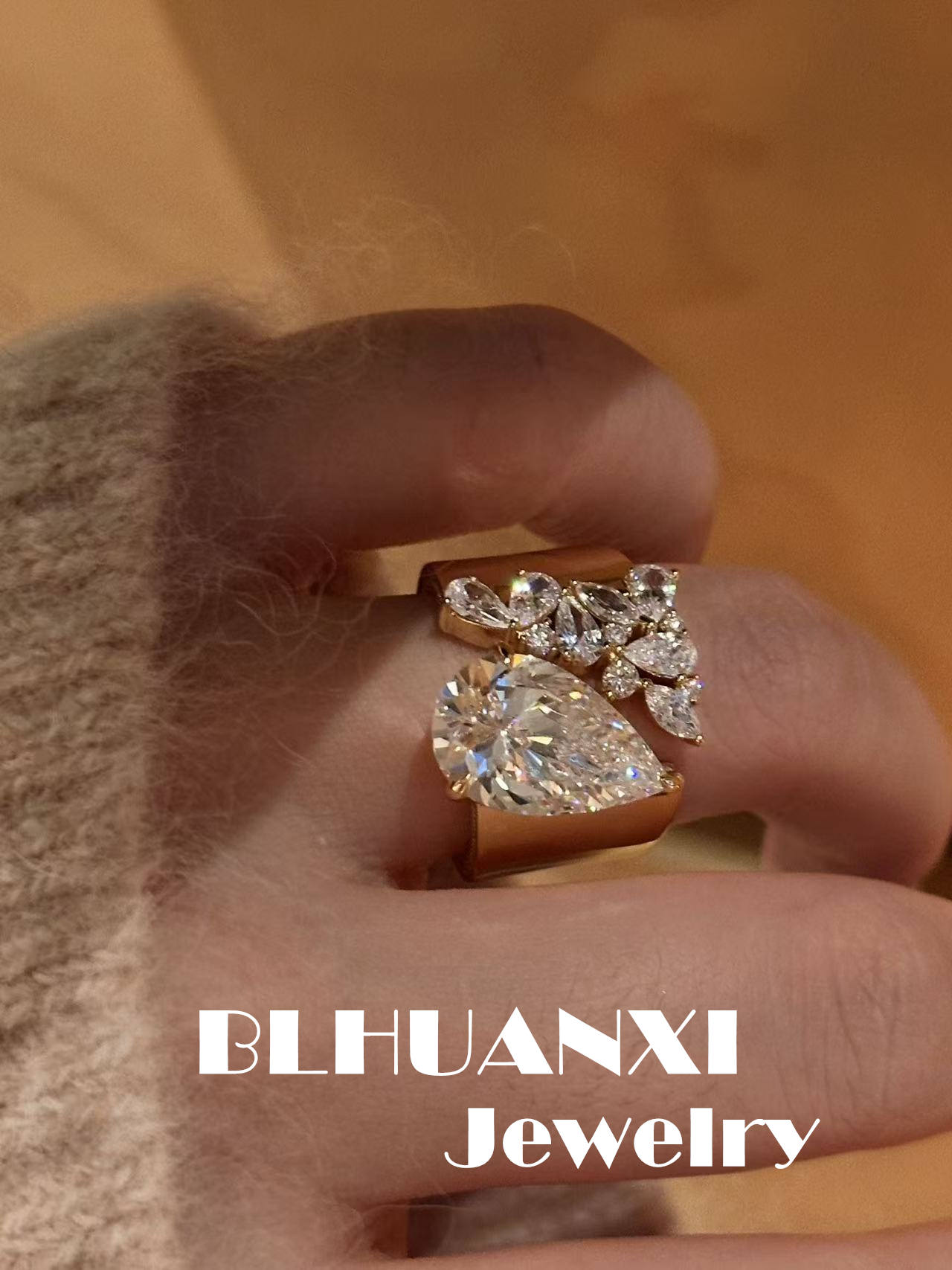 【Look for Joy】925 Silver Gold-Plated Vintage Style Wide Face Large Teardrop Heavy-Duty Hand-Set Diamond Ring