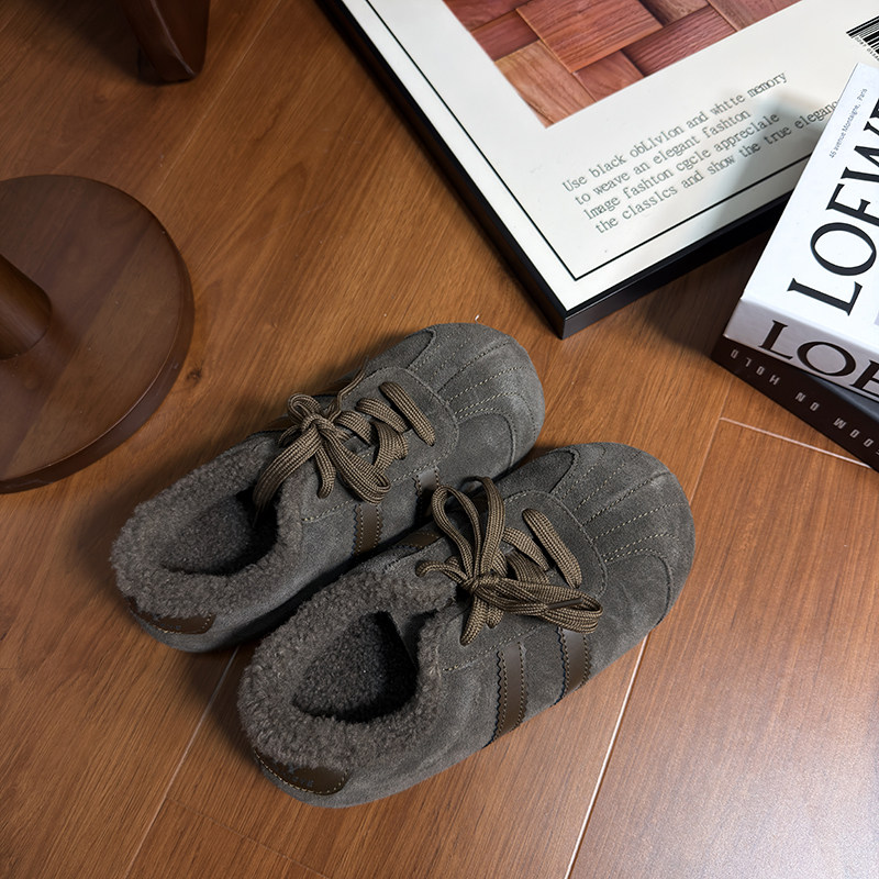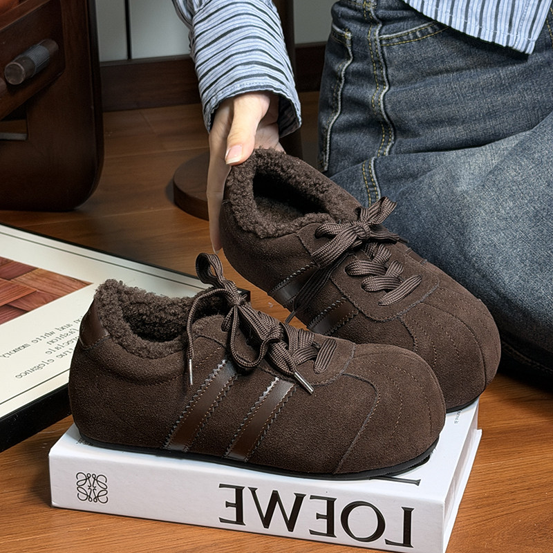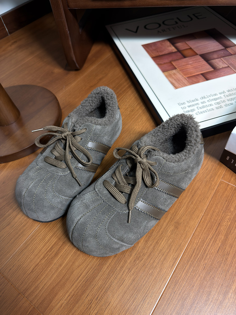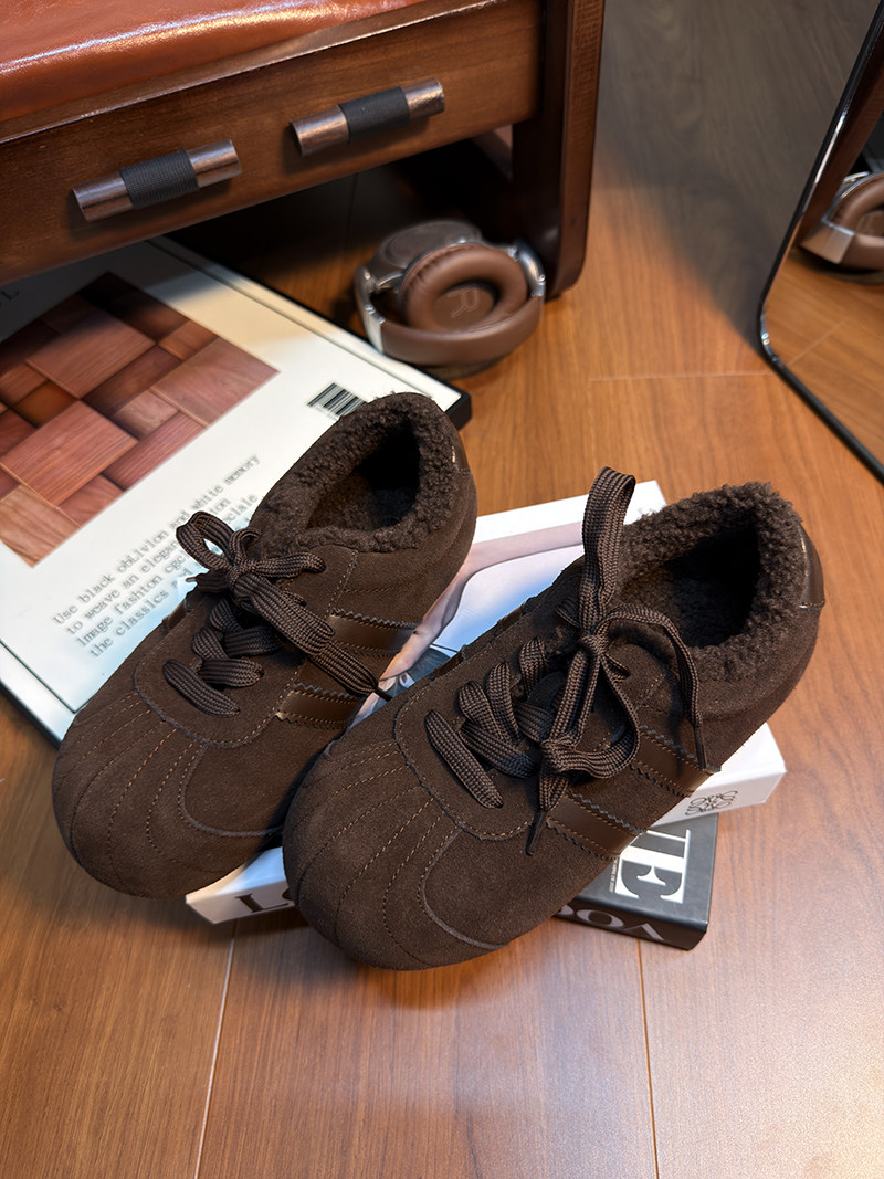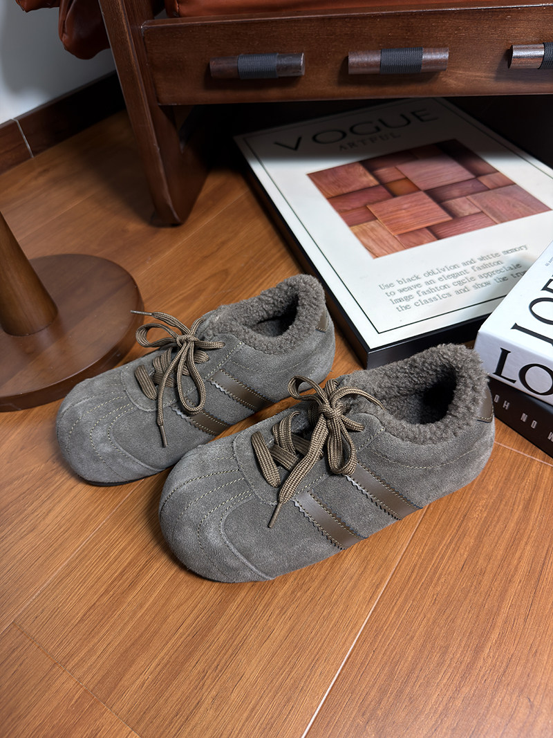 Hong Kong Genuine Leather Lace-Up Large-Toe Furry Shoes for Women 2025 Autumn and Winter New Style Fleece-Lined Casual Shoes German Training Shoes Flat Cotton Shoes
